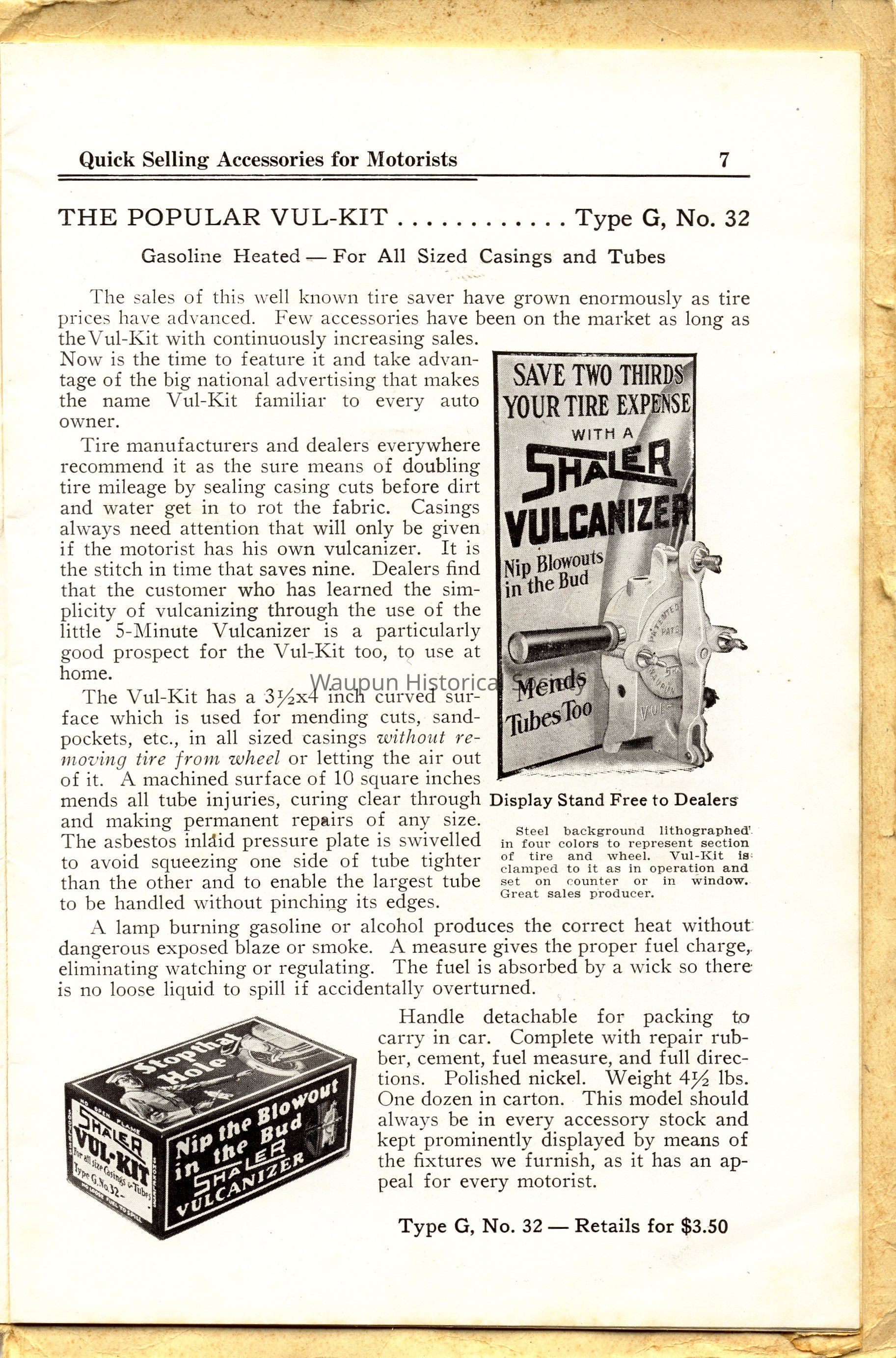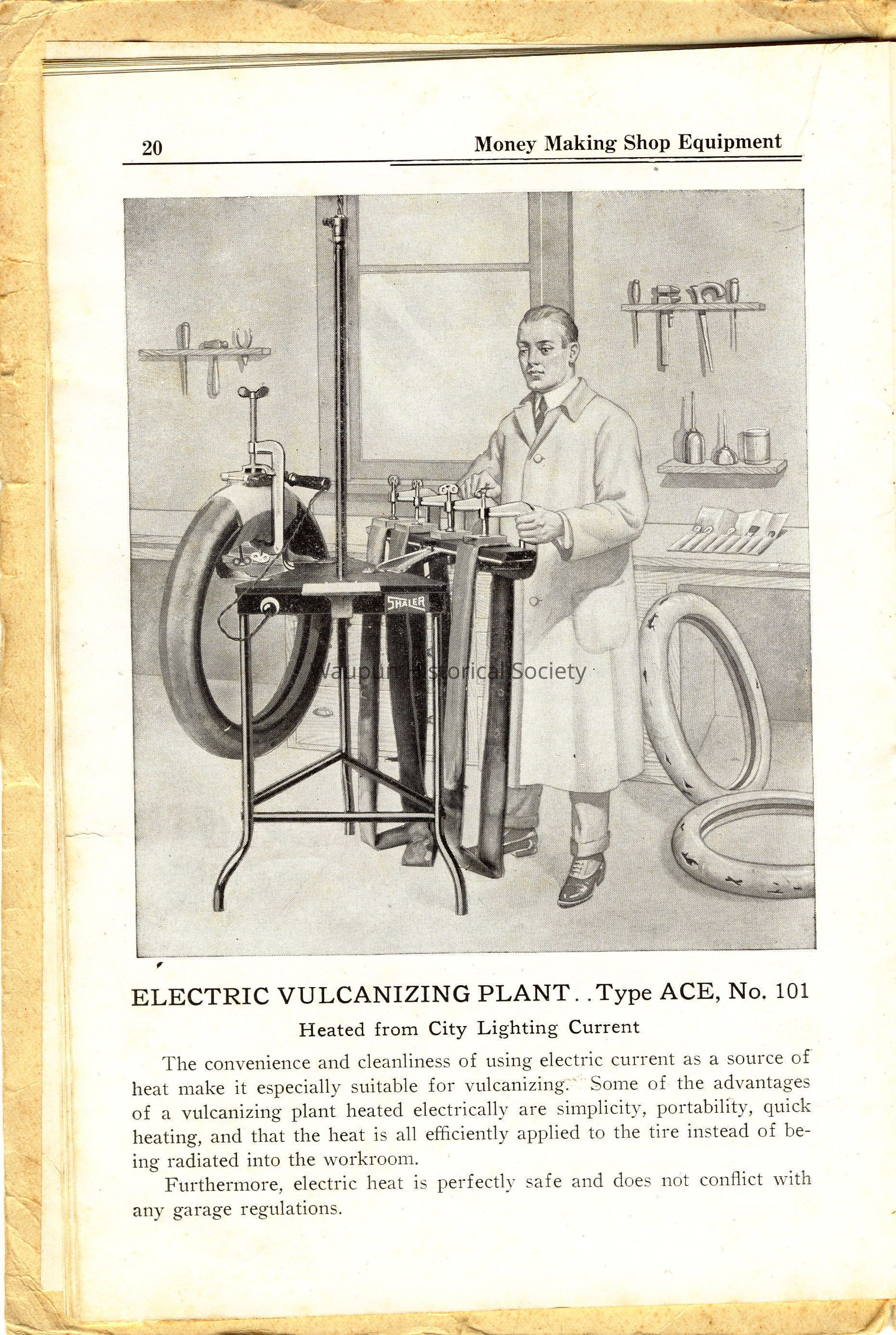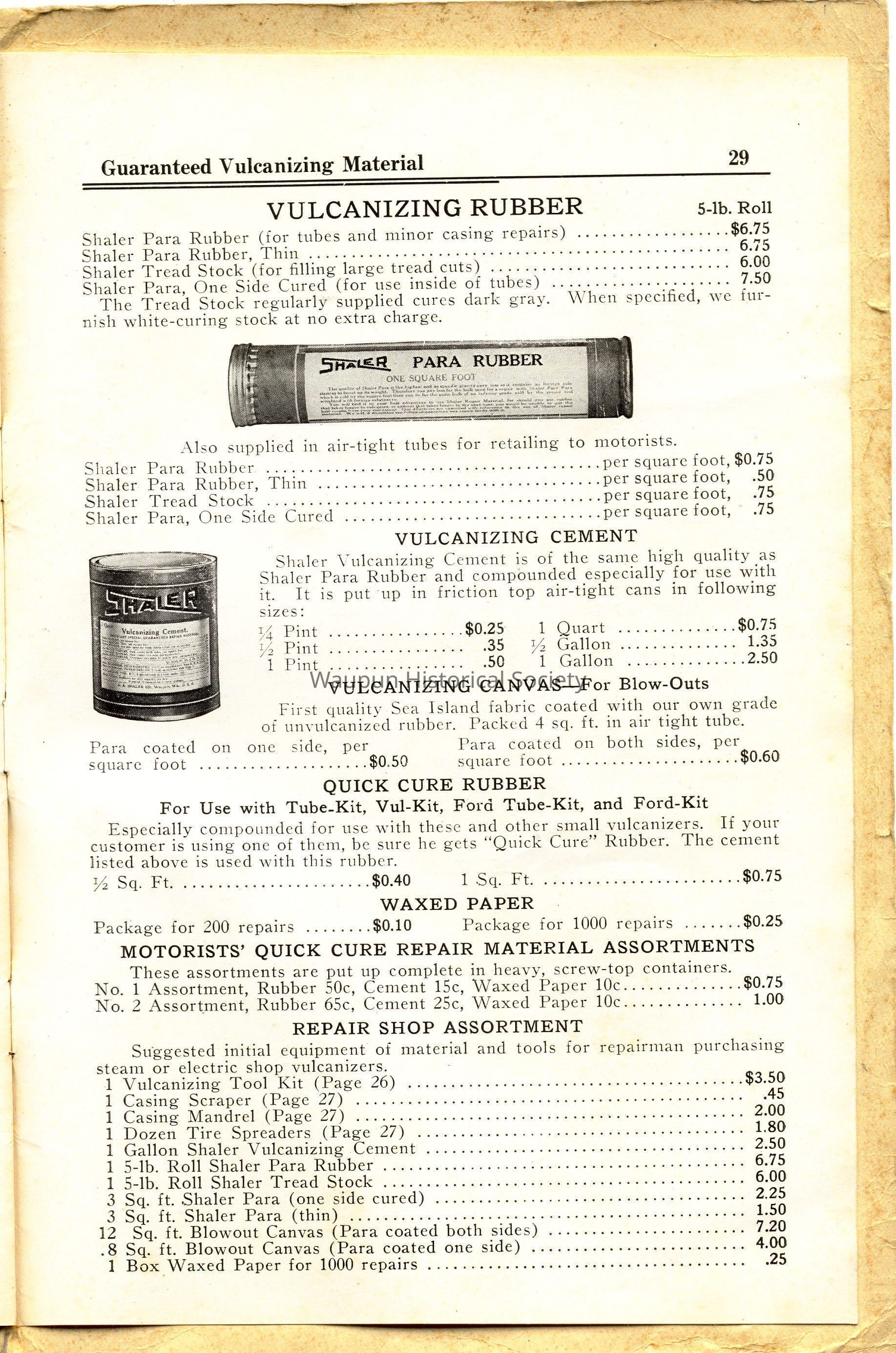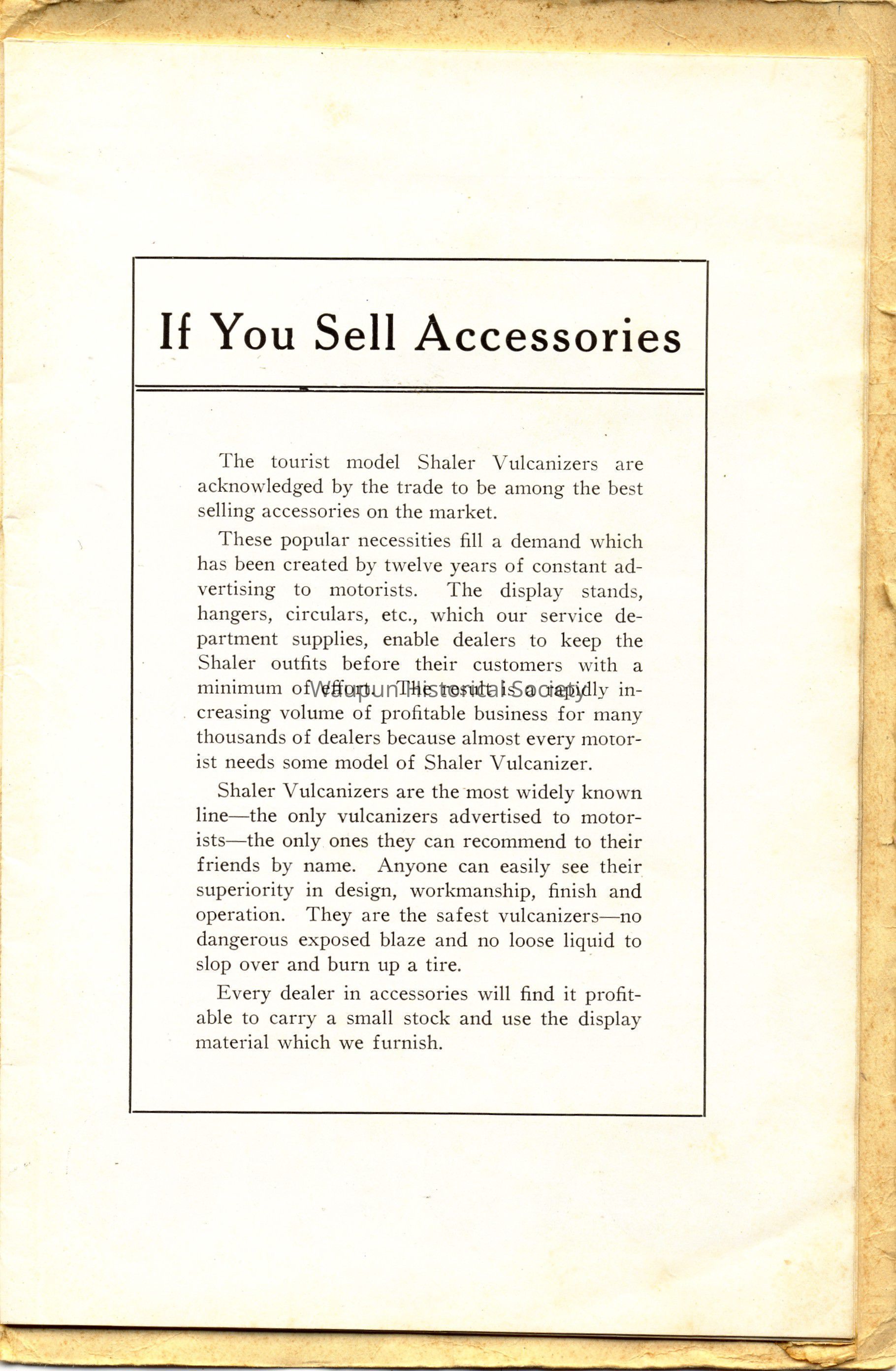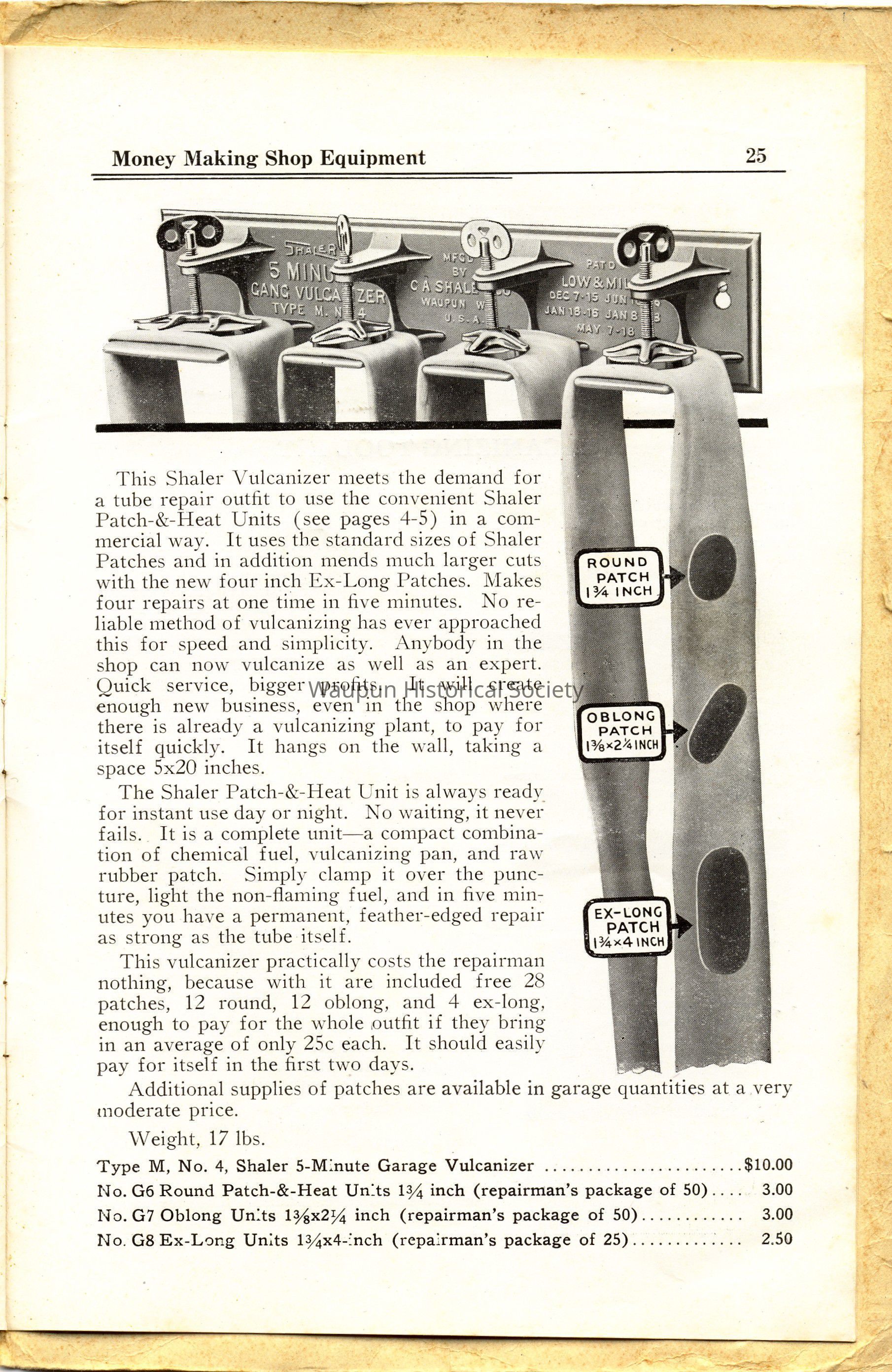 Few garages are without at least one of our machines. Many hundreds of thousands of motorists are using them successfully. The U. S. Government as well as many foreign governments have set their seal of approval upon them by repeated purchases for various departments. Practically every auto accessory jobber catalogs and recommends Shaler Vulcanizers. In short, the Shaler line is accepted as standard by everyone connected with the automobile industry.