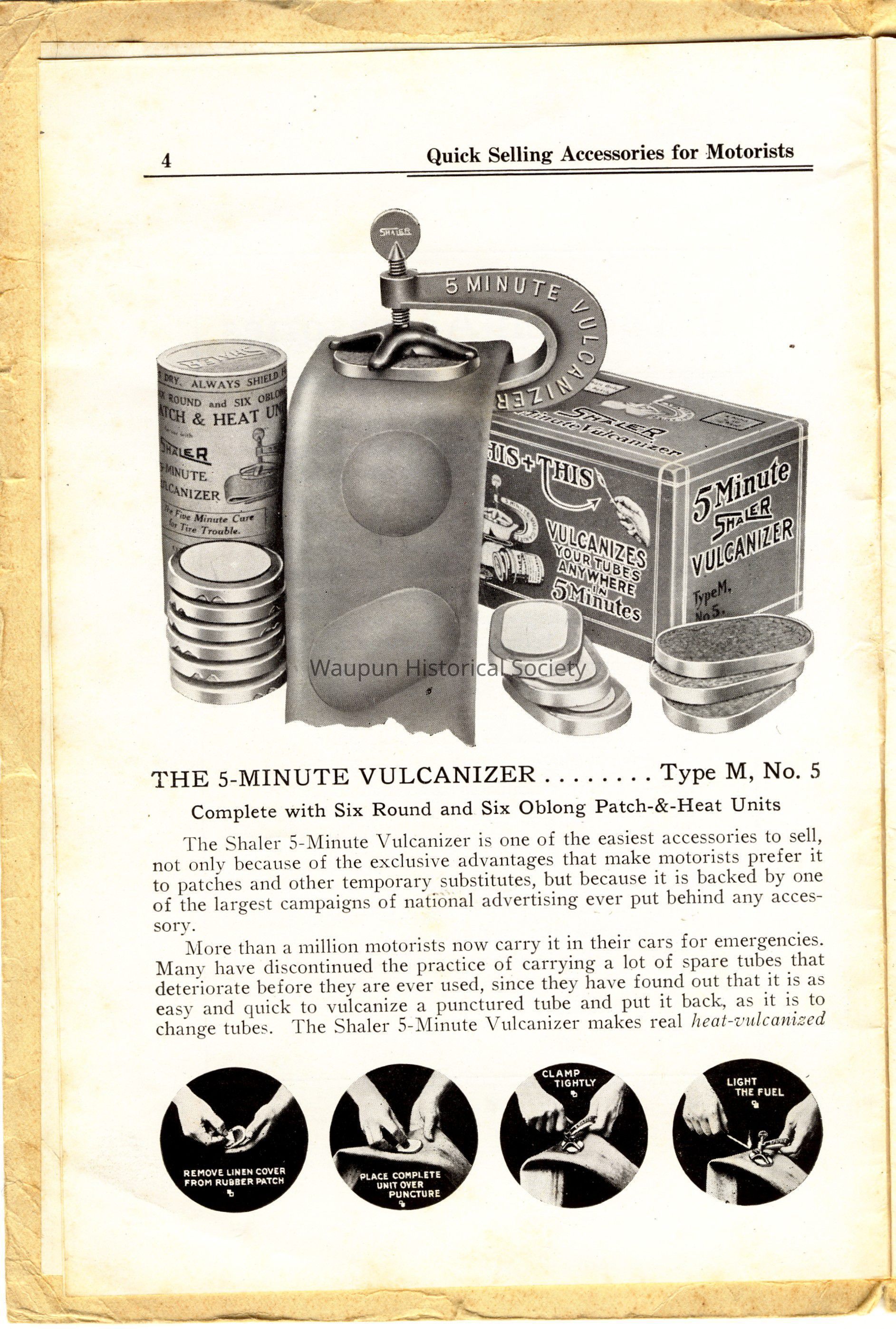 More than a million motorists now carry it in their cars for emergencies. Many have discontinued the practice of carrying a lot of spare tubes that deteriorate before they are ever used, since they have found out that it is as easy and quick to vulcanize a punctured tube and put it back, as it is to change tubes. The Shaler 5-Minute Vulcanizer makes real heat-vulcanized