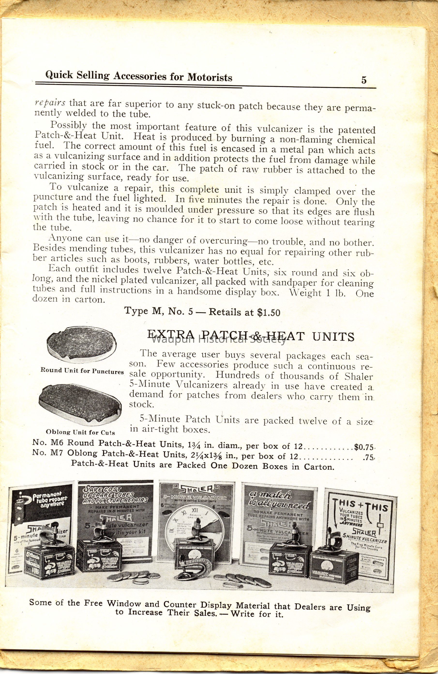 The average user buys several packages each season. Few accessories produce such a continuous resale opportunity. Hundreds of thousands of Shaler 5-Minute Vulcanizers already in use have created a demand for patches from dealers who carry them in stock.