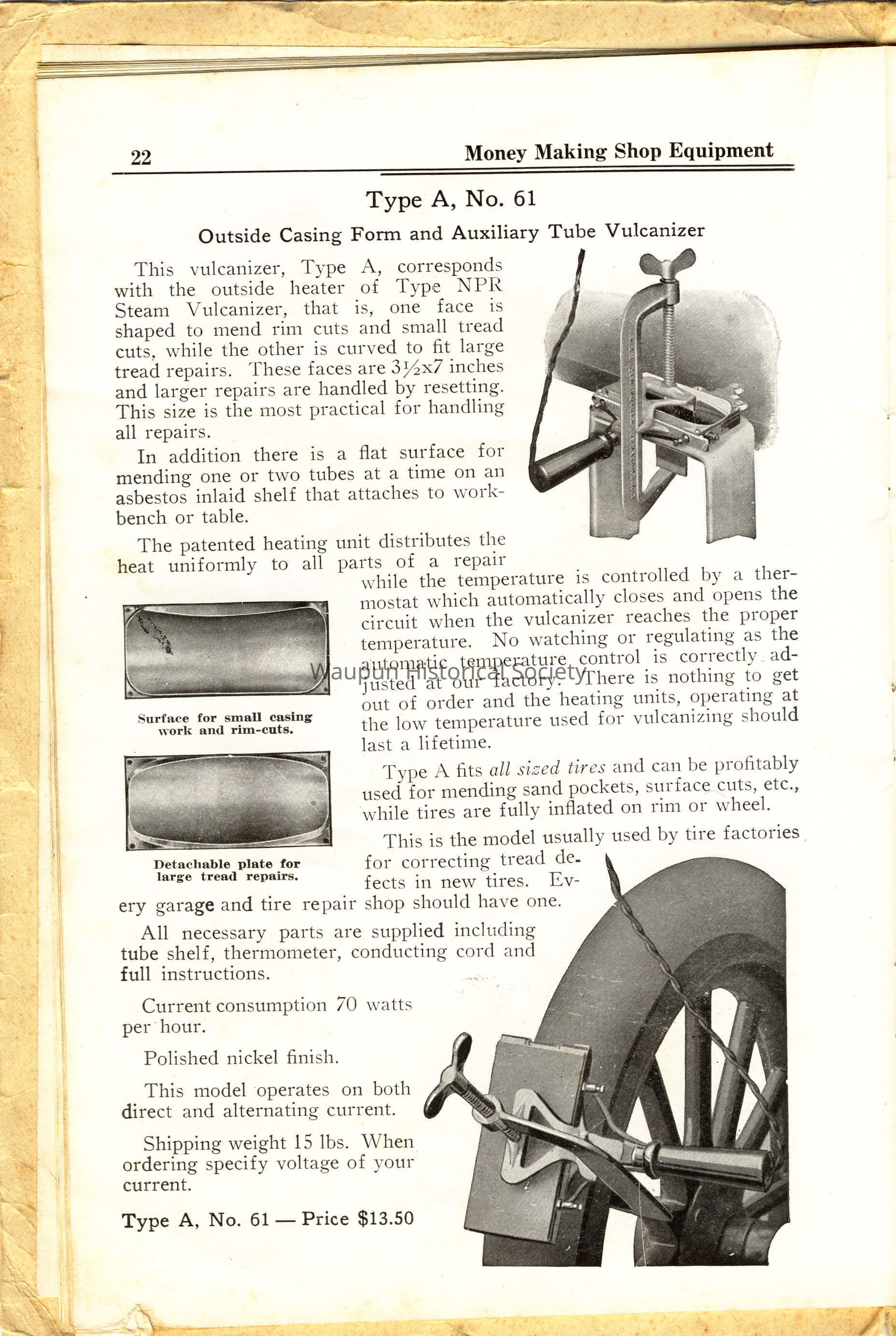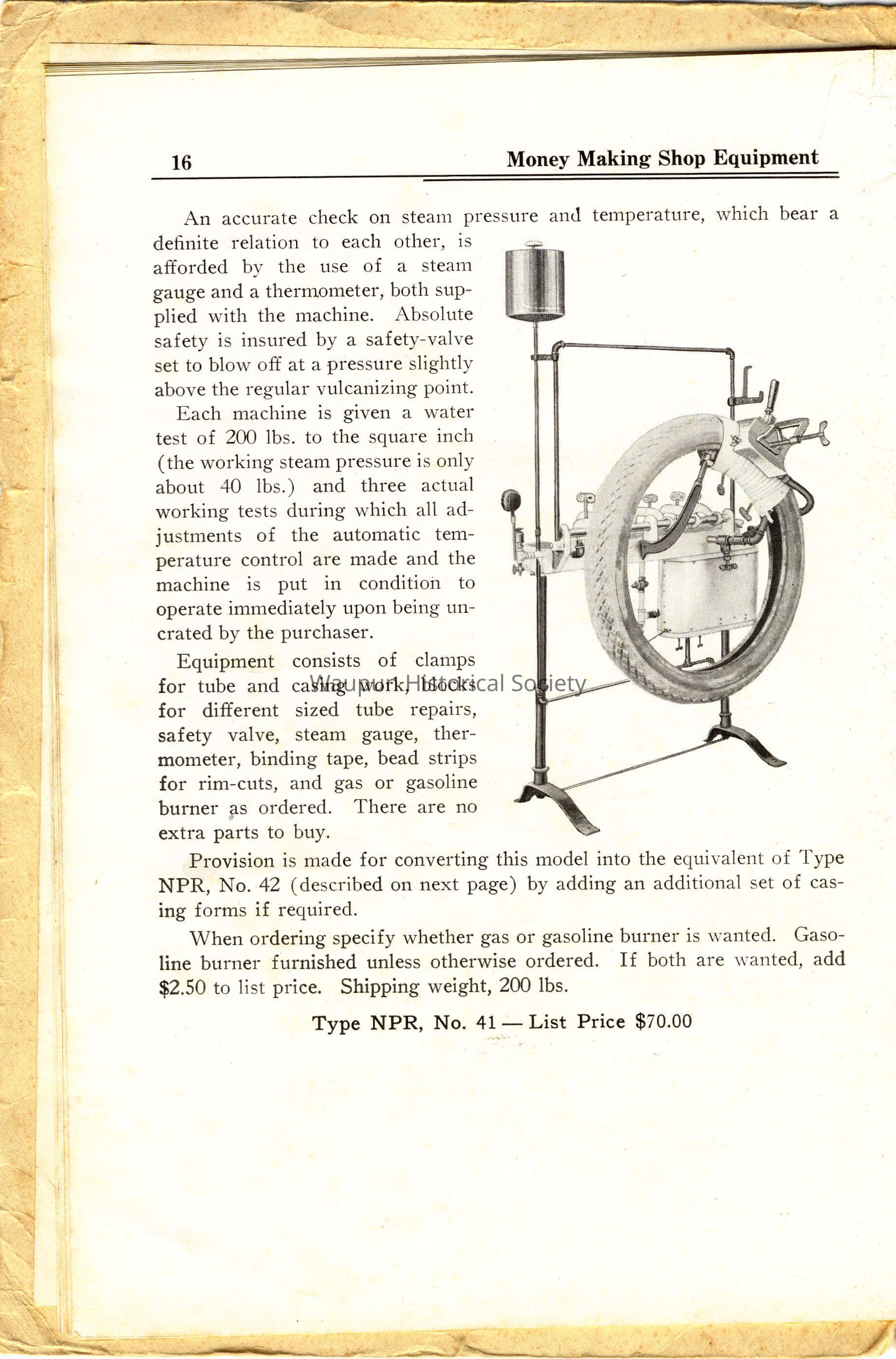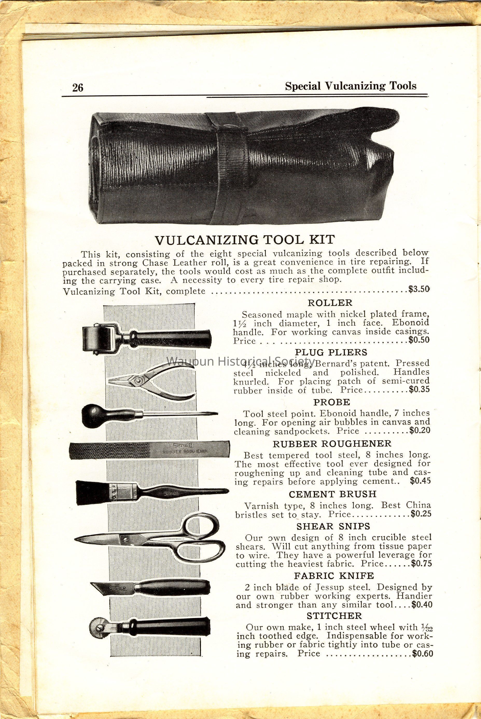 Equipment consists of clamps for tube and casing work, blocks for different sized tube repairs, safety valve, steam gauge, thermometer, binding tape, bead strips for rim-cuts, and gas or gasoline burner as ordered. There are no extra parts to buy.