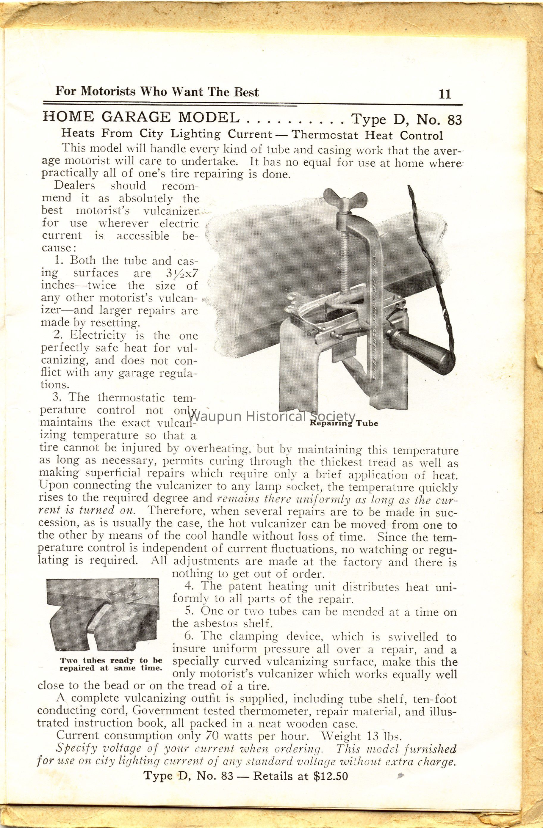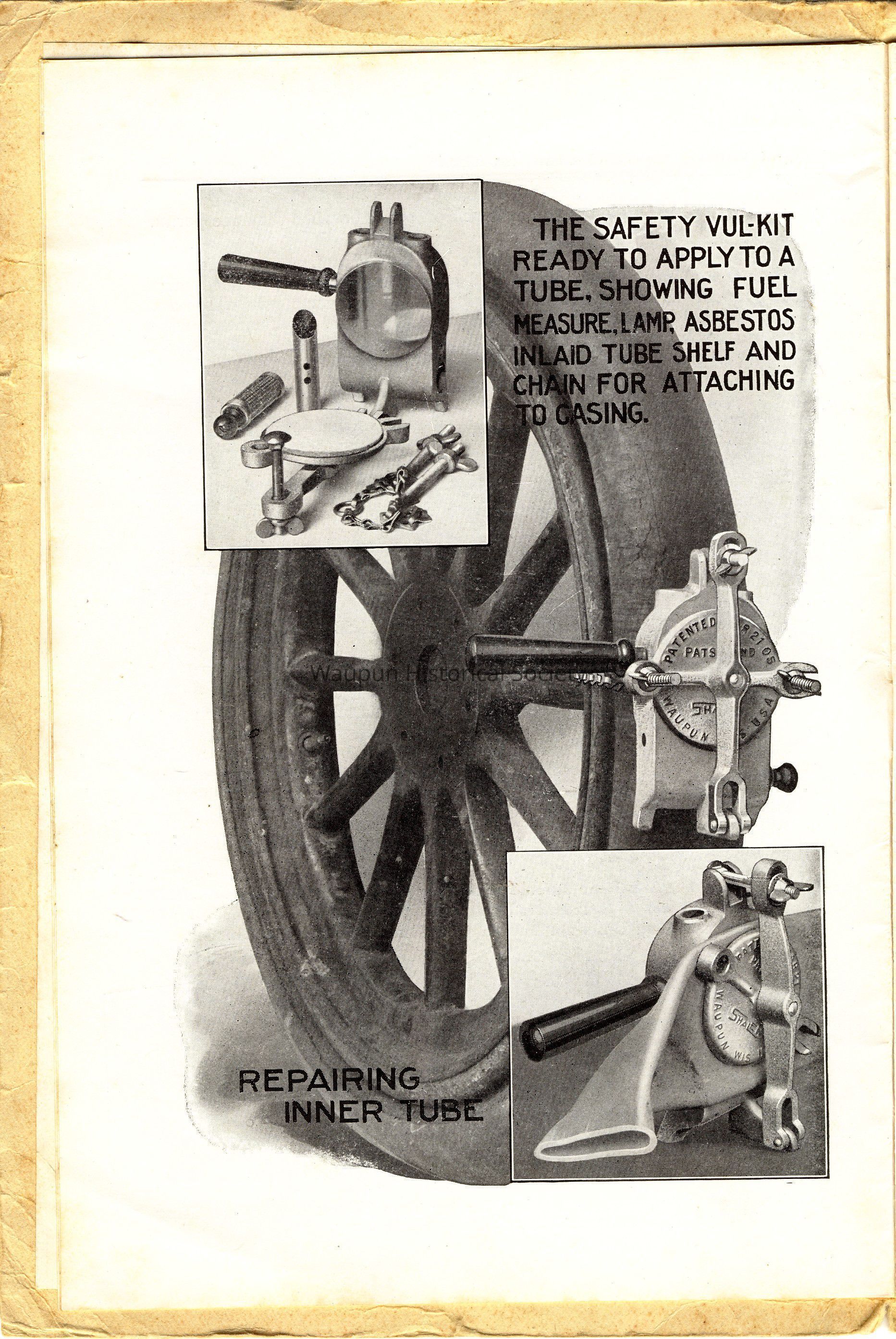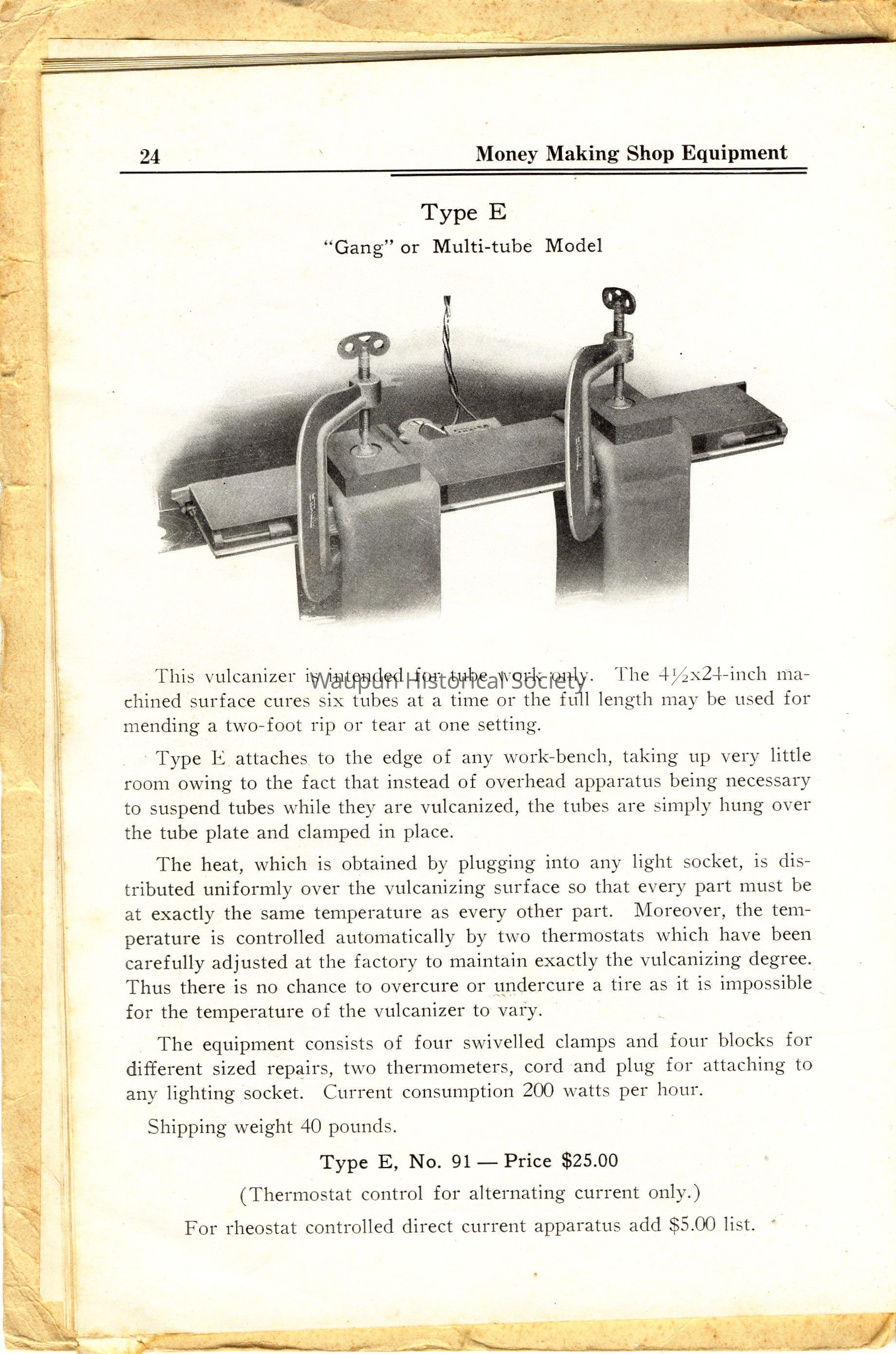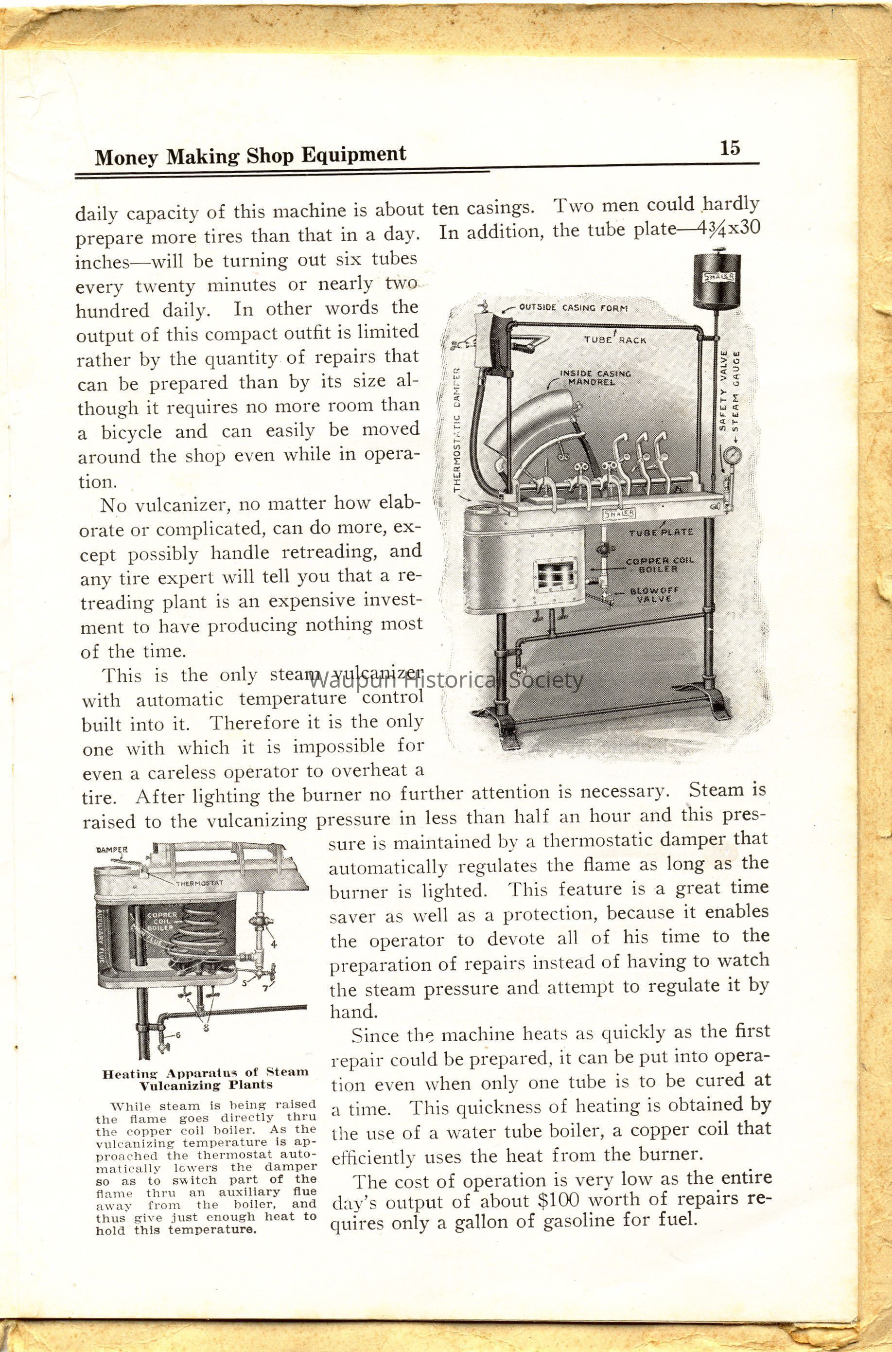 Equipment consists of clamps for tube and casing work, blocks for different sized tube repairs, safety valve, steam gauge, thermometer, binding tape, bead strips for rim-cuts, and gas or gasoline burner as ordered. There are no extra parts to buy.