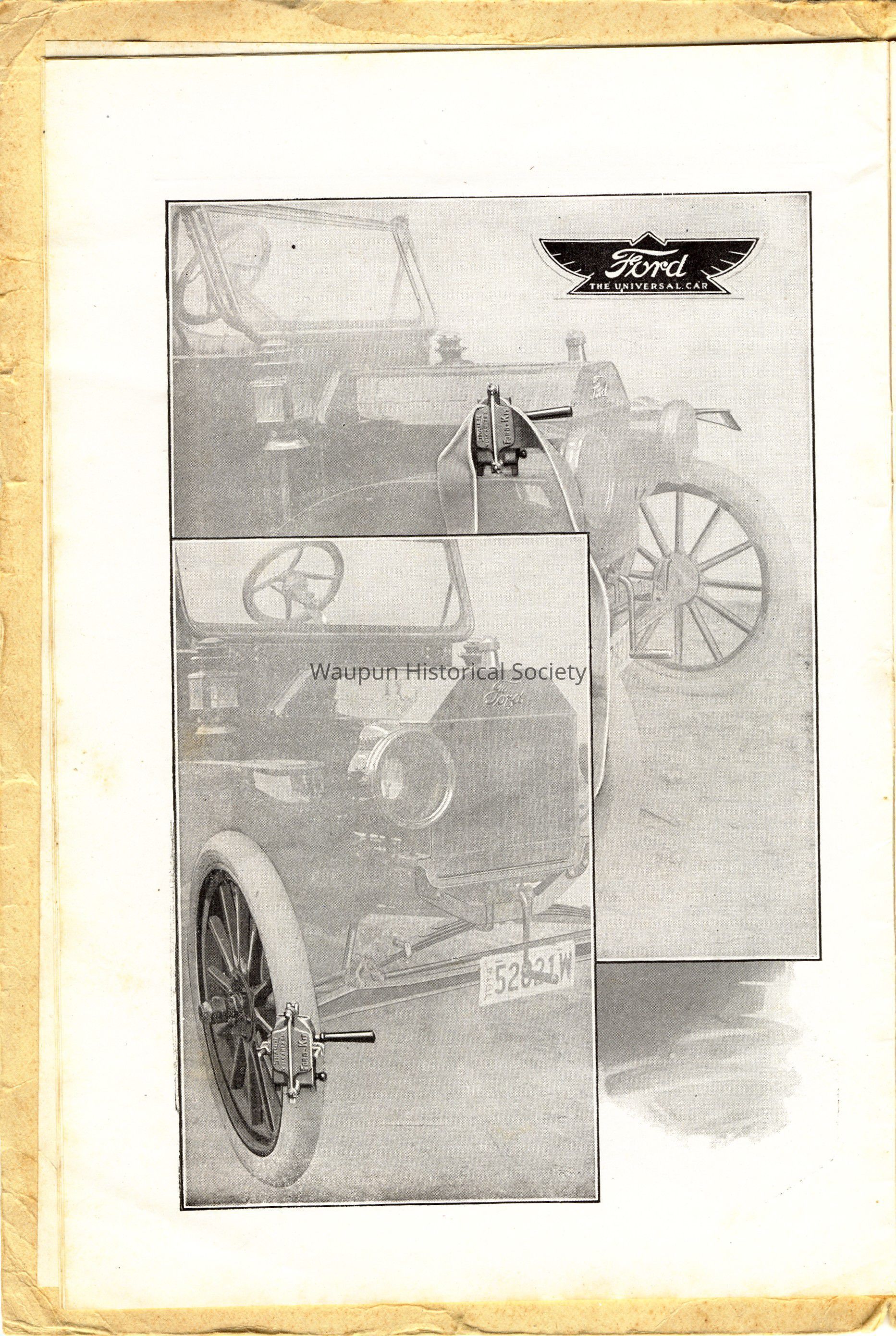 Caption under photo; [Silent Salesman Free Steel background lithographed in four colors to represent section of tire on wheel. Ford-Kit is clamped to it as if in operation.]