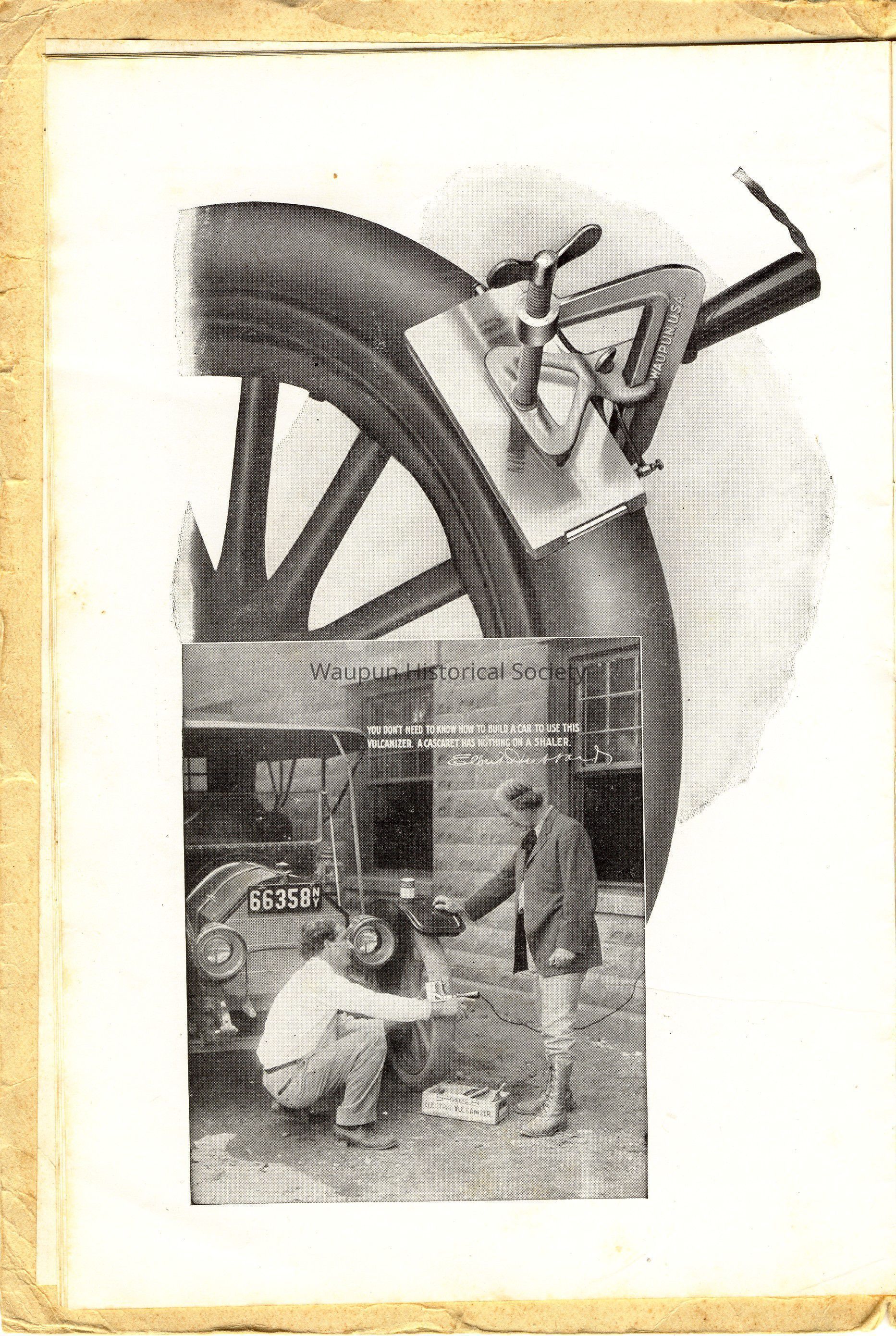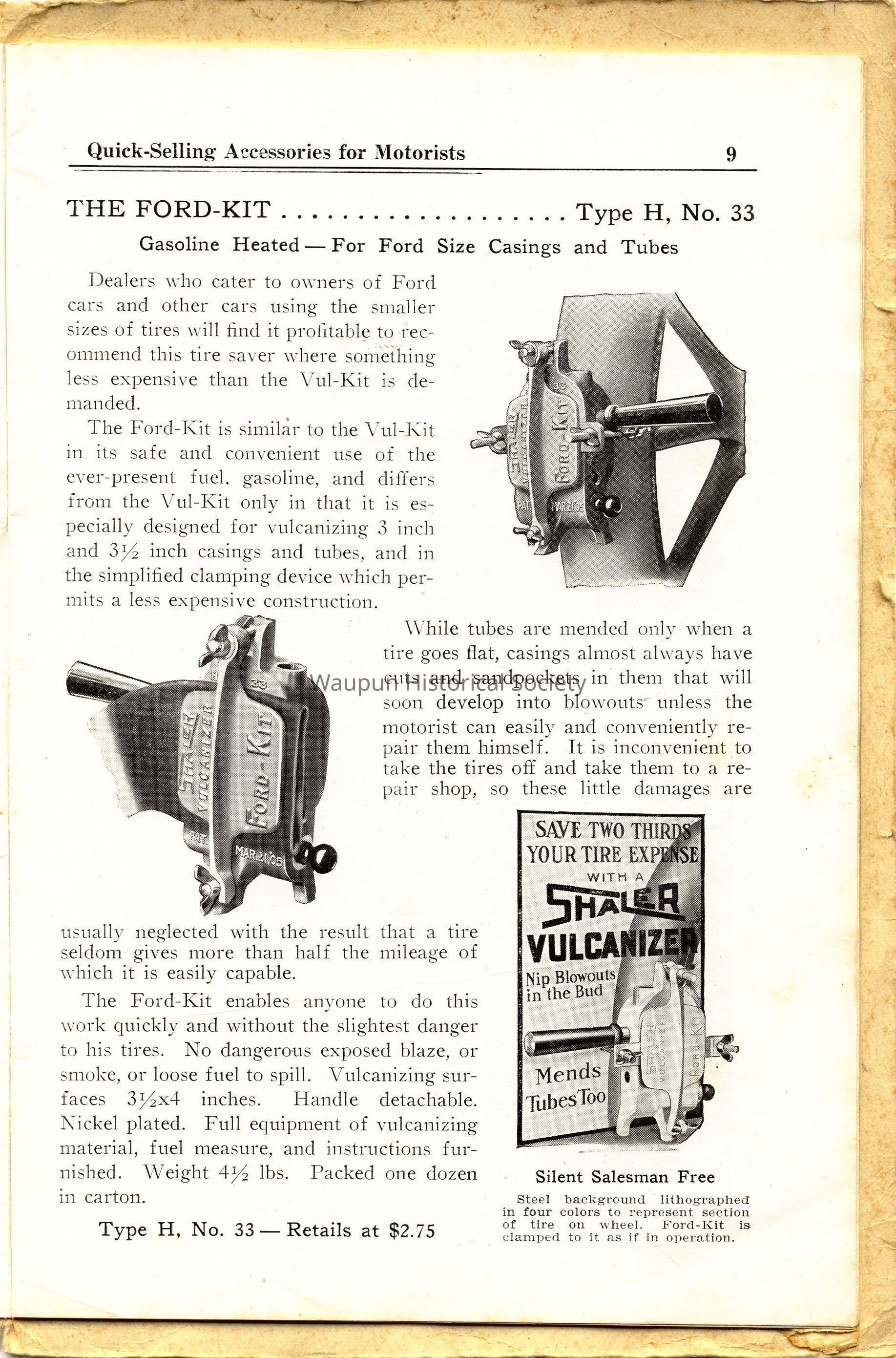 Caption in photo; [SAVE TWO THIRDS YOUR TIRE EXPENSE with a SHALER VULCANIZER Nip Blowouts in the Bud Mends Tubes Too]