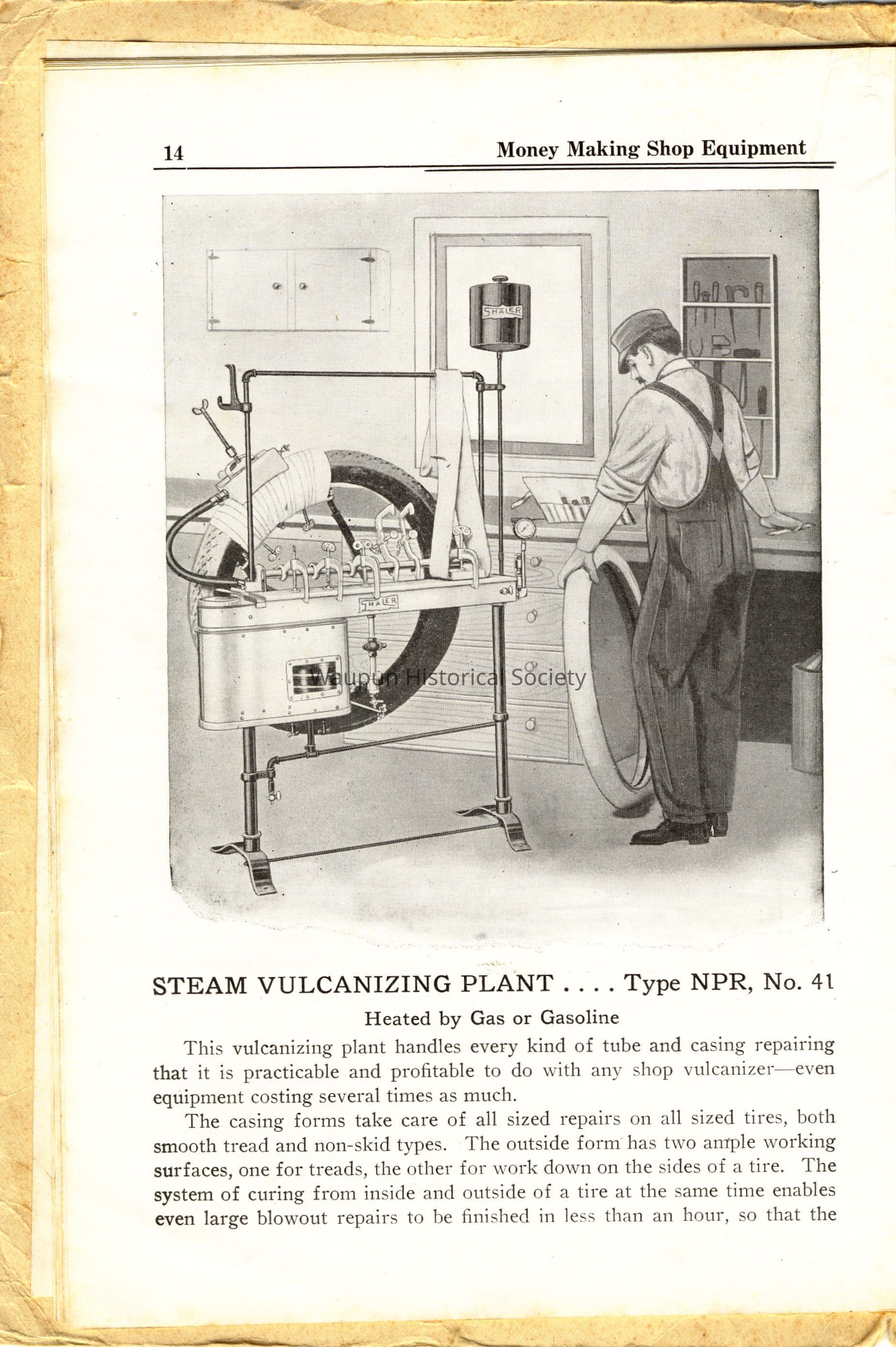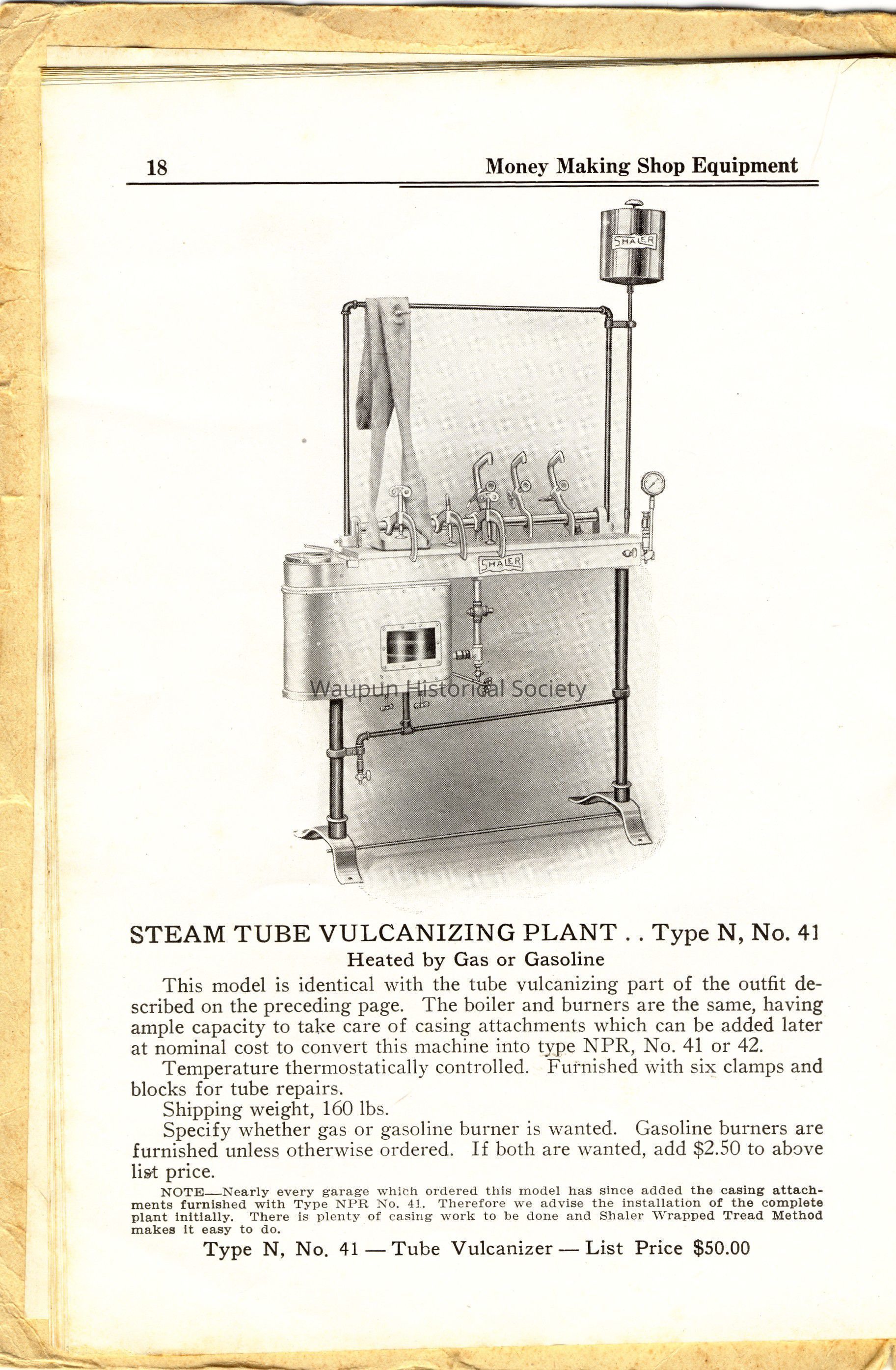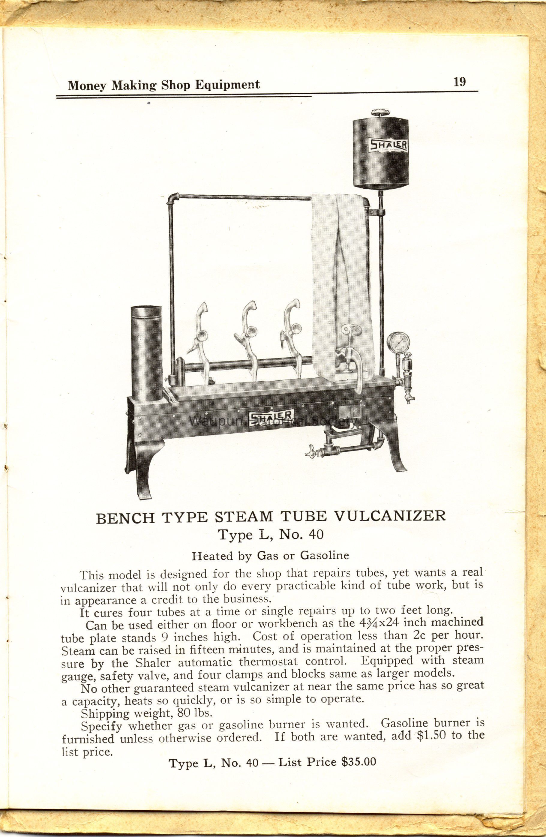 On the following pages you will find descriptions of the various types of Shaler Vulcanizers for all requirements of the repair shop or garage. Some of these machines are heated by steam, some by electricity; the purchaser may choose to suit his convenience. Both styles have the exclusive features that have made Shaler Vulcanizers the equipment of more than thirty thousand repair shops in the United States alone - automatic temperature control, and the use of the efficient Shaler Wrapped Tread Method for casings instead of the sectional method which some repairmen still use.