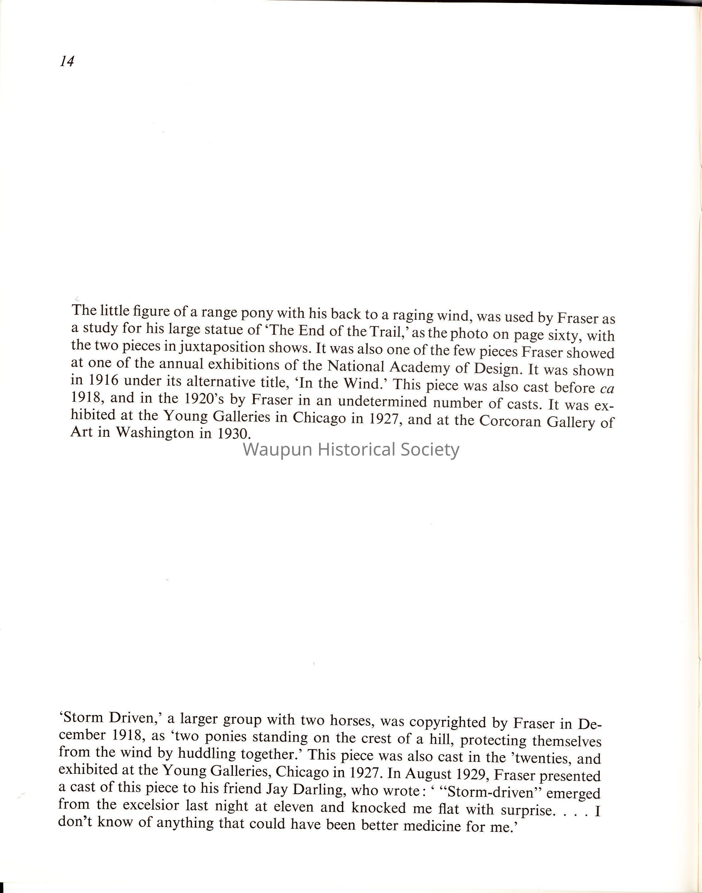 `Storm Driven,' a larger group with two horses, was copyrighted by Fraser in December 1918, as 'two ponies standing on the crest of a hill, protecting themselves from the wind by huddling together.' This piece was also cast in the 'twenties, and exhibited at the Young Galleries, Chicago in 1927. In August 1929, Fraser presented a cast of this piece to his friend Jay Darling, who wrote: "Storm-driven" emerged from the excelsior last night at eleven and knocked me flat with surprise. . . . I don't know of anything that could have been better medicine for me.'