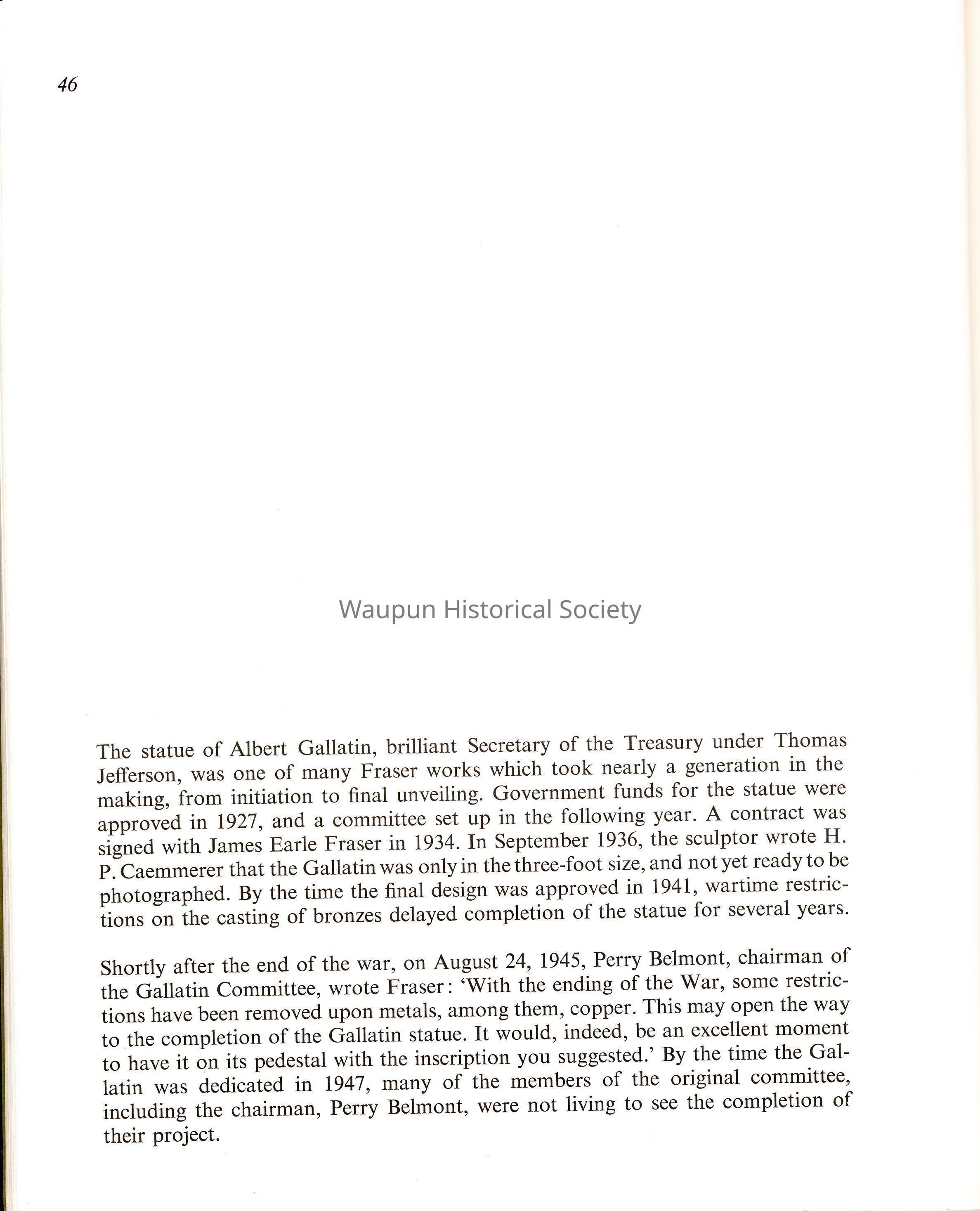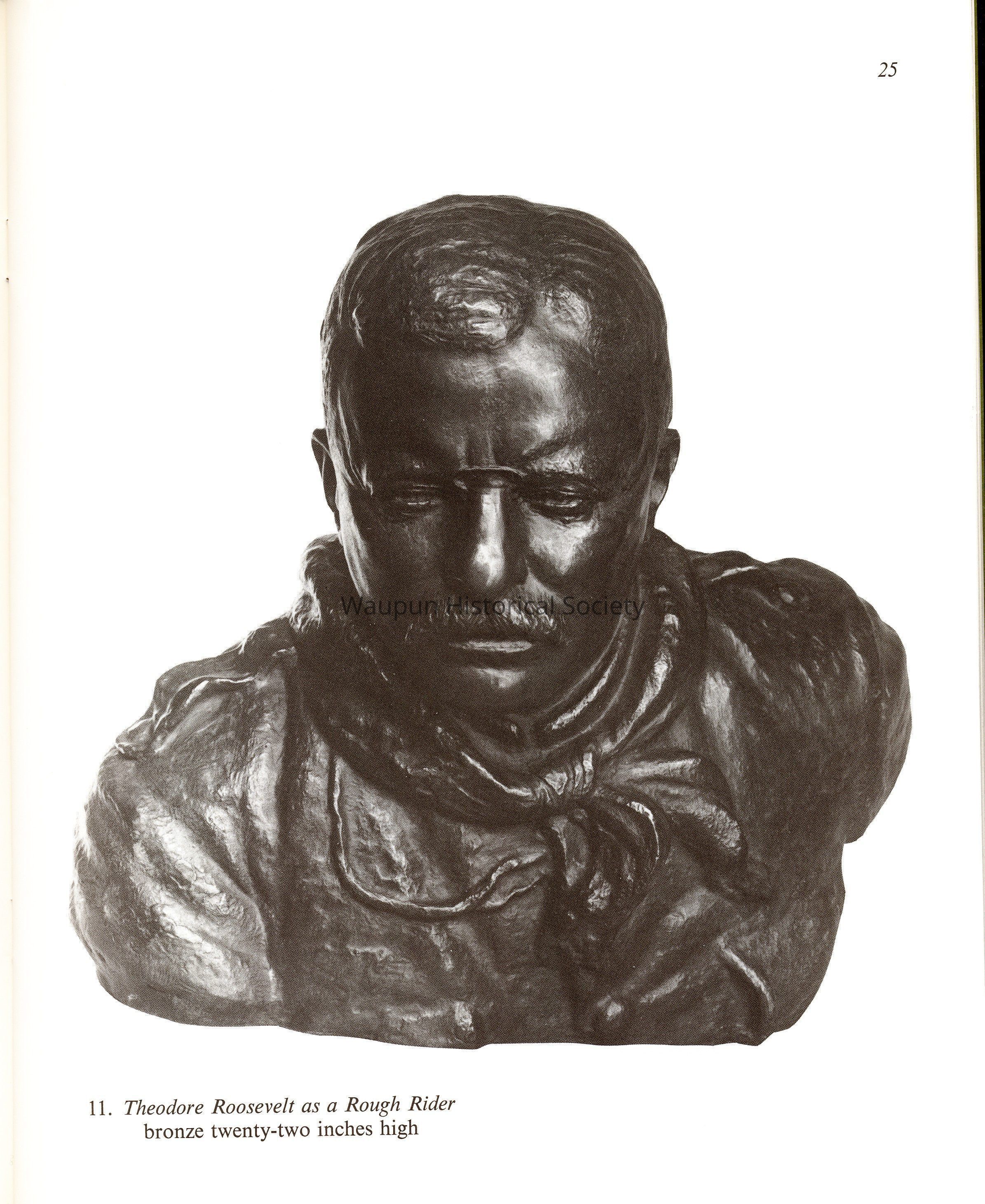 For the Pacific Panama Exposition of 1915, the original small 'End of the Trail' was enlarged to heroic size, and placed in the Court of Palms. After the Exposition, plans were made for casting the statue in bronze and placing it on the Pacific Palisades. Various difficulties, among them the United States entry into the first World War, prevented the achievement of these plans, and the piece went into a 'graveyard' with other sculptural works from the Exposition. It was later purchased for $400., and placed in a park at Visalia, California. (This original stucco piece was purchased within the last couple of years by the Cowboy Hall of Fame, Oklahoma City, Oklahoma, where it is now on exhibit.) A large casting of this statue in bronze was presented to the town of Waupan, (Waupun) Wisconsin by Clarence Shaler, Esquire; it was unveiled in Shaler Park, in 1929. At the time of its unveiling, information was given that the statue was posed for by Seneca chief John Big Tree, in the summer of 1912 at Coney Island. For the horse, as the photograph of page fifty-nine shows, Fraser adapted the small bronze 'Windswept,' or 'In the Wind.' Examples of bronzes of this figure cast during the sculptor's lifetime are found in the Metropolitan Museum, New York, the Detroit Institute of Arts, the City Art Museum of Saint Louis, Brookgreen Gardens, and a small number of private collections.
