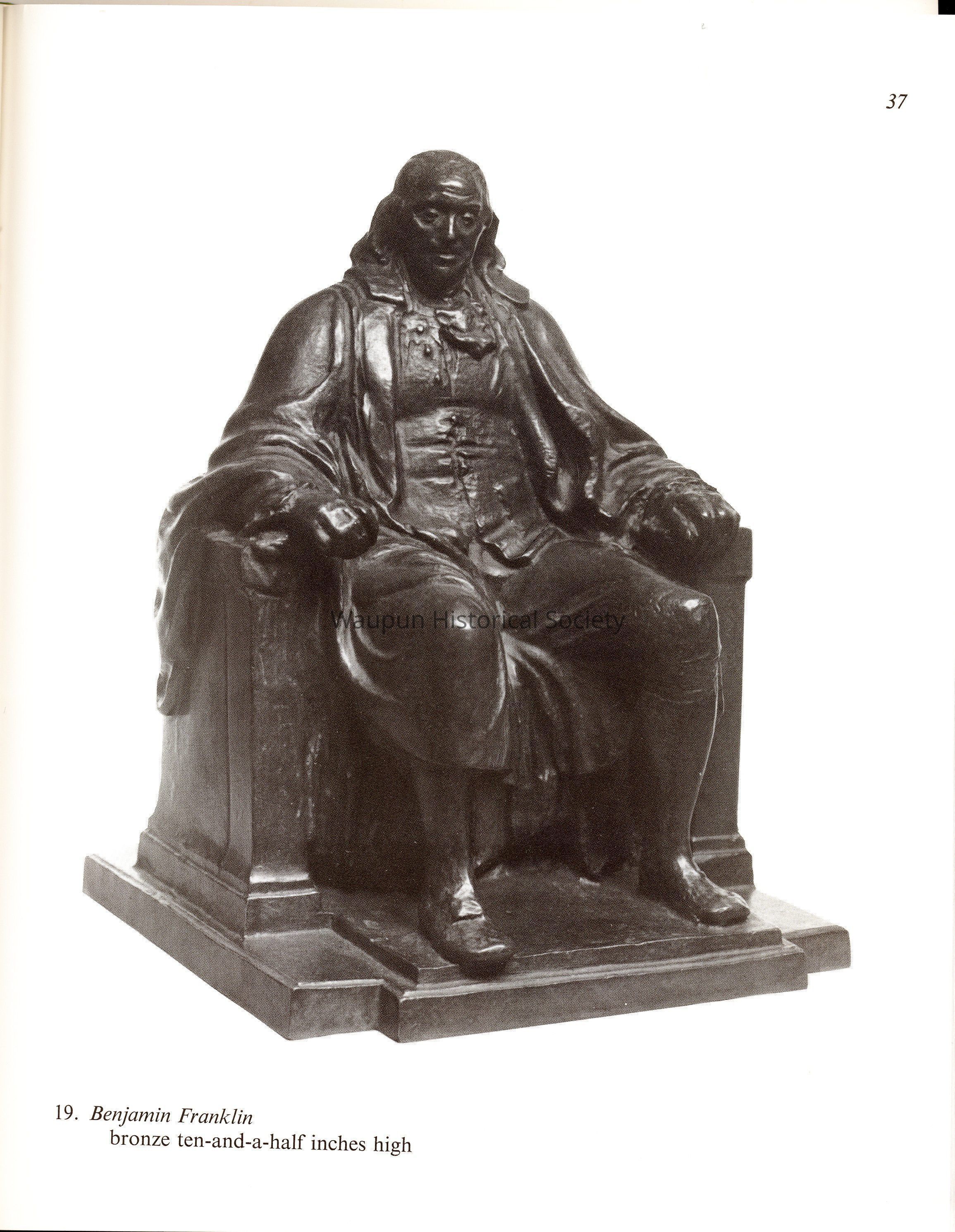 The rate of commissions continued into the thirties. Fraser designed pediments for the Archives and the Commerce buildings in Washington D. C. Two large figures by him were placed in front of both the Archives and the Supreme Court Buildings. The 'Second Division Memorial', called also the 'Mons Sector Memorial,' was dedicated in 1936. A large marble Franklin for the Franklin Institute in Philadelphia, and a portrait of Thomas Edison for the Edison Institute, Dearborn, Michigan were other works of this period. In 1938, Fraser modeled his second bust of a vice president for the Senate Chamber, this one of John Nance Garner. For the 1939 New York World's Fair, he designed a colossal sixty-five foot figure of George Washington. A bust of Washington and a plaque of an Indian also by Fraser decorated the State Reception Room at the Fair. Work on the New York State Memorial for Theodore Roosevelt at the American Museum of Natural History occupied him for much of the decade. It was finally dedicated in 1940.