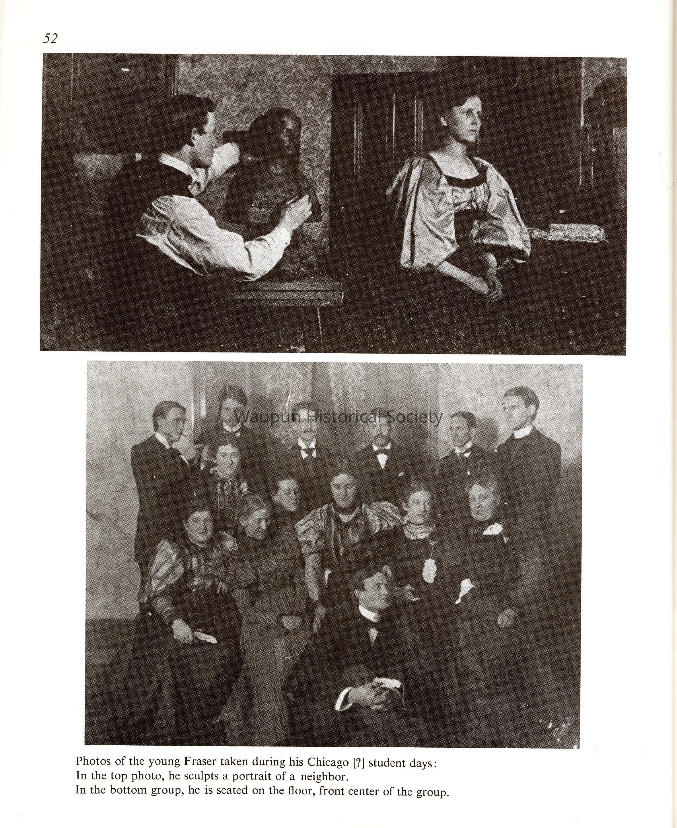 Fraser began his studies at the Art Institute of Chicago when he was fifteen. About this same time he entered the studio of Richard Bock in Chicago as a working student. It was an interesting place in which to work; in Bock's studio he met pioneer woman sculptor Harriet Hosmer, and made a portrait from life of Eugene V. Debs, just after the Pullman strike. At the time of the 1893 World's Fair, many important American sculptors and painters came to Chicago, which must have seemed the center of the world that particular year. Fraser also worked at home, and made portraits of members of his family, of family friends, and of an Irish laborer he met hauling coal in an alley. Inspired by the statues of Indians and cowboys he saw at the Chicago Fair, he made his first version of the famous 'End of the Trail' in 1894 (?).