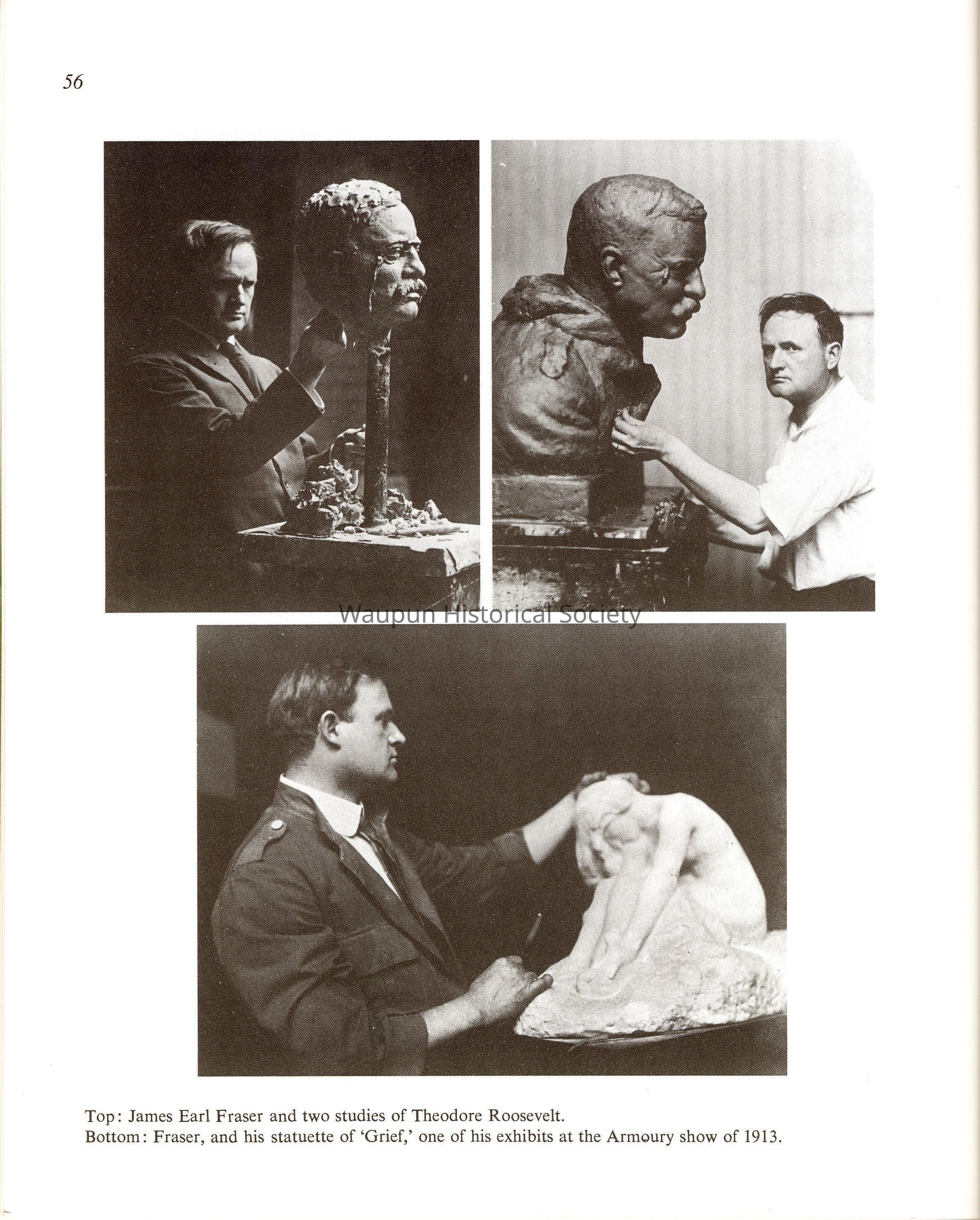 Fraser also made a number of portraits of adults during this early period. Among them are, two fellow artists of McDougal Alley, J. Eastman Chase and E. W. Deming, three heads of Indians later used for the study of the Buffalo nickel; Warren Delano; E. H. Harriman; Walter Goodwin; Dr. Louis Ledoux; Charles Dana Gibson (ca. 1918) Morris K. Jessup; Pat Ford; Mr. and Mrs. John Jacob Albright; Dr. William Polk, of the Cornell Medical Library; a commemorative plaque for M. H. Schoelkopf. Perhaps his most important early commission was for the marble bust of Theodore Roosevelt for the Senate Chamber, begun in 1906. From this commission followed not only other portraits of Roosevelt, but of men connected with him: Roger Bacon, Elihu Root (two different portraits) and later the William Howard Taft Memorial. Fraser's work was not confined to portraits; he designed sculptured ornaments for the Fine Arts Academy, Buffalo, New York, and also an ornamental vase for the City of Buffalo. For the garden of the E. H. Harriman house in Arden, New York, he designed a fountain with a classical figure playing with a tortoise and a panther. 'A Basque,' one of 'a series of studies of old men' he made about 1910, went to the Hispanic Society, New York.