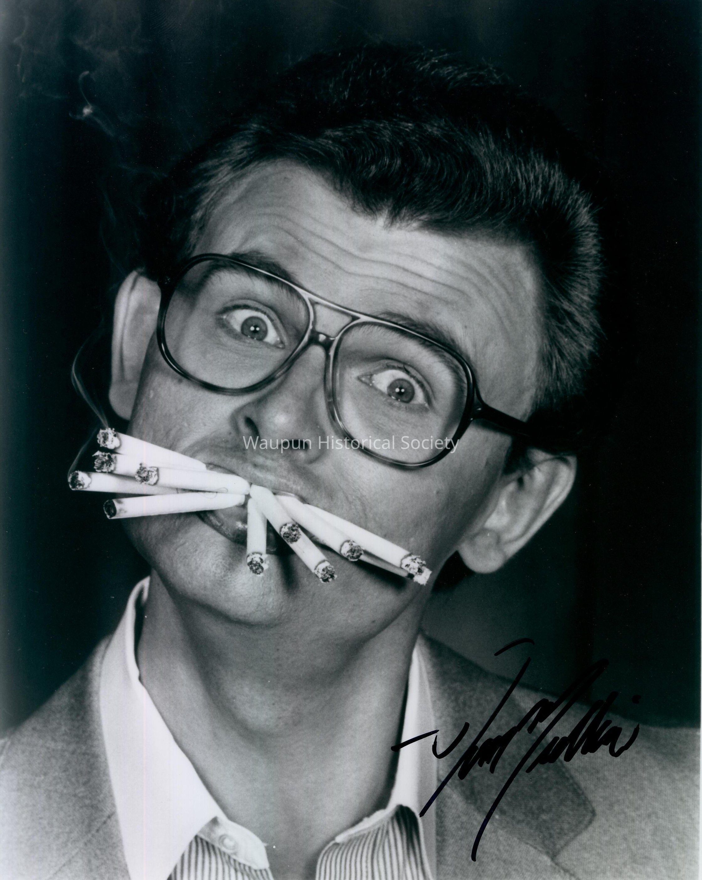 Tom Mullica with many cigarettes. This is a photo of Tom Mullica acting. Tom Mullica is a Waupun man who became quite successful acting as Red Skelton and doing magic. Much of the time he performed at a theater in Branson, MO. There are other entries about him acting in Waupun, primarily to raise money for the Waupun Fire Department. Tom autographed the photo. There are two copies of the this photo, labeled 2007.0019.0002-1 and 2007.0019.0002-2.Acquisition