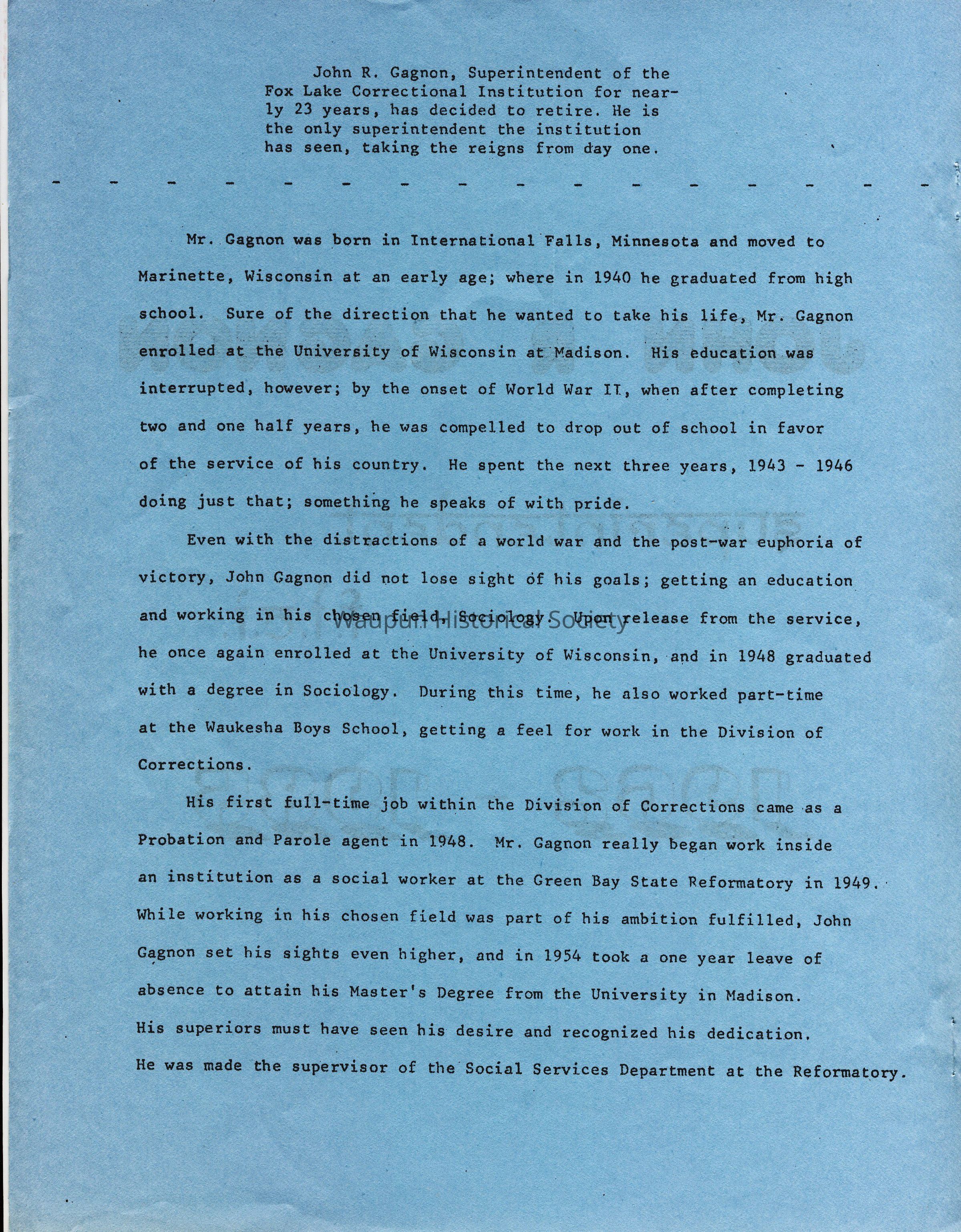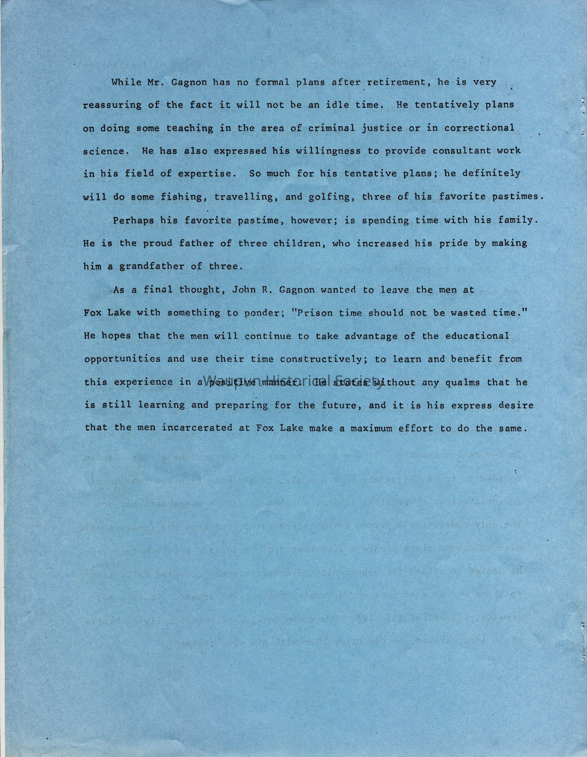 John R. Gagnon, superintendent of Fox Lake Correctional Institution. This was during 1985, the end of John tenure at Fox Lake. The institution is now know as Wisconsin State Prison at Fox Lake.
