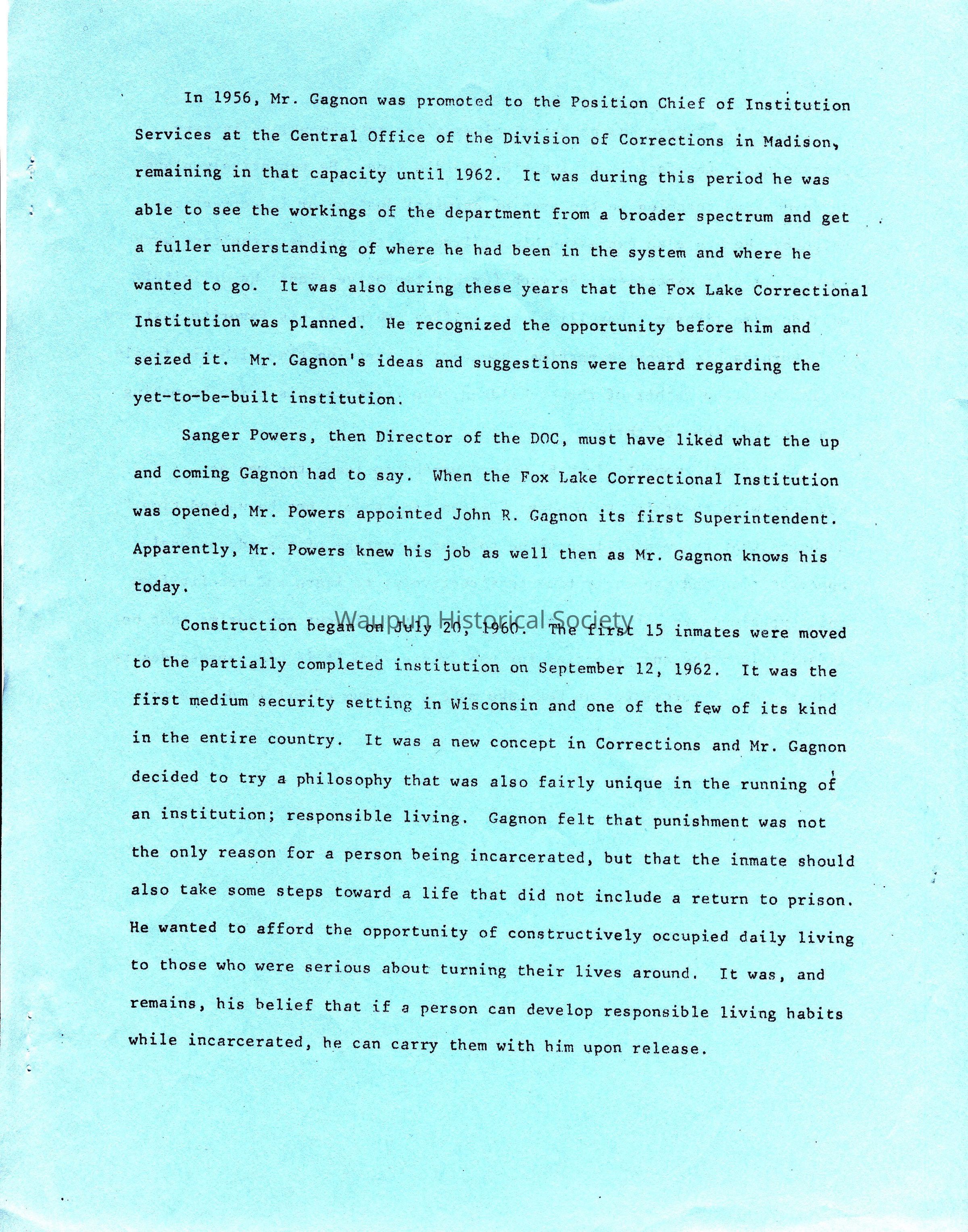 Sanger Powers, then Director of the DOC, must have liked what the up and coming Gagnon had to say. When the Fox Lake Correctional Institution was opened, Mr. Powers appointed John R. Gagnon its first Superintendent. Apparently, Mr. Powers knew his job as well then as Mr. Gagnon knows his today.