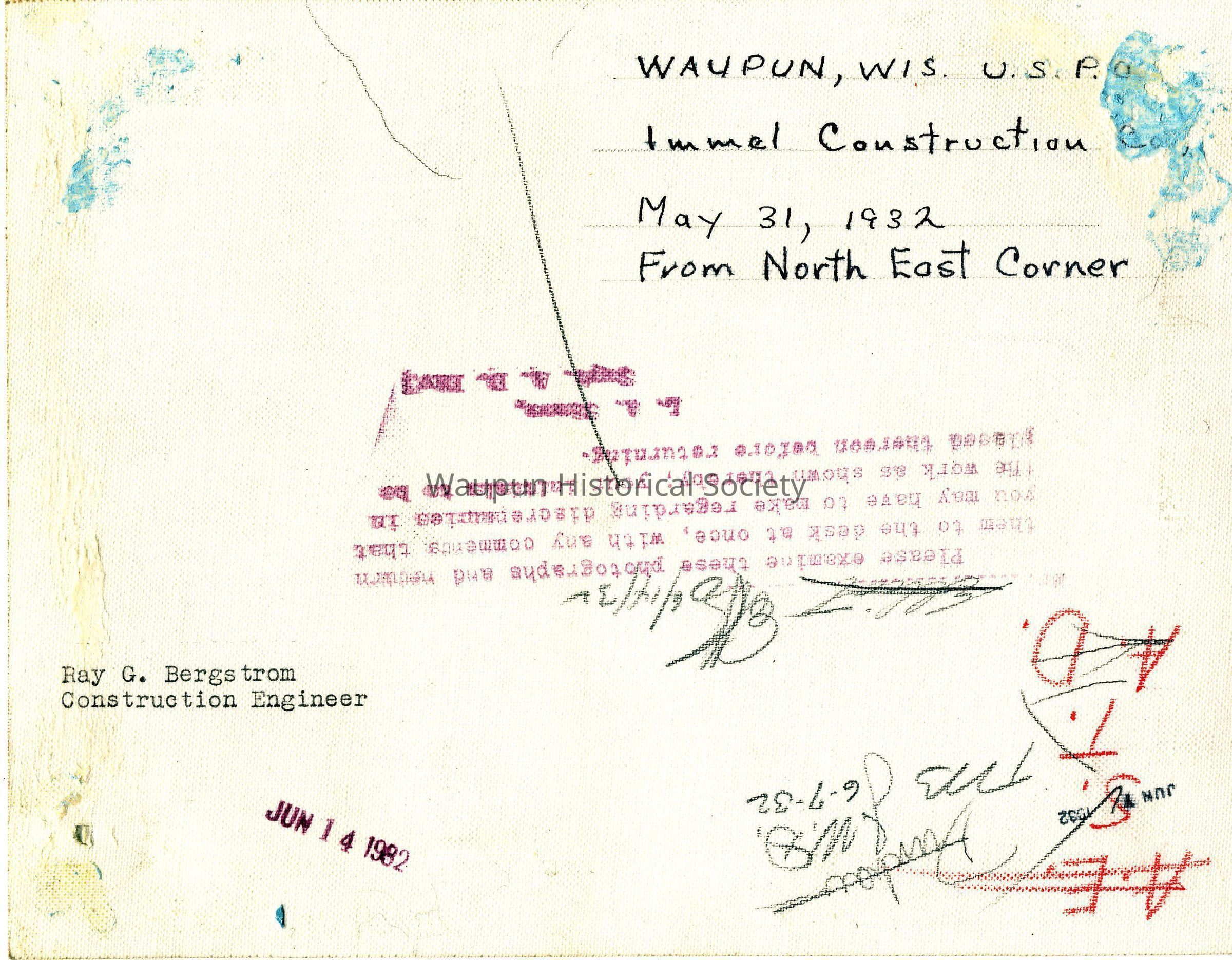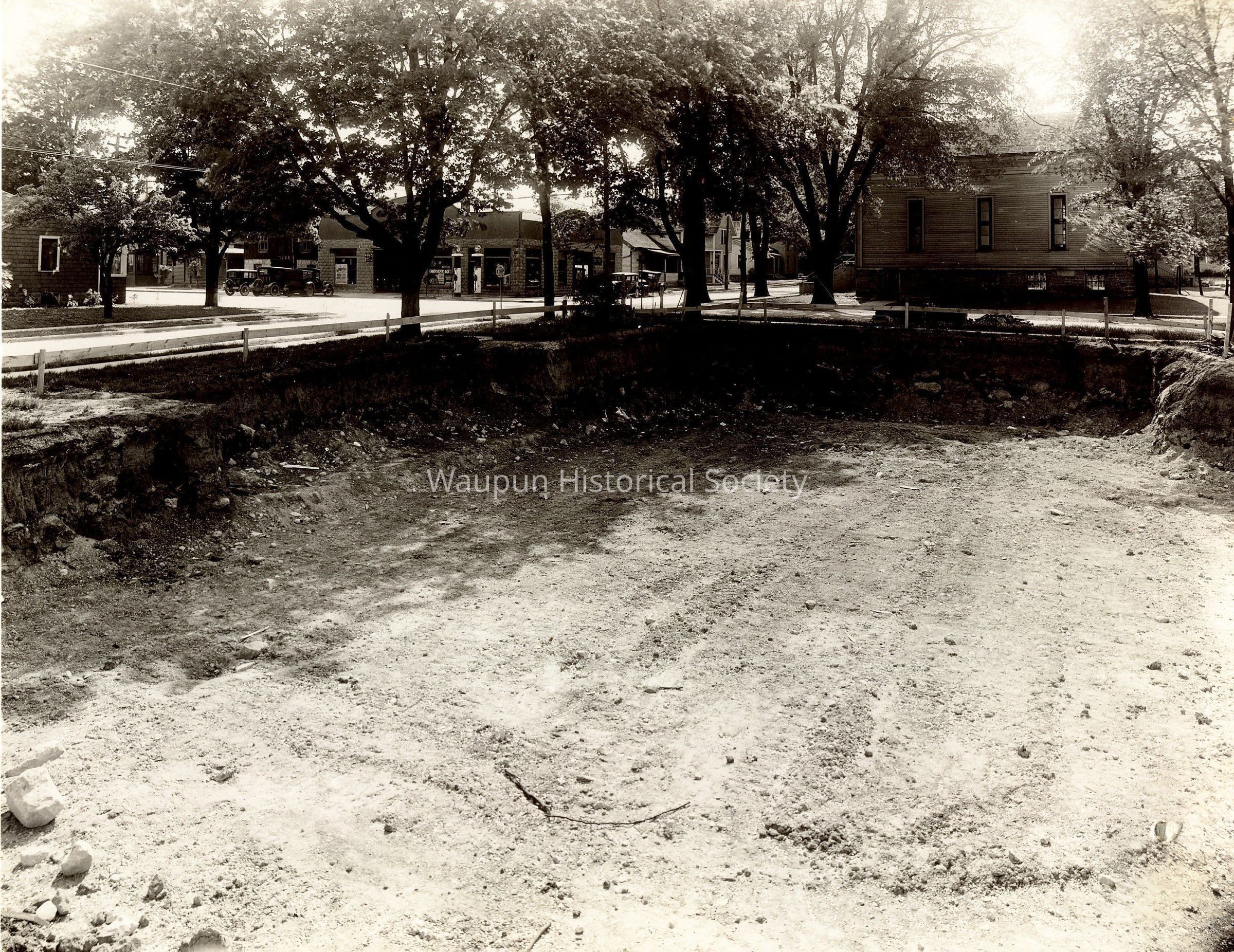 Photograph, Post Office. Photo of the Waupun Post Office. This photo shows the hole dug for the construction of the Waupun Post Office. The date on the back of the photo is May 31, 1932. The back also indicates that the photo is from the North East corner looking Southwest. The Immel Construction Company built the building and Ray G. Bergstrom was the Construction Engineer. Mr. Bergstrom and the Immel Construction Company were from Wisconsin Rapids, WI. Notice the garage with two pumps, also the great old cars. These photos were entered January 30, 2009 the the Church shown has changed very little.Acquisition
