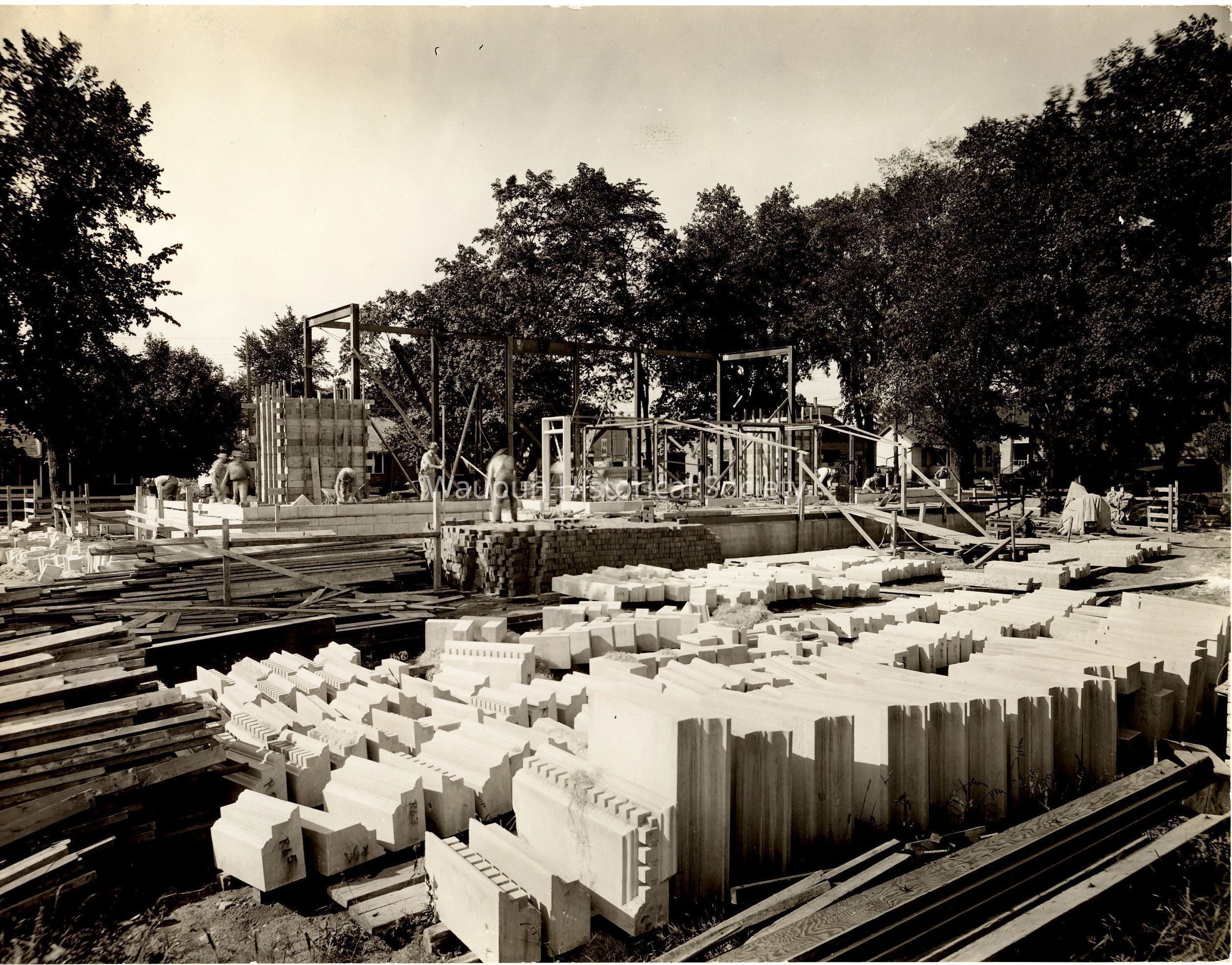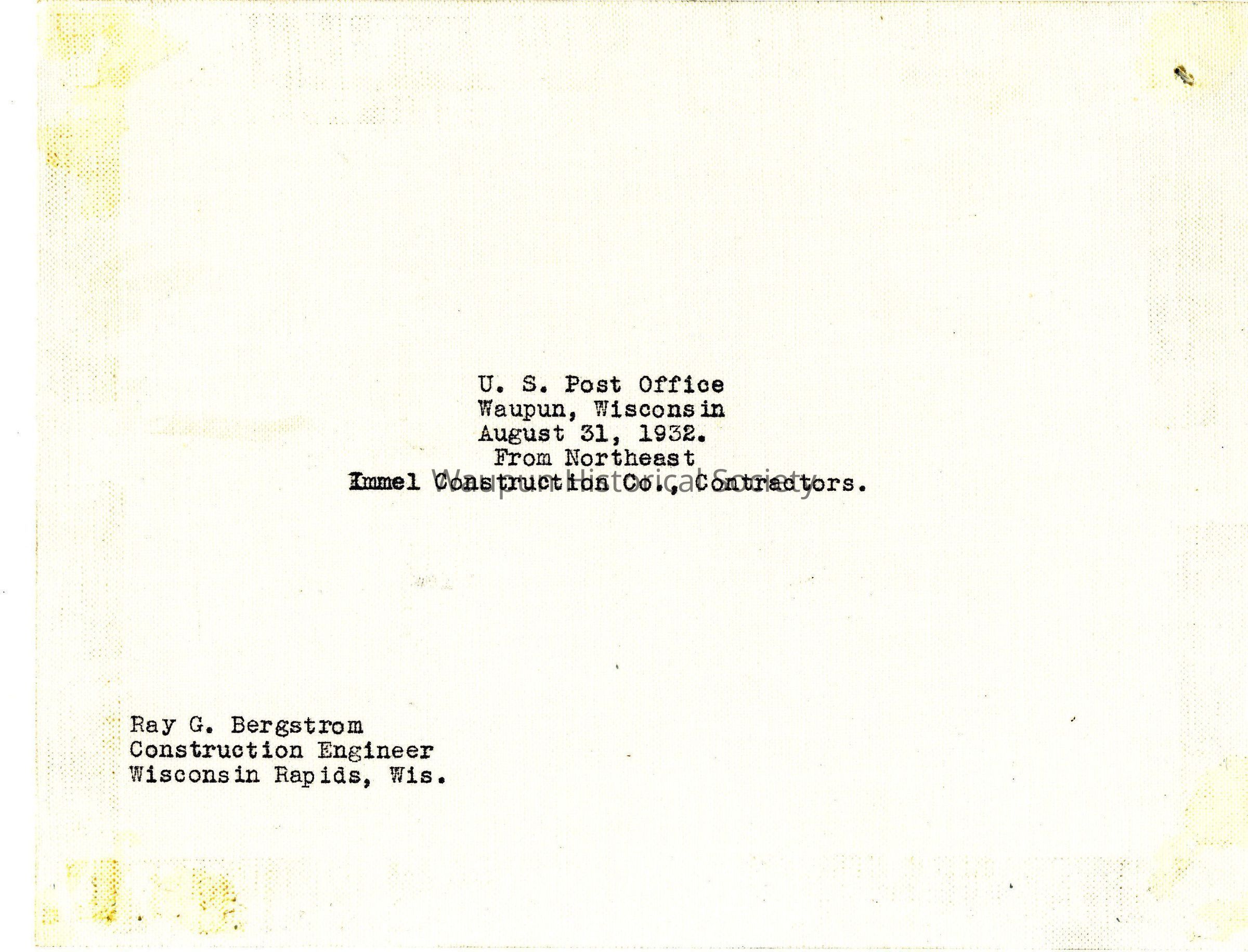 Photo of the Waupun Post Office. This photo shows the hole dug for the construction of the Waupun Post Office. You can also see the beginning of the foundation.The date on the back of the photo is August 31, 1932. The back also indicates that the photo is from the Northeast looking Southwest. The Immel Construction Company built the building and Ray G. Bergstrom was the Construction Engineer. Mr. Bergstrom and Immel Construction Company were from Wisconsin Rapids, WI. You can also see the steel beams used in the construction. Notice also the numbered cut stone in the forground.Acquisition