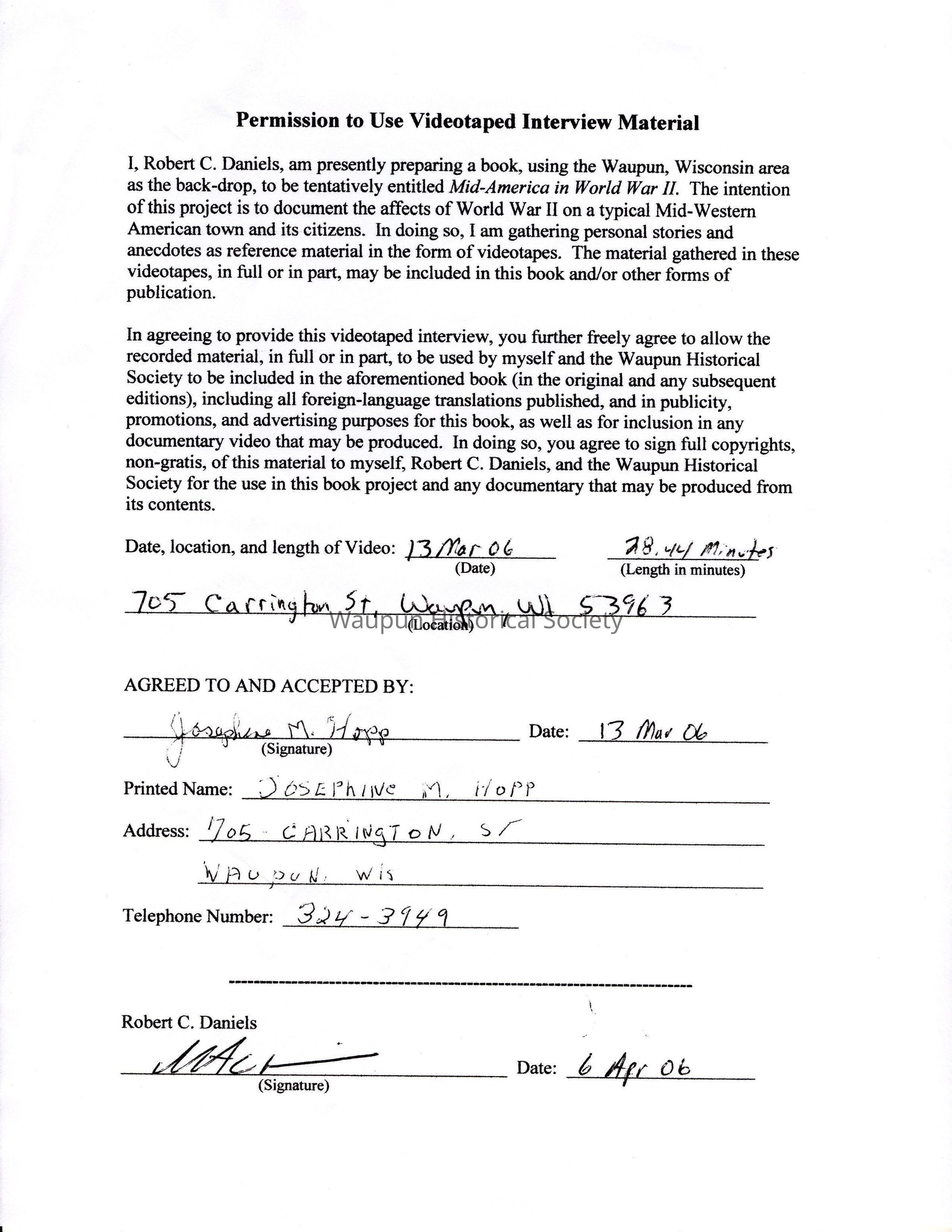 In agreeing to provide this videotaped interview, you further freely agree to allow the recorded material, in full or in part, to be used by myself and the Waupun Historical Society to be included in the aforementioned book (in the original and any subsequent editions), including all foreign-language translations published, and in publicity, promotions, and advertising purposes for this book, as well as for inclusion in any documentary video that may be produced. In doing so, you agree to sign full copyrights, non-gratis, of this material to myself, Robert C. Daniels, and the Waupun Historical Society for the use in this book project and any documentary that may be produced from its contents.