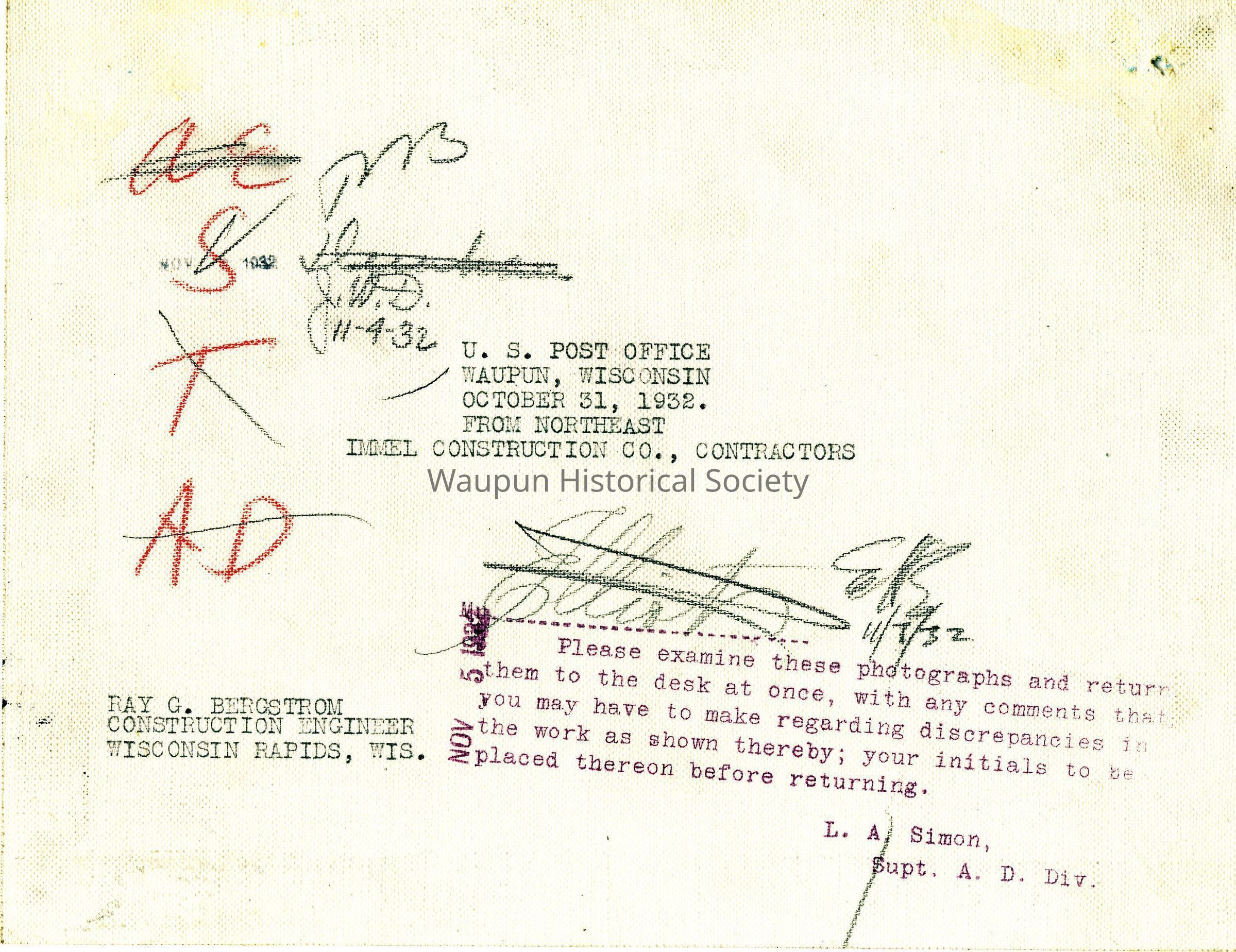 Photo of the Waupun Post Office. The date on the back of the photo is October 31, 1932. The back also indicates that the photo is from the Northeast looking Southwest. The Immel Construction Company built the building and Ray G. Bergstrom was the Construction Engineer. Mr. Bergstrom and Immel Construction Company were from Wisconsin Rapids, WI. Shows the back of the building with the loading dock.Acquisition