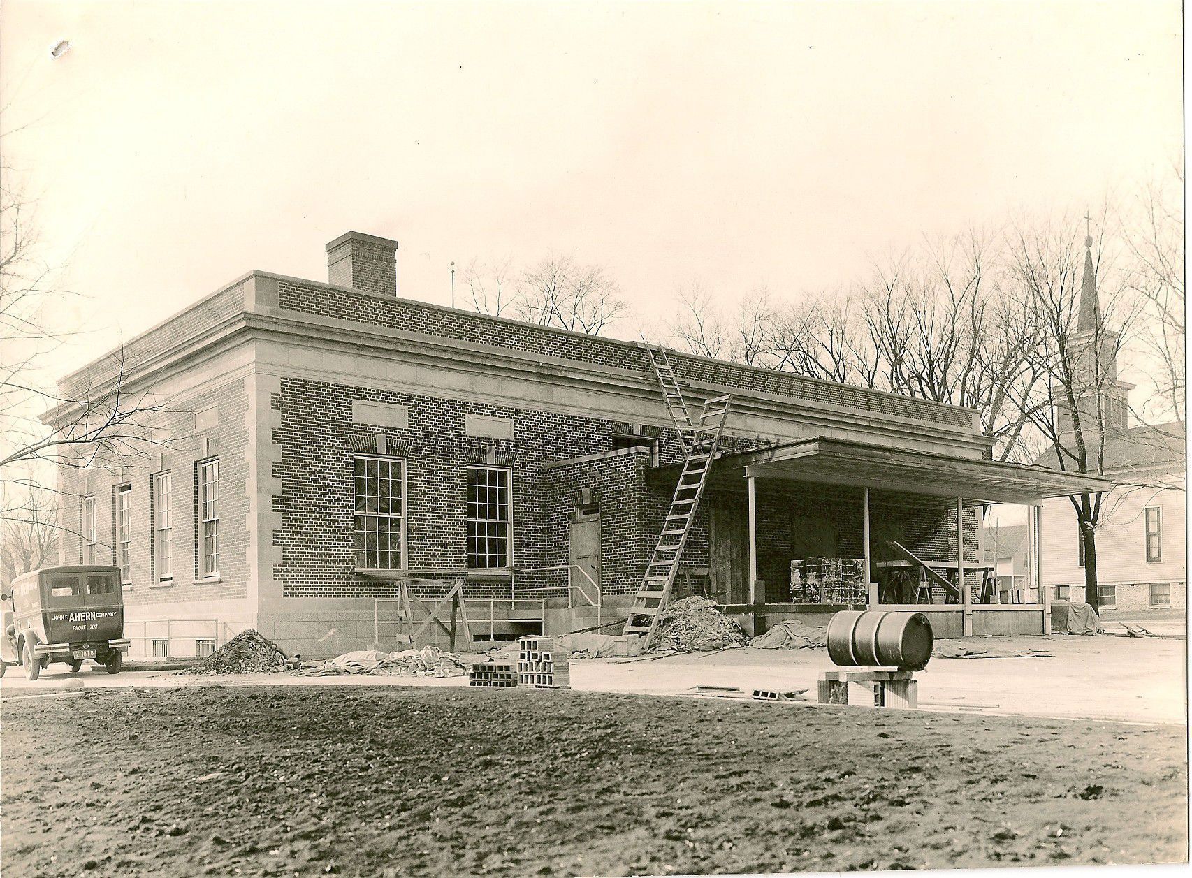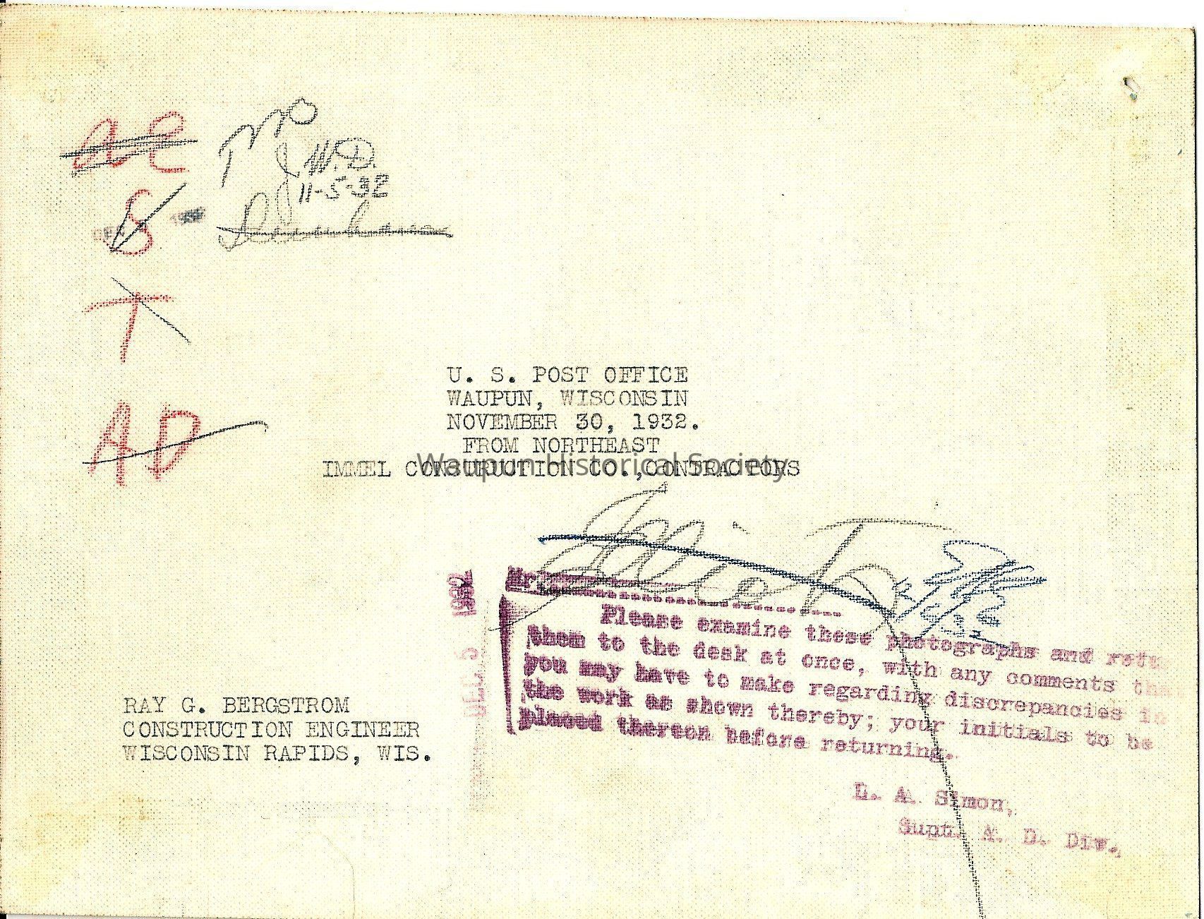 Photo of the Waupun Post Office. The date on the back of the photo is November 30, 1932. The back also indicates that the photo is from the Northeast looking Southwest. The Immel Construction Company built the building and Ray G. Bergstrom was the Construction Engineer. Mr. Bergstrom and Immel Construction Company were from Wisconsin Rapids, WI. Building appears to be just about completed. Building is shown from the back and shows the loading dock. Notice the wooden ladders. There is also a John Ahern Company truck in the photo.Acquisition