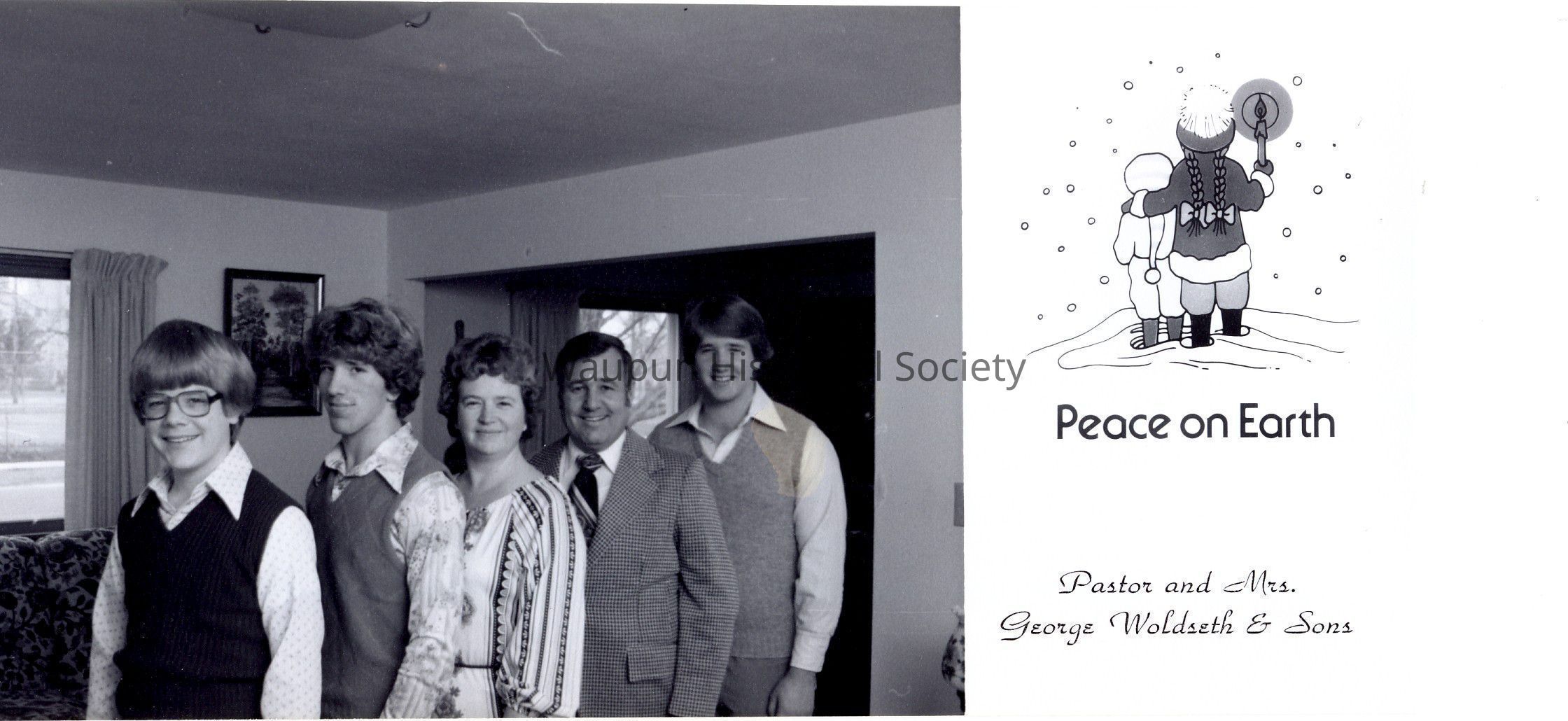 Christmas Card, Church, Union-Congregational, UCC, Rev. George and Nola Woldseth . Rev. George and Nola Woldseth Christmas card. Year unknown. From L to R: David Woldseth, Jim Woldseth, Nola Woldseth, Rev. George Woldseth and George Paul Woldseth. Rev. Woldseth was the pastor of of Union Congregationa Church. He left Waupun to take a position with the Trinity United Church of Christ in St. Petersburg, Florida.Acquisition