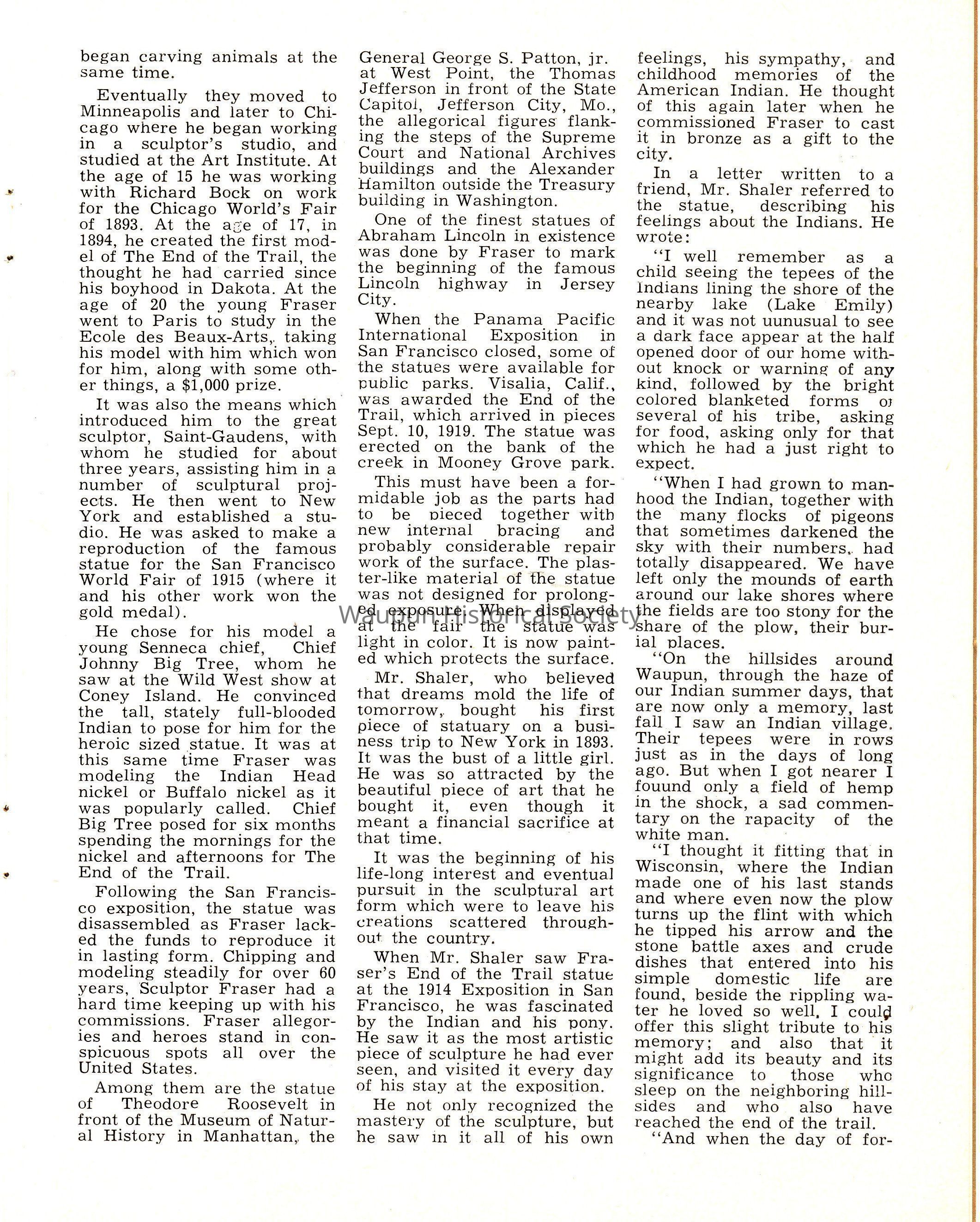In another letter dated Feb. 24, 1926, Mr. Shaler wrote ... "Just received a letter from Fraser acknowledging order for End of Trail, but he wants two years in which to finish it, and will come to Waupun before starting on large figure so as to see location and know just the right size to make it.