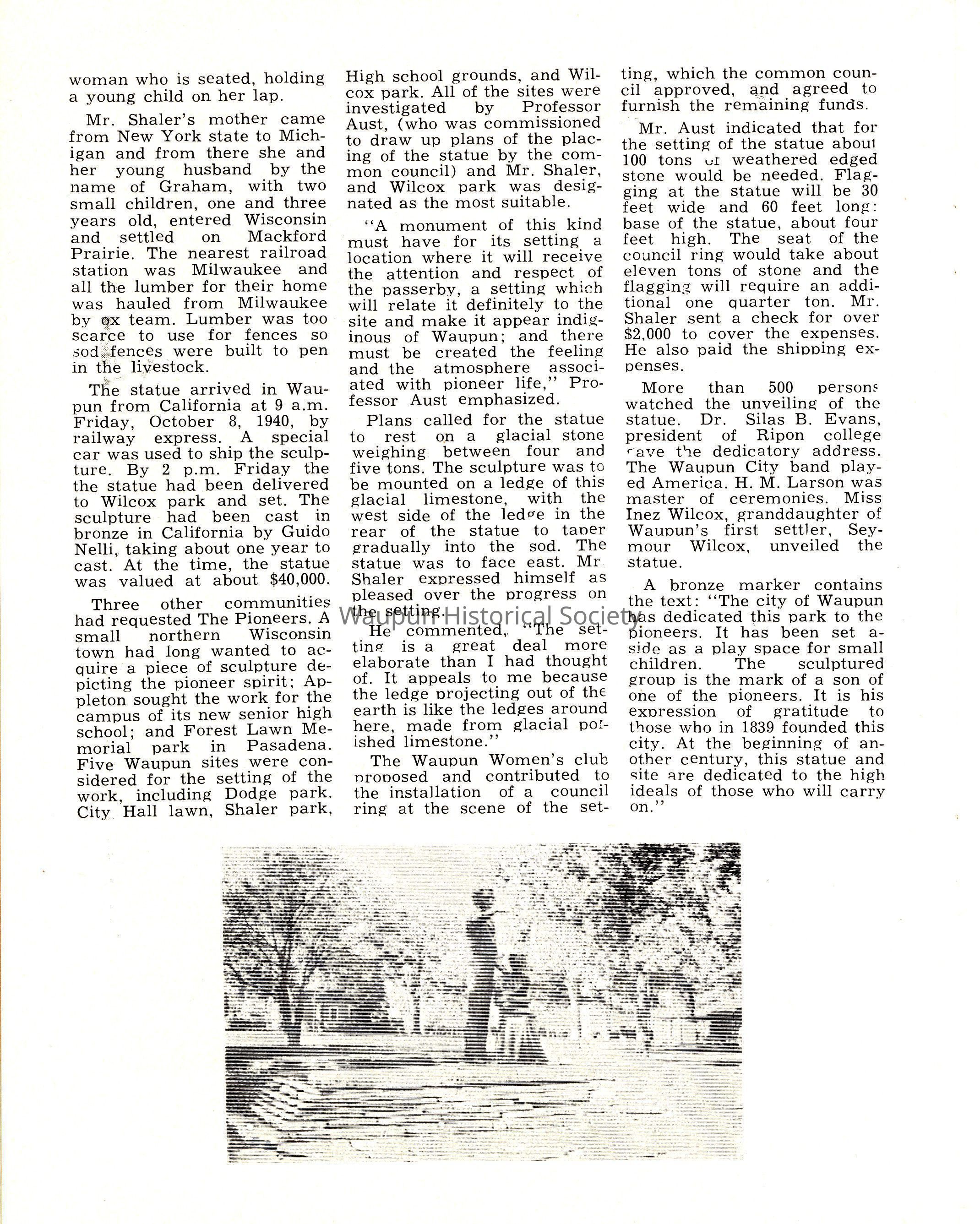 With these words, Professor Franz Aust, speaking in behalf of Mr. Shaler, formally presented to the city the group of statues, called by the sculptor, The Pioneers of Wisconsin. His speech was part of the dedicatory program for the unveiling of the statuary, which took place at 1:30 p.m.. Sunday, October 20, 1940, in Wilcox park, Watertown and Lincoln streets. Mayor L. A. Smith accepted in behalf of the city.