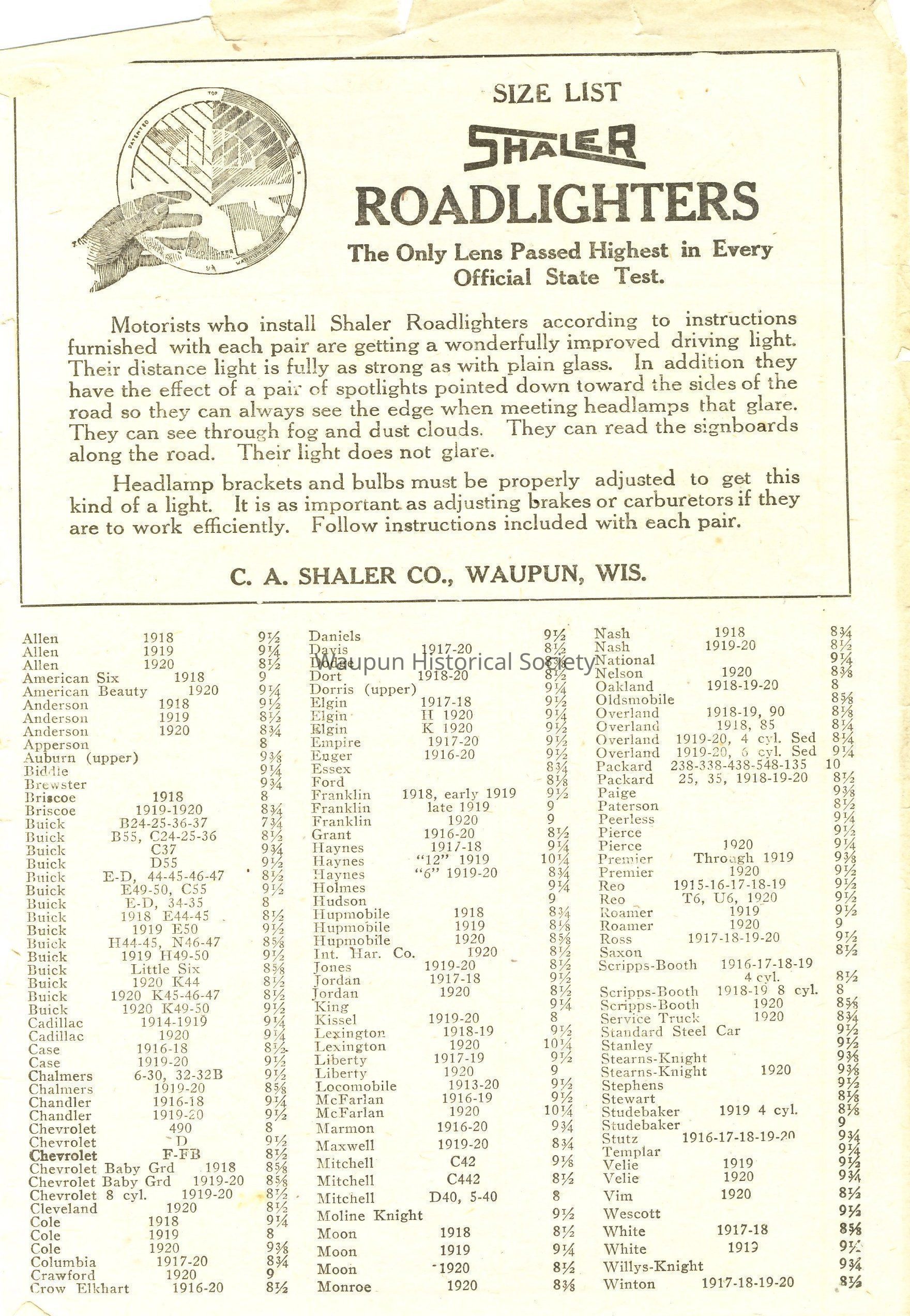 Shaler, ROADLIGHTERS, Make Your Headlamps Do Their Best, C. A. Shaler Co., Waupun, Wis.
