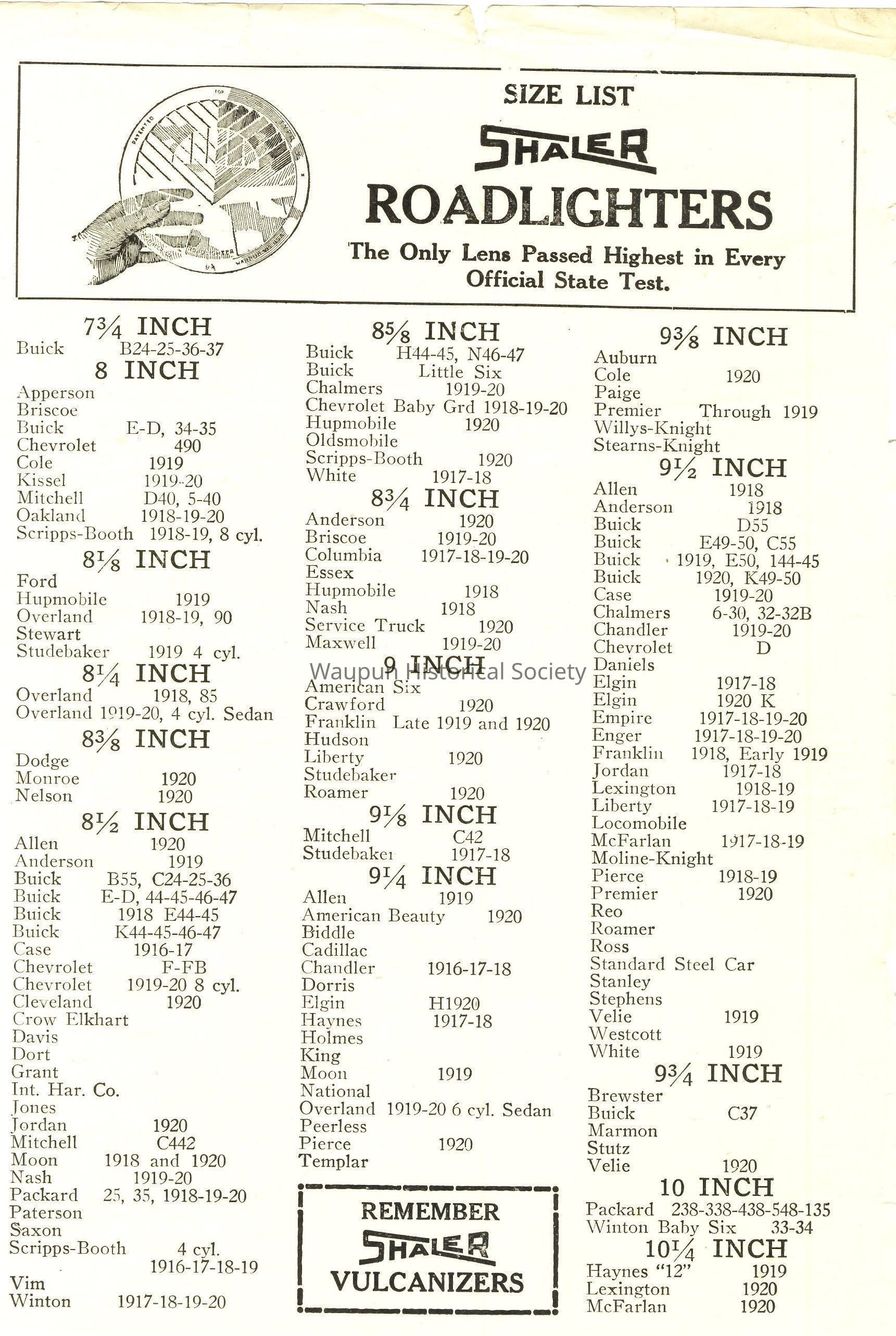 Included is a Size List of Shaler Roadlighters; The only lens passed highest in every official state test.Acquisition