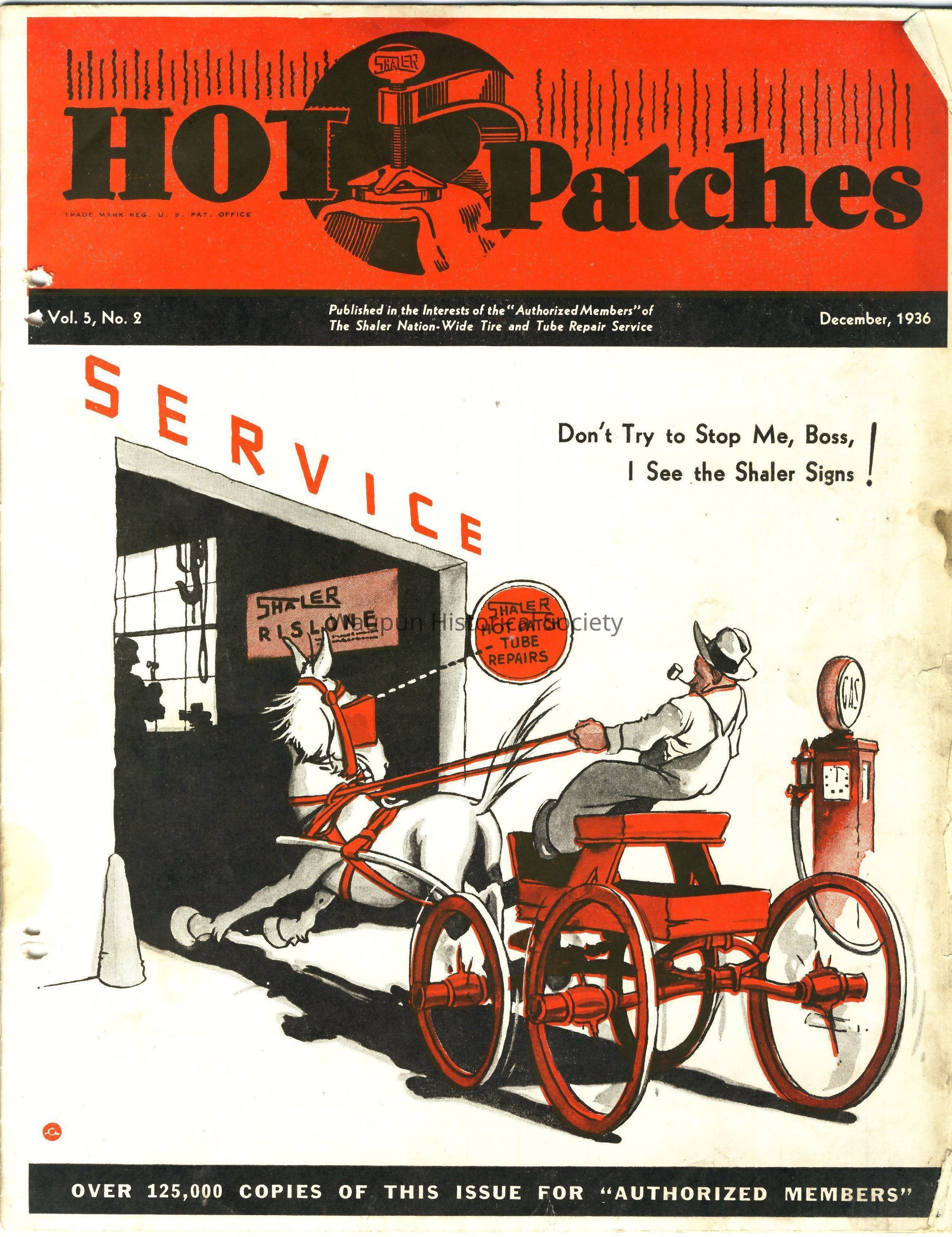 Shaler, magazine, "HOT PATCHES", Vol. 5, No.2, December,1936, Published in the Interests of the "Authorized Members" of The Shaler Nation-Wide Tire and Tube Repair Service, entitled, "Don't Try to Stop Me, Boss, I See the Shaler Signs!". Drawing of a man with horse and buggy entering a Shaler Service Station.Acquisition