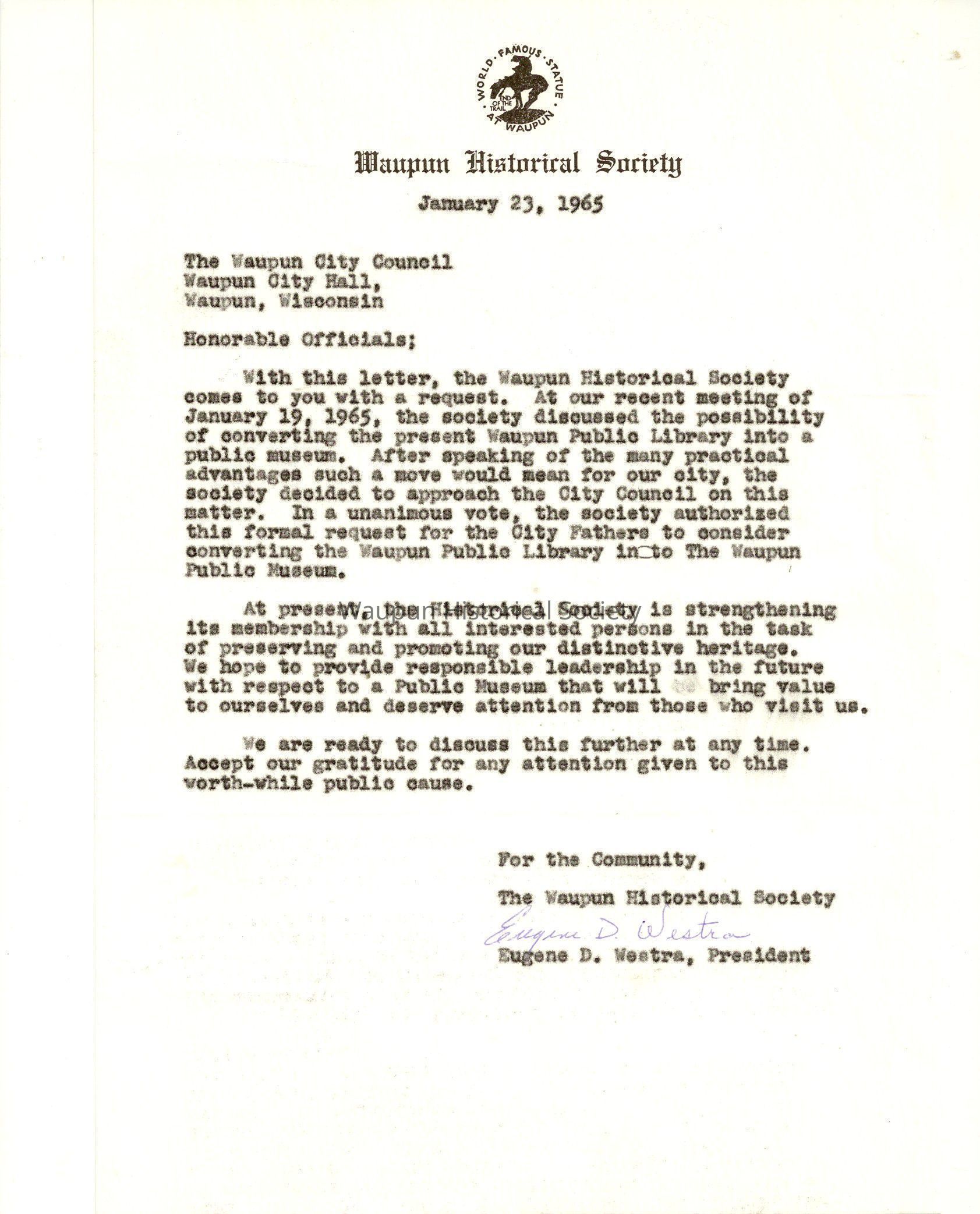 With this letter, the ,Waupun Historical Society come to you with a request. At our recent meeting of January 19, 1965 the society discussed the possibility of converting the present Waupun Public Library into a public museum After speaking of the many practical advantages such a move would mean for our city, the society decided to approach the City Council on this matter. In a unanimous vote, the society authorized this formal request for the City Fathers to consider converting the Waupun Public Library into The Waupun Public Museum.