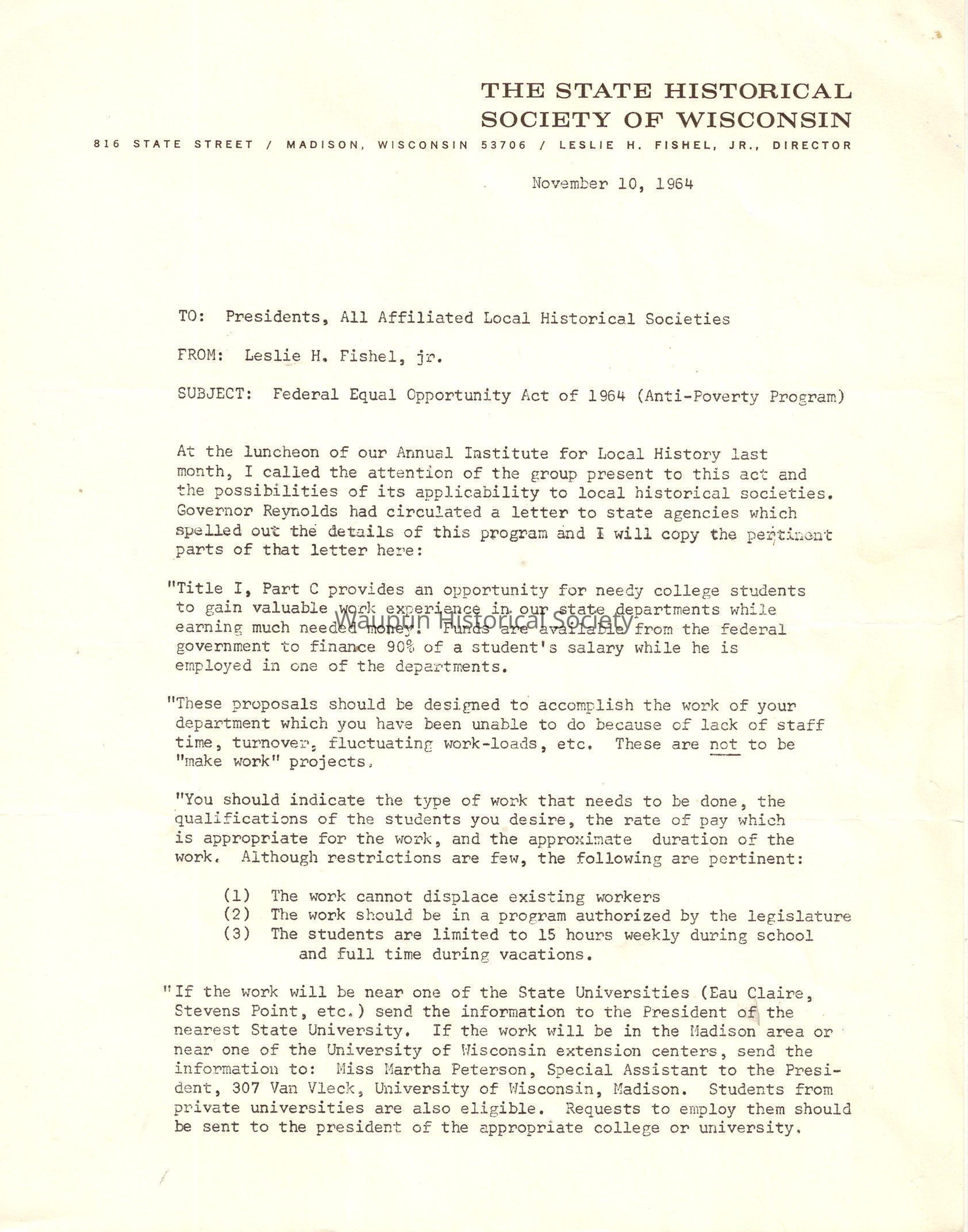 Waupun Historical Society, Letter Regarding State Historical Society, 1964Entry/Object ID