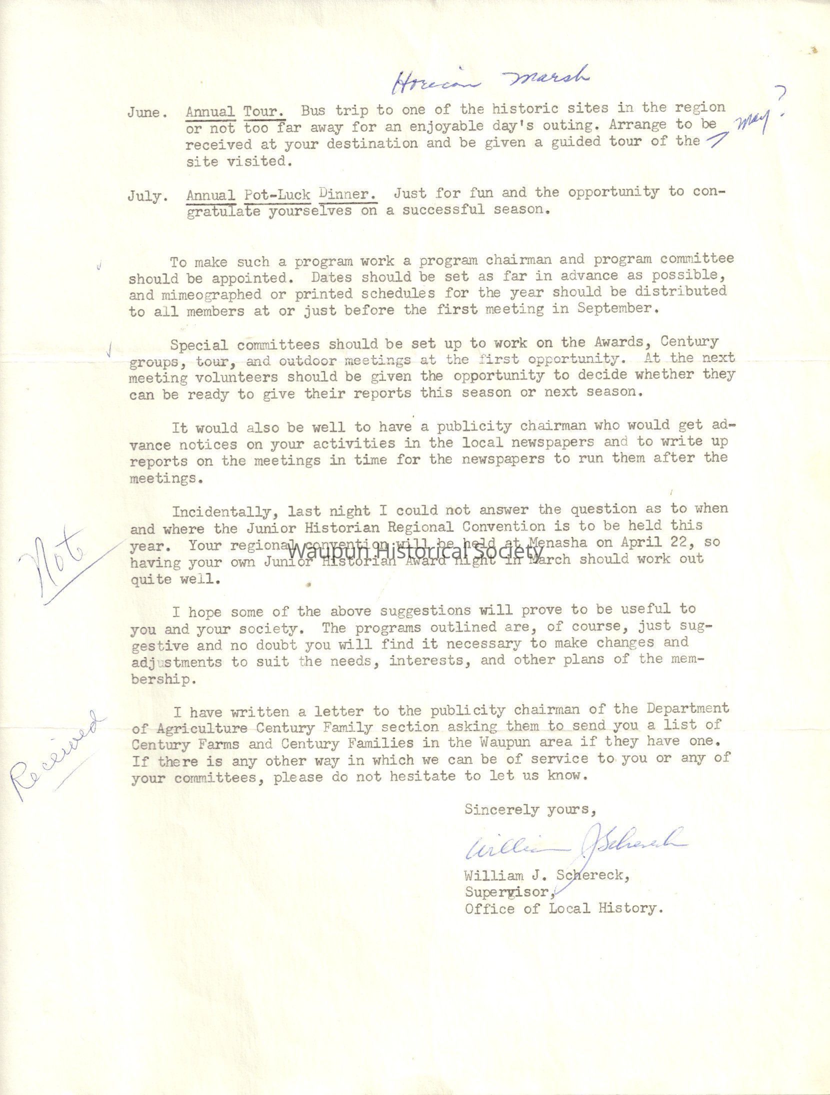 I have written a letter to the publicity chairman of the Department of Agriculture Century Family section asking them to send you a list of Century Farms and Century Families in the Waupun area if they have one. If there is any other way in which we can be of service to you or any of