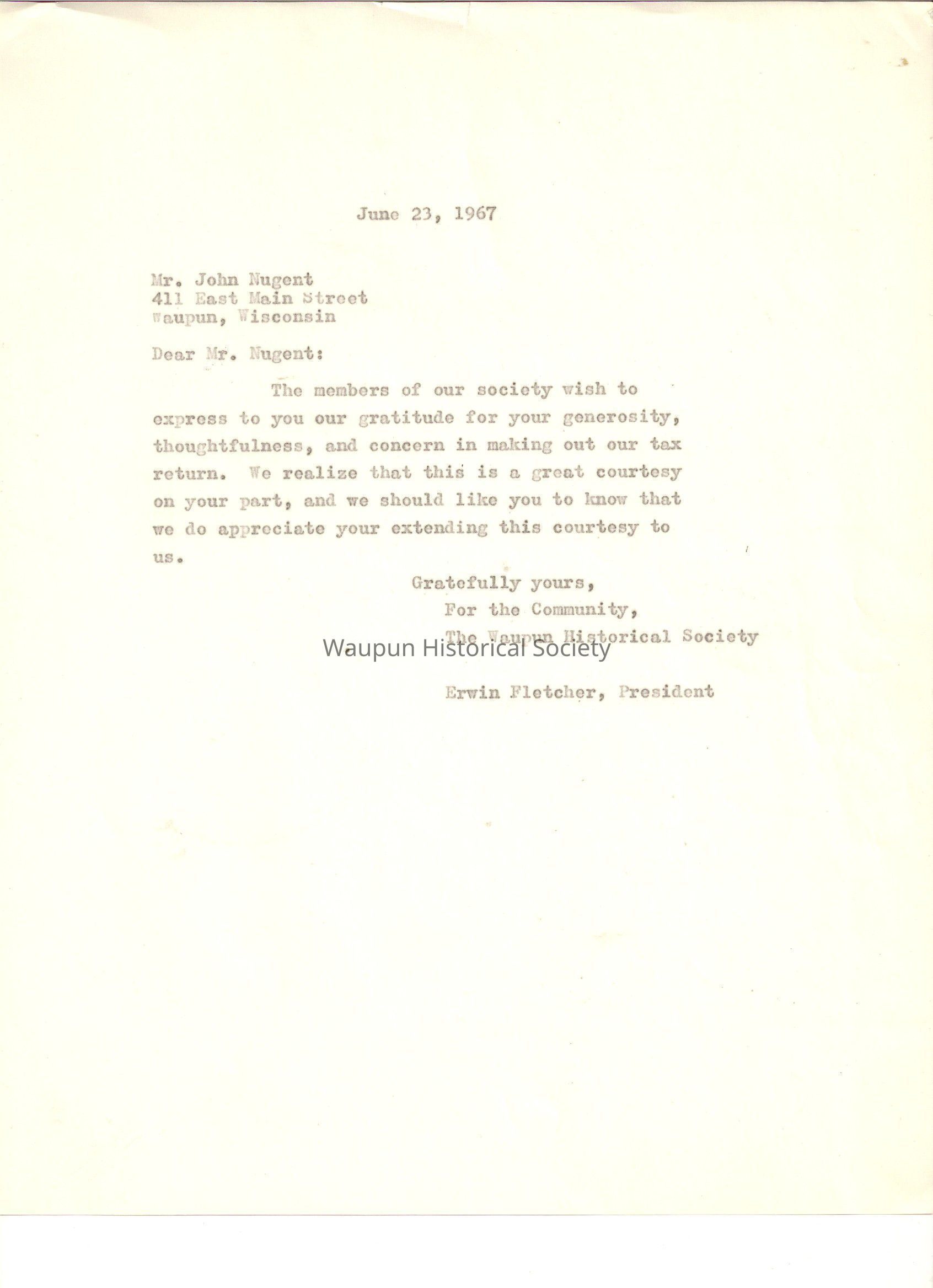 Waupun Historical Society, A Thank You Letter to the Society, Erwin FletcherEntry/Object ID