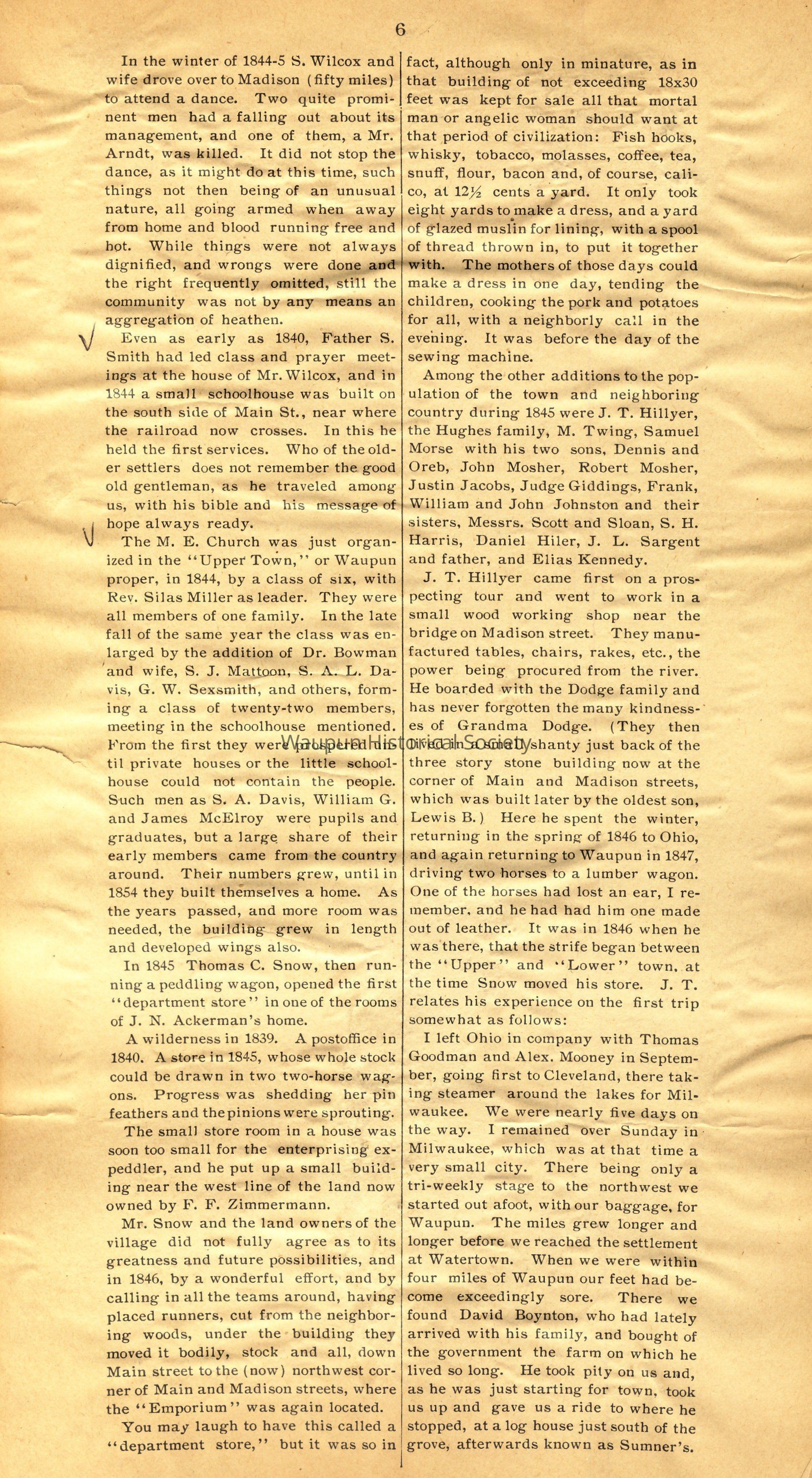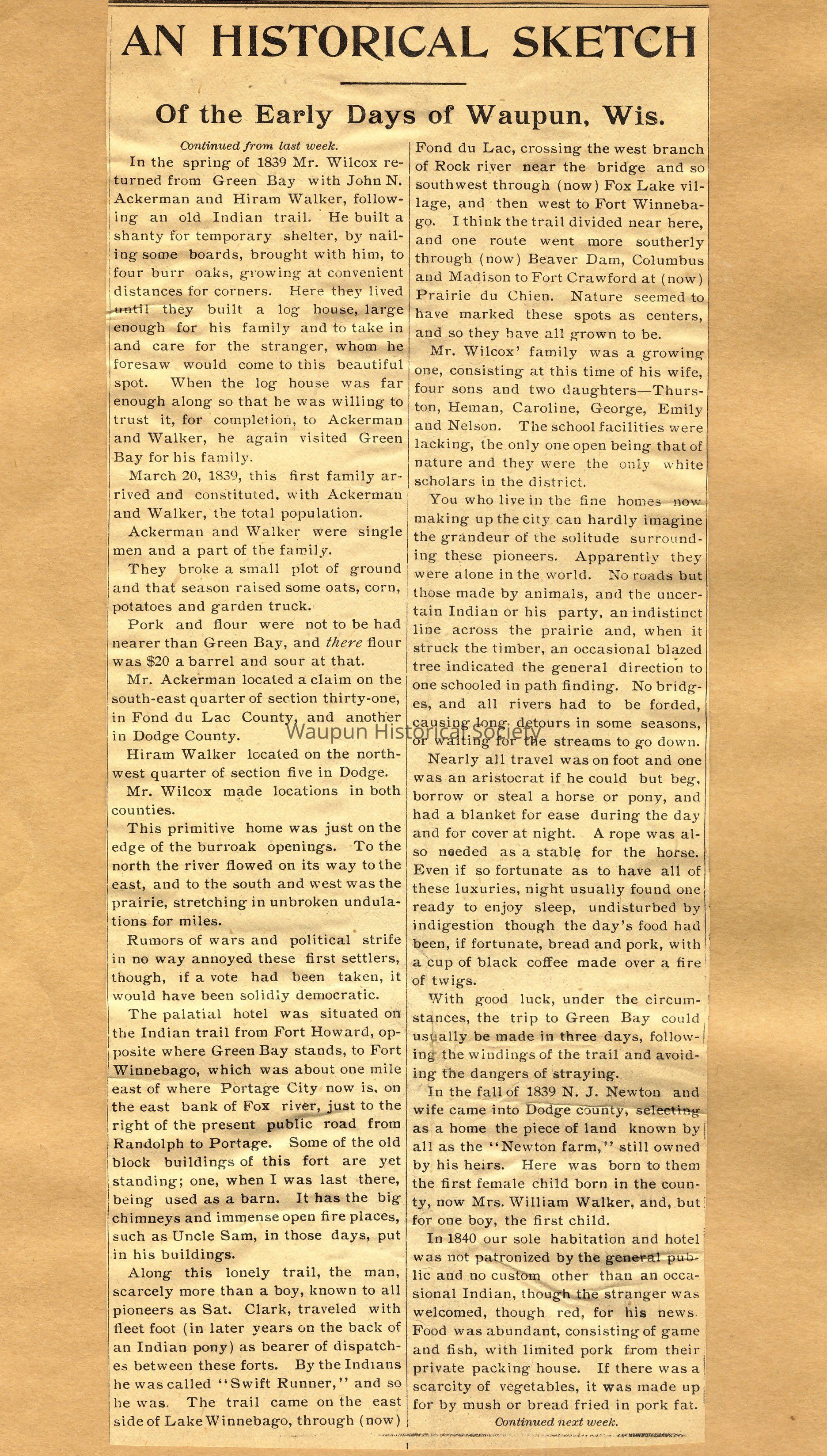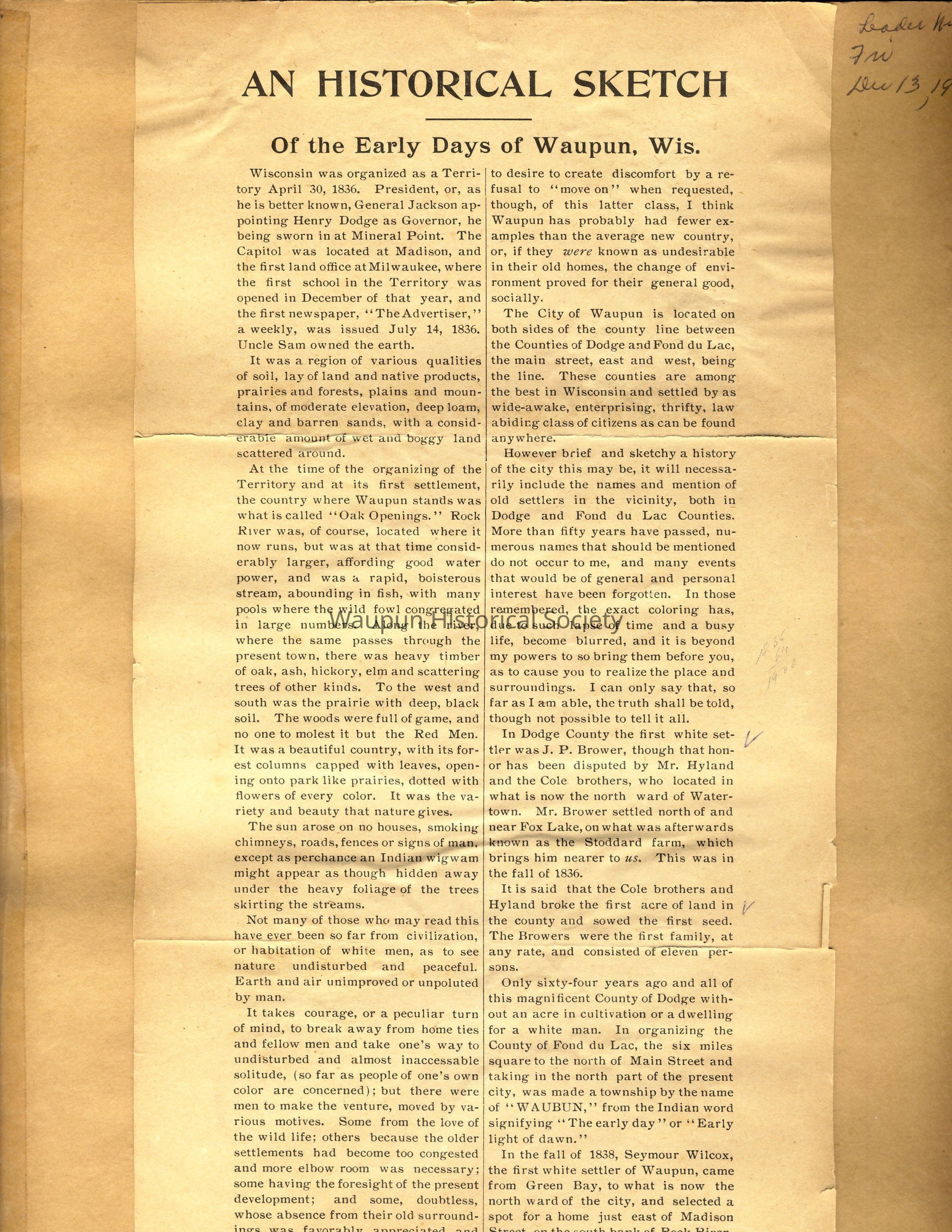EARLY HISTORICAL SKETCH OF WAUPUN.