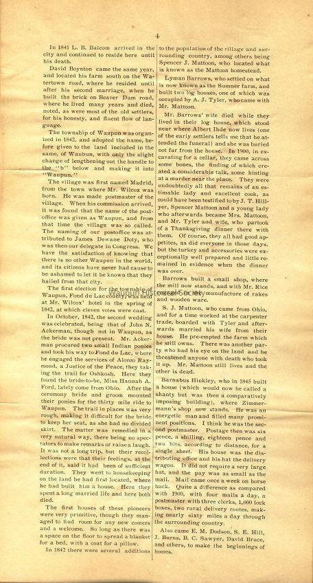 Mr. Barrows' wife died while they lived in their log house, which stood near where Albert Ihde now lives (one of the early settlers tells me that he attended the funeral) and she was buried not far from the house. In 1900, in excavating for a cellar, they came across some bones, the finding of which created a considerable talk, some hinting at a murder near the place. They were undoubtedly all that remains of an estimable lady and excellent cook, as could have been testified to by J. T. Hillyer, Spencer Mattoon and a young lady who afterwards became Mrs. Mattoon, and Mr. Tyler and wife, who partook of a Thanksgiving dinner there with them. Of course, they all had good appetites, as did everyone in those days, but the turkey and accessories were exceptionally well prepared and little remained in evidence when the dinner was over.