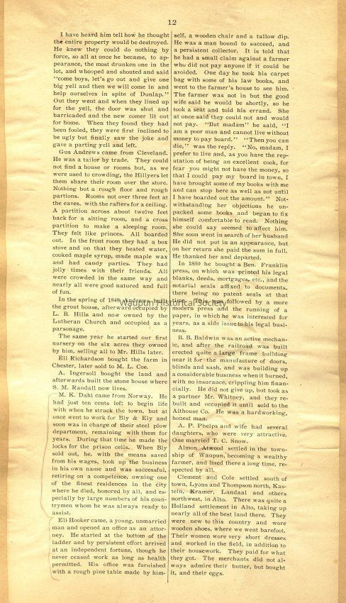 In 1843 L. P. Preston made his entrance and settled on a farm, but finally built a home at the southeast corner of Main street and the Fox Lake road. He later sold plows and mills for G.W. Bly, traveling with a team. In those days, the men and women who came here had plently of ambition and perseverance, but very little money. Mr. Preston, I am told, when he could not borrow or hire a horse to make the trip to Green Bay, to enter his land, did not sit down and give it up, but pulled out on foot with his luncheon in a cotton handkerchief, making the round trip successfully.