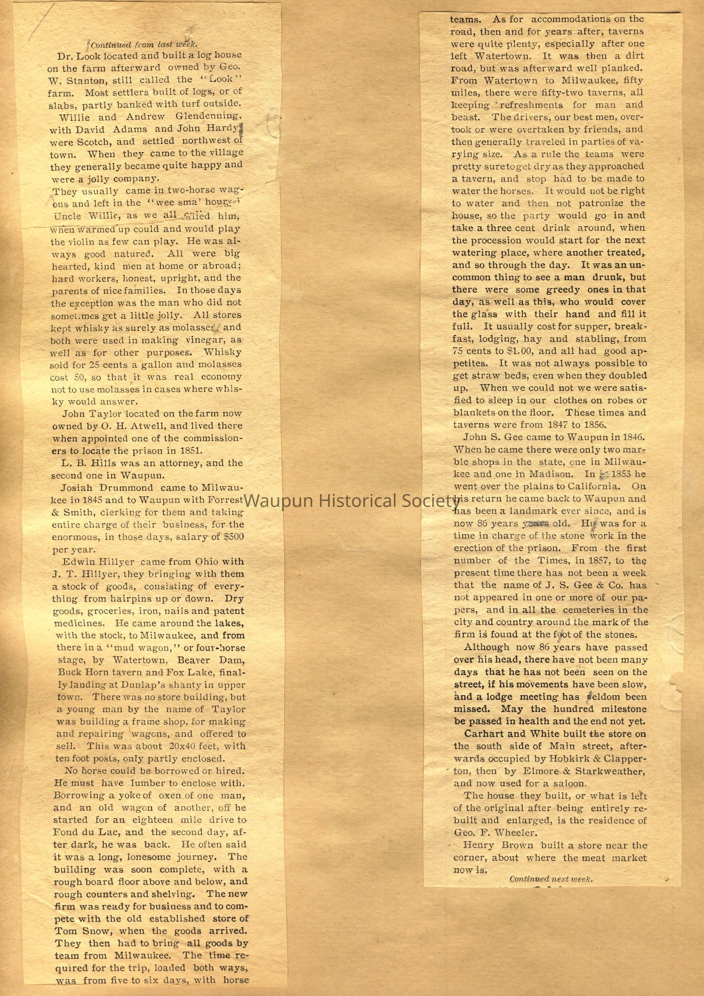 In 1844 the settlement of the country began in real earnest and there were many additions to the population, as well as visits of inspection by prospective settlers, among them being Rufus Dunlap and Martha Hillyer, his wife, (who were from Ohio and had first gone to Walworth county in 1841, and from there to Oshkosh) settling one-half mile south on the Beaver Dam road, on land now owned by Mr. Fletcher. The four large elms in front of the present house was transplanted by him. Here they resided until 1846, when he sold, and bought six acres on the corner north of the West ward school, where he put up a slab shanty, built by pinning the slabs, set up endways, to poles. My recollection of its size is that it was about 14x18 feet, nine feet high at the eaves, with the lower room about seven and a half feet, the attic being about one foot at the eaves. It had a slab floor below and a rough board floor in the second story, not nailed down. For weeks after I first came to Waupun, I boarded with them and used to climb up a ladder and enjoy my straw tick and straw pillow in company with one or two children. In 1847 he began the erection of the "Dunlap Hotel" at the corner of Main and upper Beaver Dam roads, a big undertaking, but made necessary in order to keep up with the "Lower Town," with which rivalry was, by this time, becoming pretty strong.