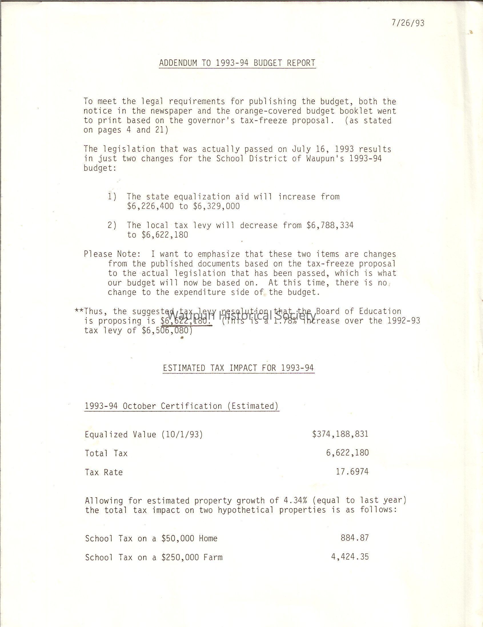 Booklet, School District of Waupun, 1993-1994 Budget ReportEntry/Object ID