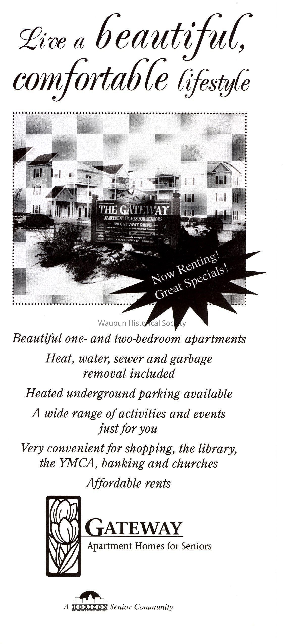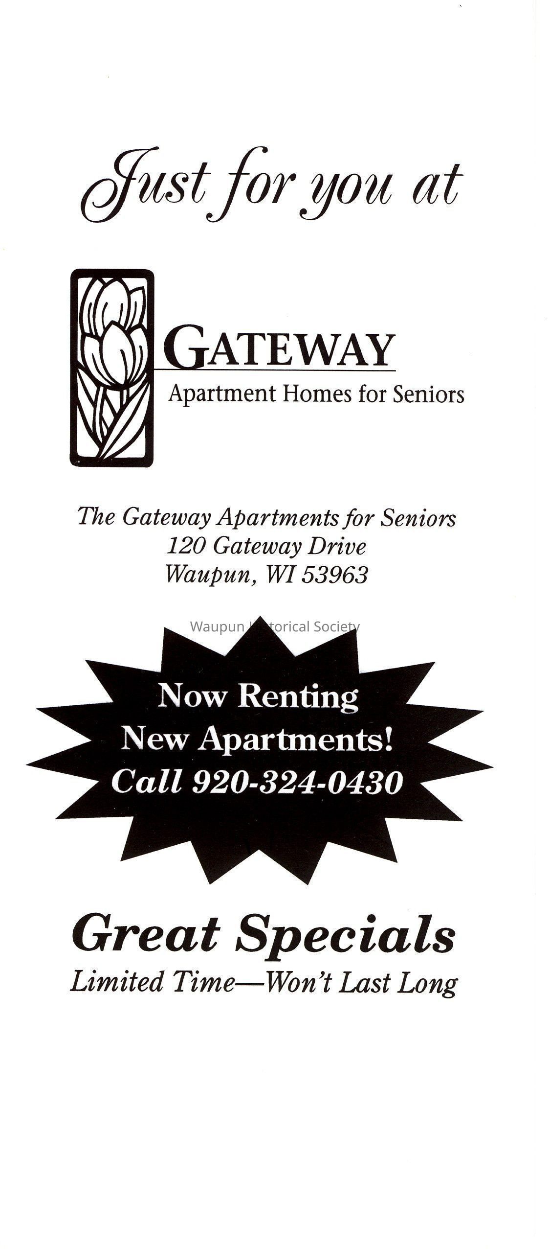 3 5/8" X 8 ½" handout advertising Gateway Apartment Homes for Seniors. Jim Laird picked up the handout at the 2009 Waupun Home Show held at the Waupun Community Center.