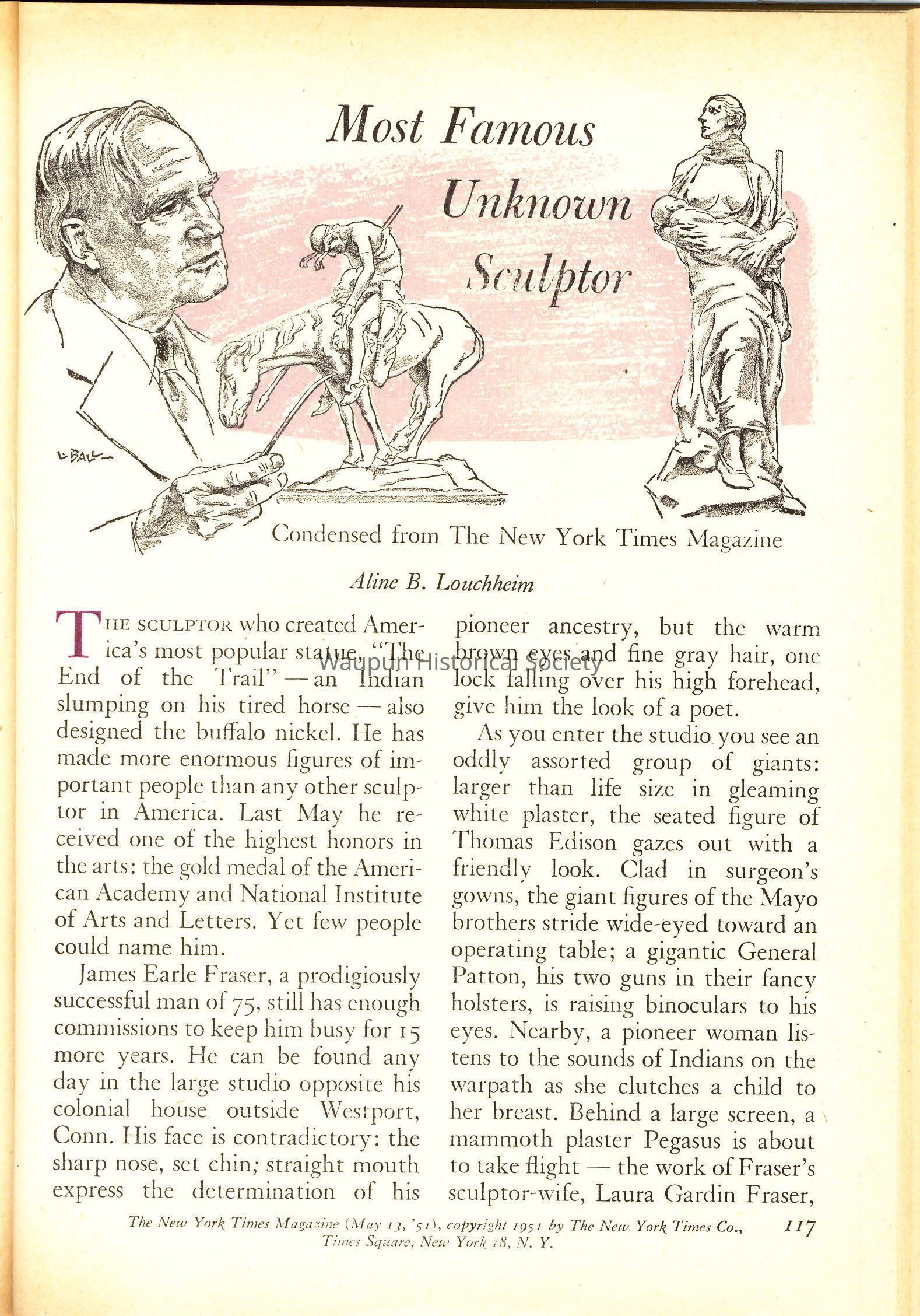 Article about James Earle Fraser - "Most Famous Unknown Sculptor" in the Reader's Digest from 1951, pages 117-119; condensed from The New York Times Magazine.