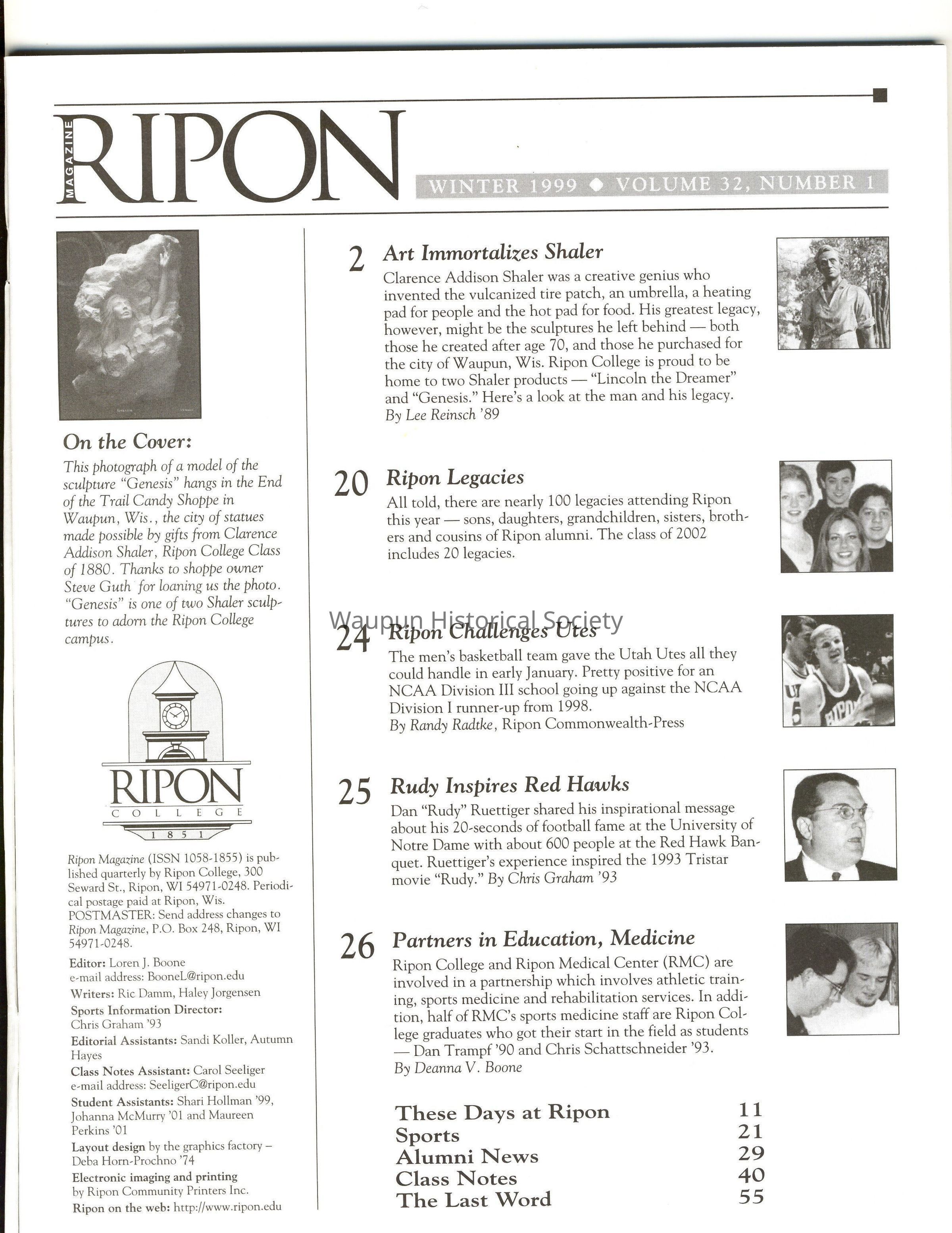 Article about Clarence Addison Shaler and pictures of his works in the RIPON Magazine, Winter 1999, Volume 32, No. 1.