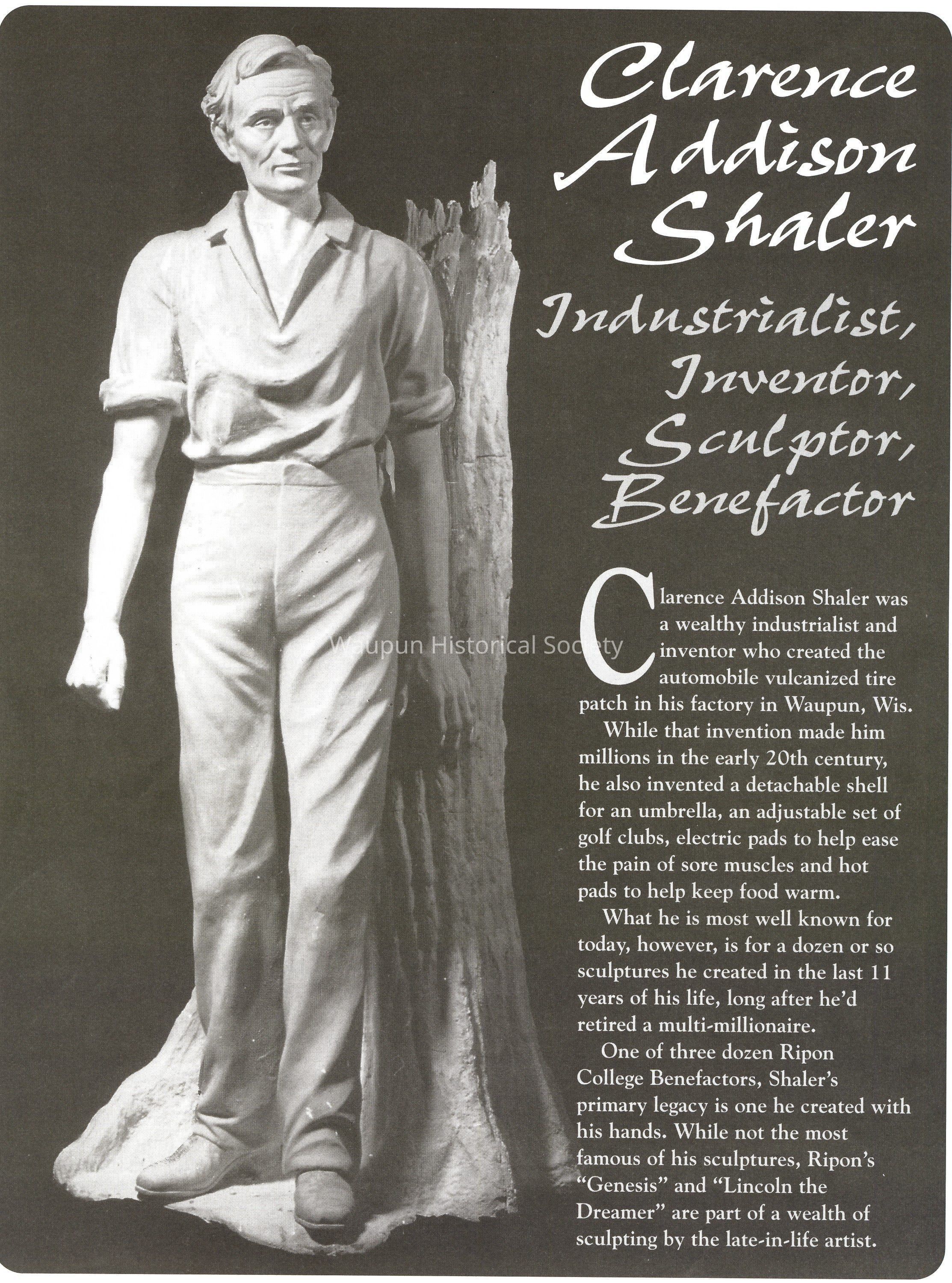 Clarence Addison Shaler was a creative genius who invented the vulcanized tire patch, an umbrella, a heating pad for people and the hot pad for food. His greatest legacy, however, might be the sculptures he left behind - both those he created after age 70, and those he purchased for the city of Waupun, Wis. Ripon College is proud to be home to two Shaler products - "Lincoln the Dreamer" and "Genesis." Here's a look at the man and his legacy.