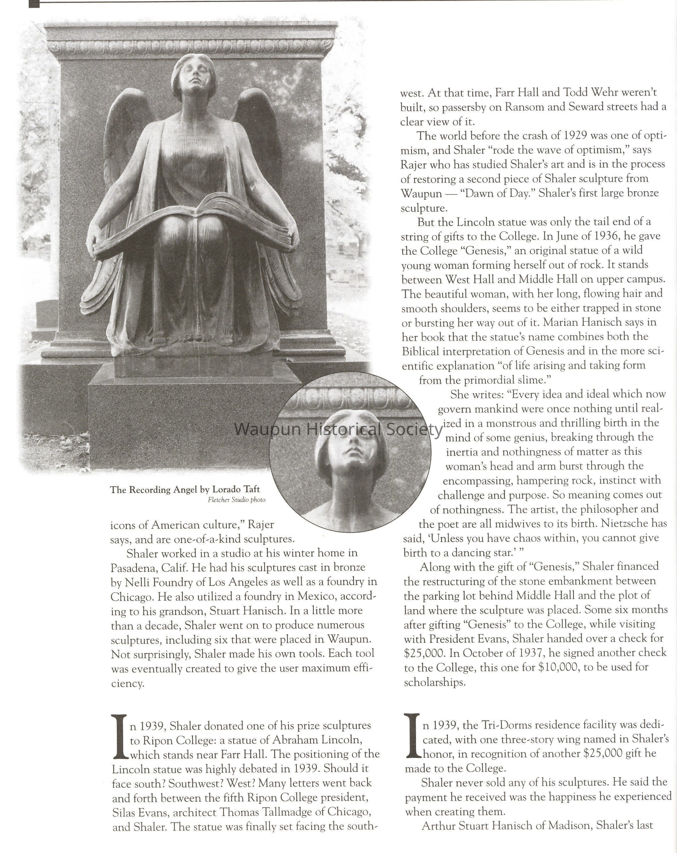 •"Recording Angel" - Shaler ordered this angel from his friend, sculptor Lorado Taft, in honor of his late wife. "Recording Angel" was presented as a gift to Waupun in 1923 and stands in Forest Mound Cemetery near the site of the "End of the Trail" sculpture. The sculpture was placed on the National Register of Historic Places in 1974 and, according to Rajer, would bring $1 million. Shaler is also buried near the sculpture.Acquisition