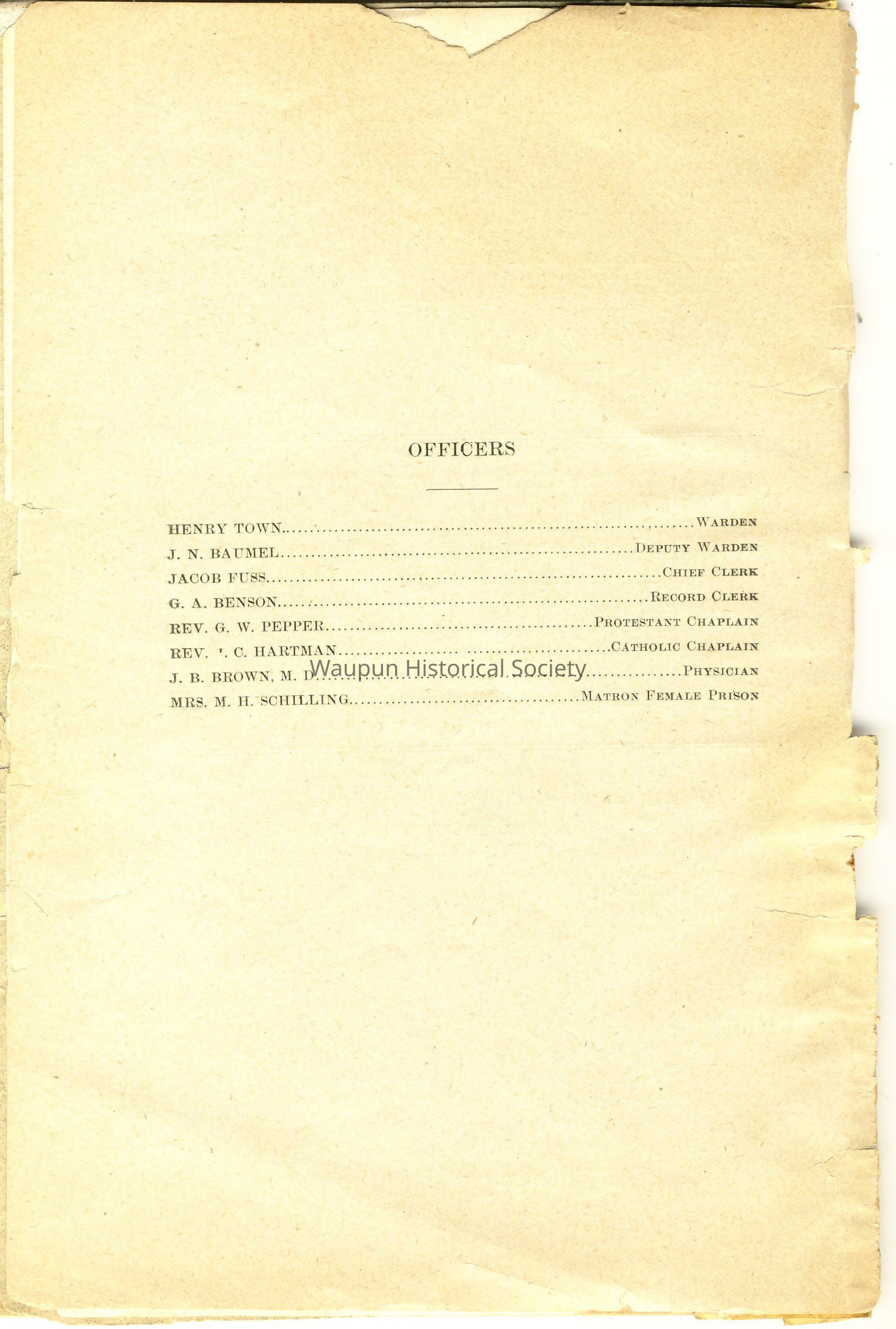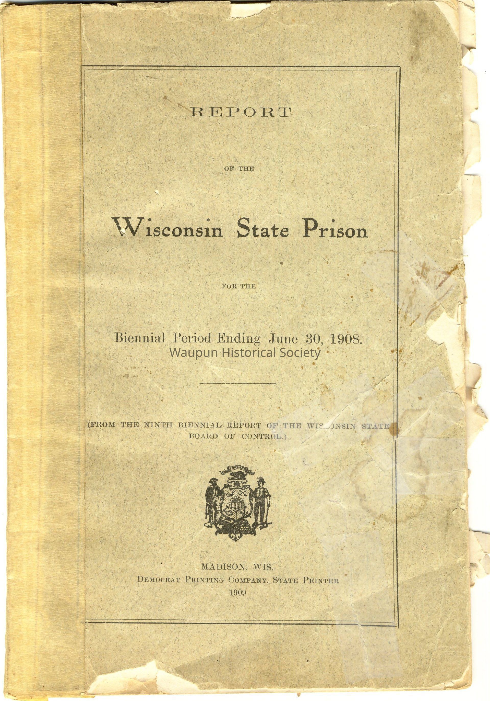 6 X 9 Tan booklet entitled: Report of the Wisconsin State Prison for the Biennial Period Ending June 30,1908. (From the Ninth Biennial Report of the Wisconsin State Board of Control), Madison, Wis. Democrat Printing Company, State Printer, 1909. It is very fragile; front cover is torn and inside pages are ripped, also. It is 20 pages in length.Acquisition
