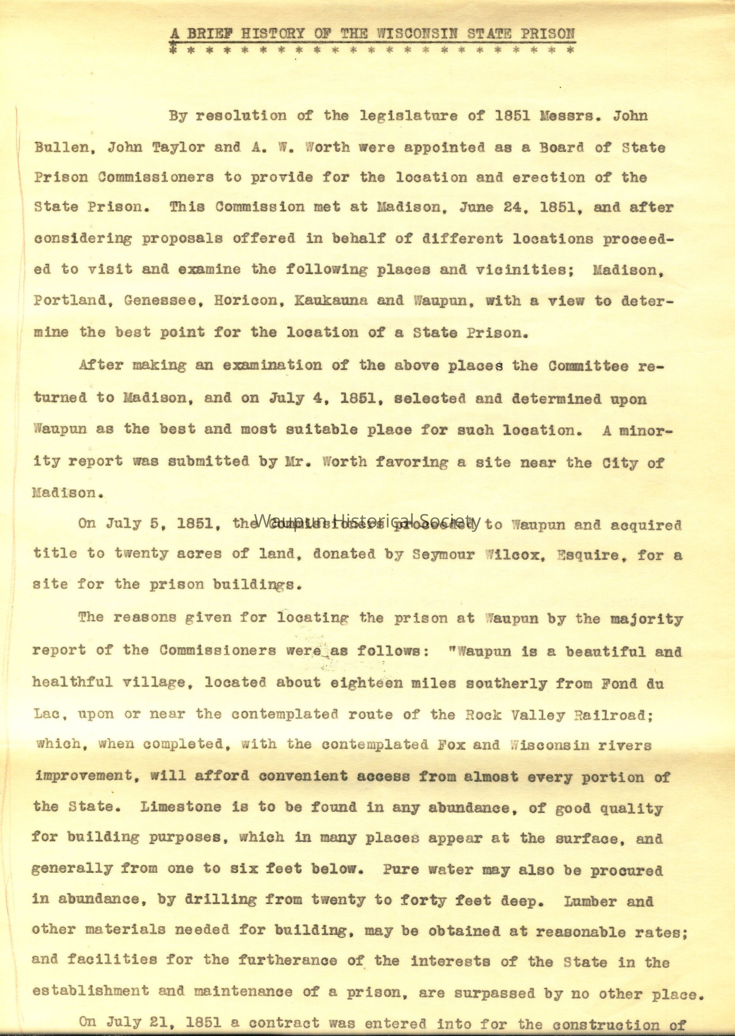 By resolution of the legislature of 1851 Messrs. John Bullen, John Taylor and A. W. Worth were appointed as a Board of State Prison Commissioners to provide for the location and erection of the State Prison. This Commission met at Madison, June 24, 1851, and after considering proposals offered in behalf of different locations proceeded to visit and examine the following places and vicinities; Madison, Portland, Genessee, Horicon, Kaukauna and Waupun, with a view to determine the best point for the location of a State Prison.