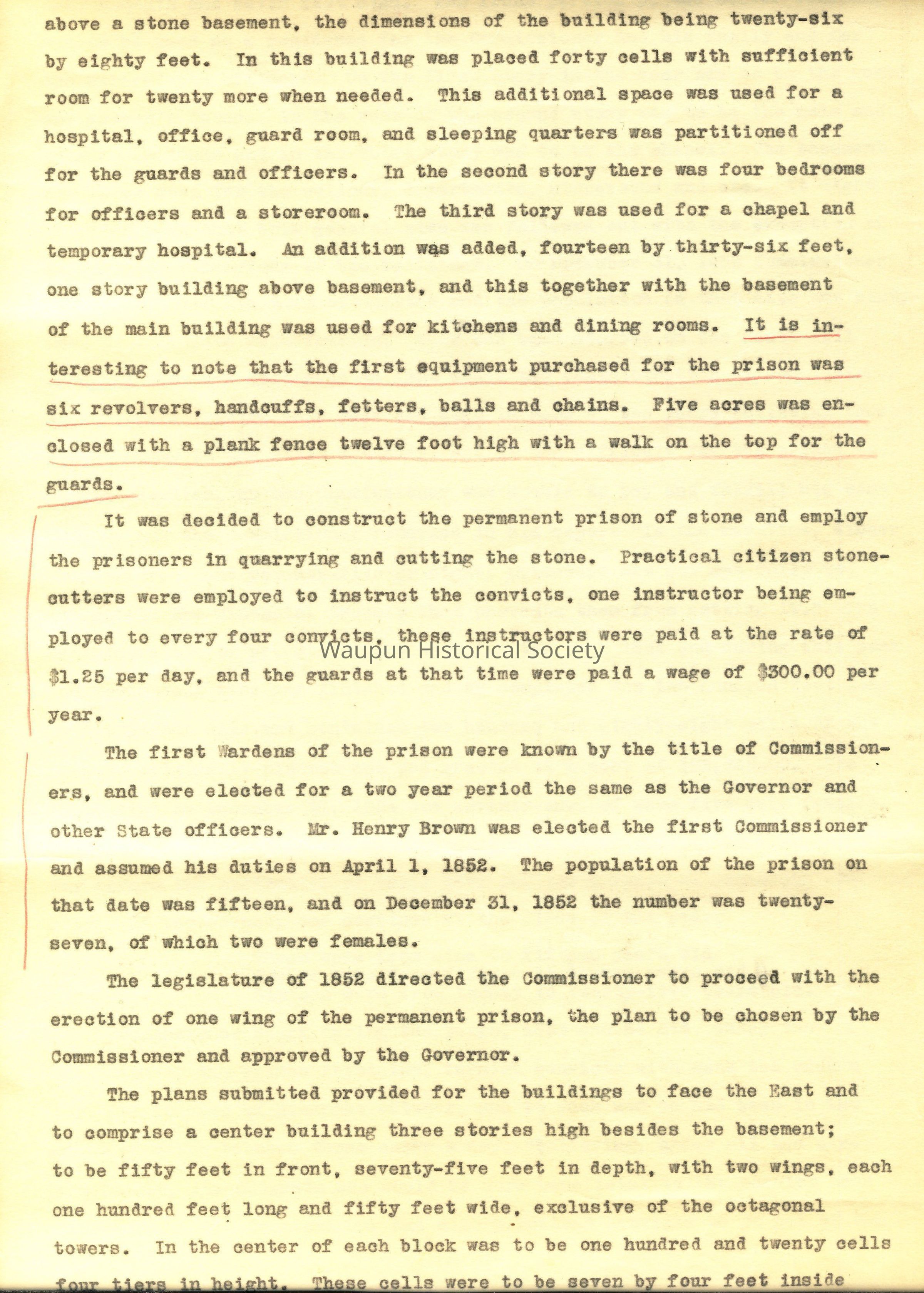 On July 5, 1851, the Commissioners proceeded to Waupun and acquired title to twenty acres of land, donated by Seymour Wilcox, esquire, for a site for the prison buildings.