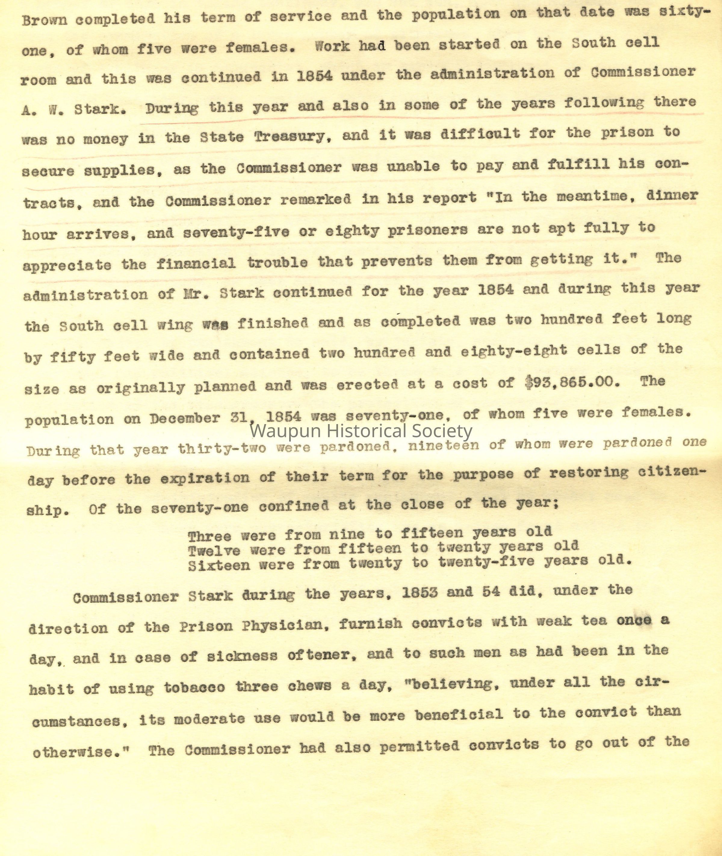 Brown completed his term of service and the population on that date was sixty-one, of whom five were females. Work had been started on the South cell room and this was continued in 1854 under the administration of Commissioner A. W. Stark. During this year and also in some of the years following there was no money in the State Treasury, and it was difficult for the prison to secure supplies, as the Commissioner was unable to pay and fulfill his contracts, and the Commissioner remarked in his report "In the meantime, dinner hour arrives, and seventy-five or eighty prisoners are not apt fully to appreciate the financial trouble that prevents them from getting it." The administration of Mr. Stark continued for the year 1854 and during this year the South cell wing was finished and as completed was two hundred feet long by fifty feet wide and contained two hundred and eighty-eight cells of the size as originally planned and was erected at a cost of $93,865.00. The population on December 31, 1854 was seventy-one, of whom five were females. During that year thirty-two were pardoned, nineteen of whom were pardoned one day before the expiration of their term for the purpose of restoring citizenship. Of the seventy-one confined at the close of the year; Three were from nine to fifteen years old; Twelve were from fifteen to twenty years old; Sixteen were from twenty to twenty-five years old.