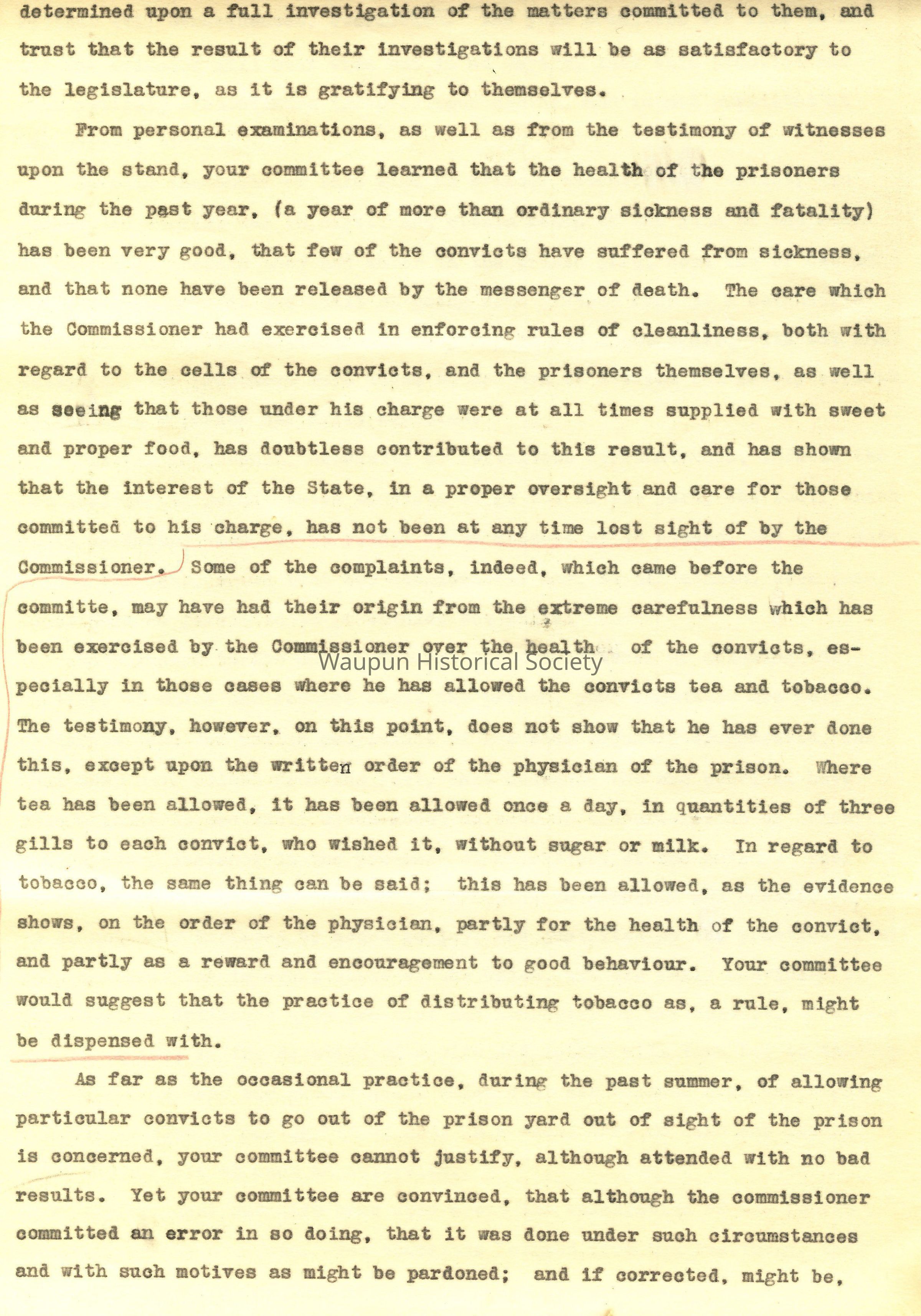 Commissioner Stark during the years, 1853 and 54 did, under the direction of the Prison Physician, furnish convicts with weak tea once a day, and in case of sickness oftener, and to such men as had been in the habit of using tobacco three chews a day, "believing, under all the circumstances, its moderate use would be more beneficial to the convict than otherwise." The Commissioner had also permitted convicts to go out of the prison enclosure to obtain water and do other errands, and on the fourth of July ministers and citizens of Waupun were permitted to come to the prison and the prisoners enjoyed a day of recreation. These matters were made a subject of inquiry by a special Committee by the legislature.