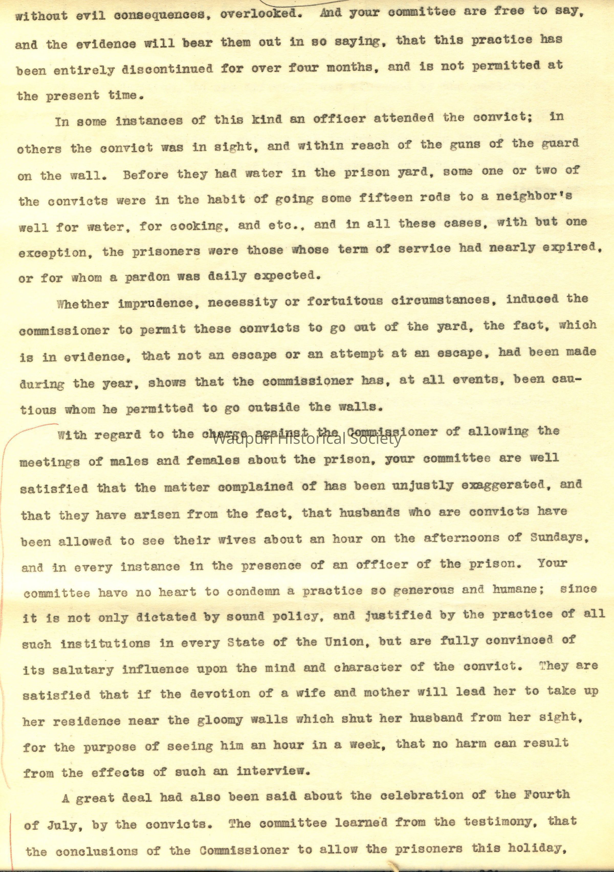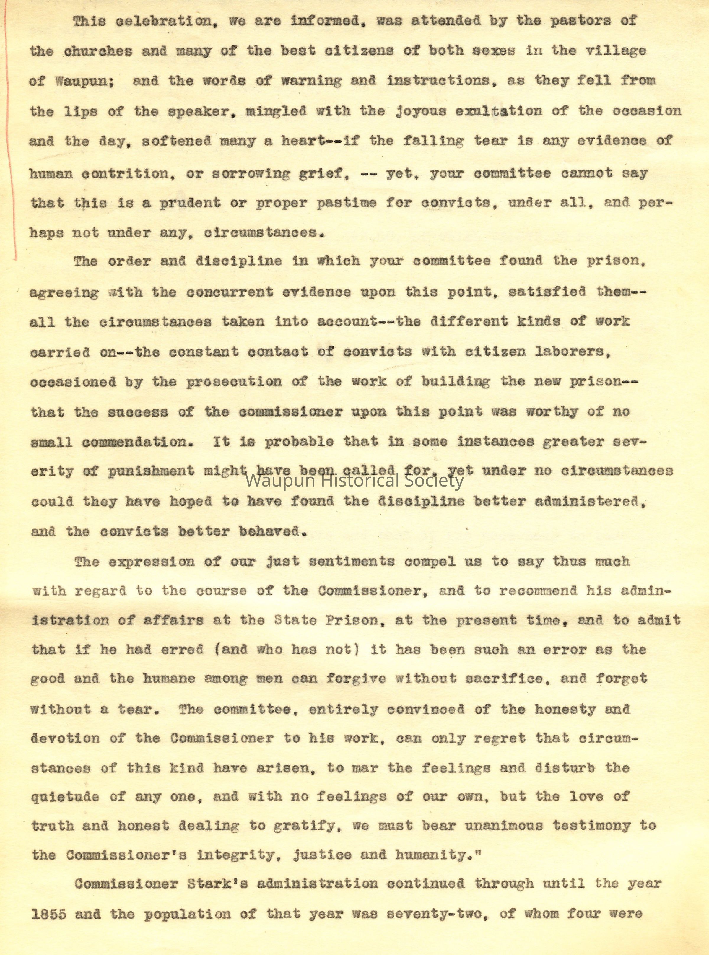 This celebration, we are informed, was attended by the pastors of the churches and many of the best citizens of both sexes in the village of Waupun; and the words of warning and instructions, as they fell from the lips of the speaker, mingled with the joyous exultation of the occasion and the day, softened many a heart--if the falling tear is any evidence of human contrition, or sorrowing grief, -- yet, your committee cannot say that this is a prudent or proper pastime for convicts, under all, and perhaps not under any, circumstances.