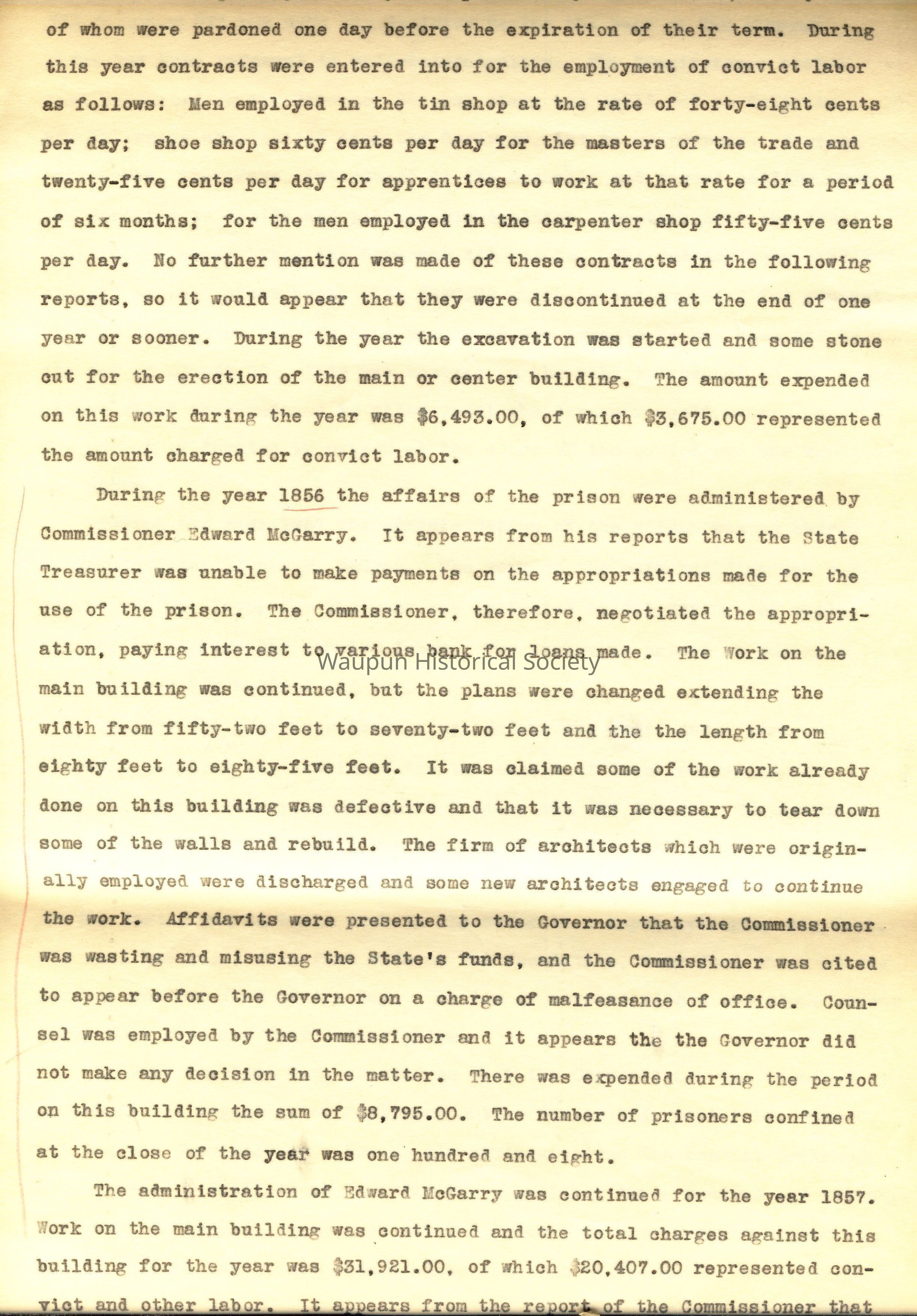 During the year 1856 the affairs of the prison were administered, by Commissioner Edward McGarry. It appears from his reports that the State Treasurer was unable to make payments on the appropriations made for the use of the prison. The Commissioner, therefore, negotiated the appropriation, paying interest to various bank for loans made. The York on the main building was continued, but the plans were changed extending the width from fifty-two feet to seventy-two feet and the the length from eighty feet to eighty-five feet. It was claimed some of the work already done on this building was defective and that it was necessary to tear down some of the walls and rebuild. The firm of architects which were originally employed were discharged and some new architects engaged to continue the work. Affidavits were presented to the Governor that the Commissioner was wasting and misusing the State's funds, and the Commissioner was cited to appear before the Governor on a charge of malfeasance of office. Counsel was employed by the Commissioner and it appears the the Governor did not make any decision in the matter. There was expended during the period on this building the sum of )8,795.00. The number of prisoners confined at the close of the year was one hundred and eight.