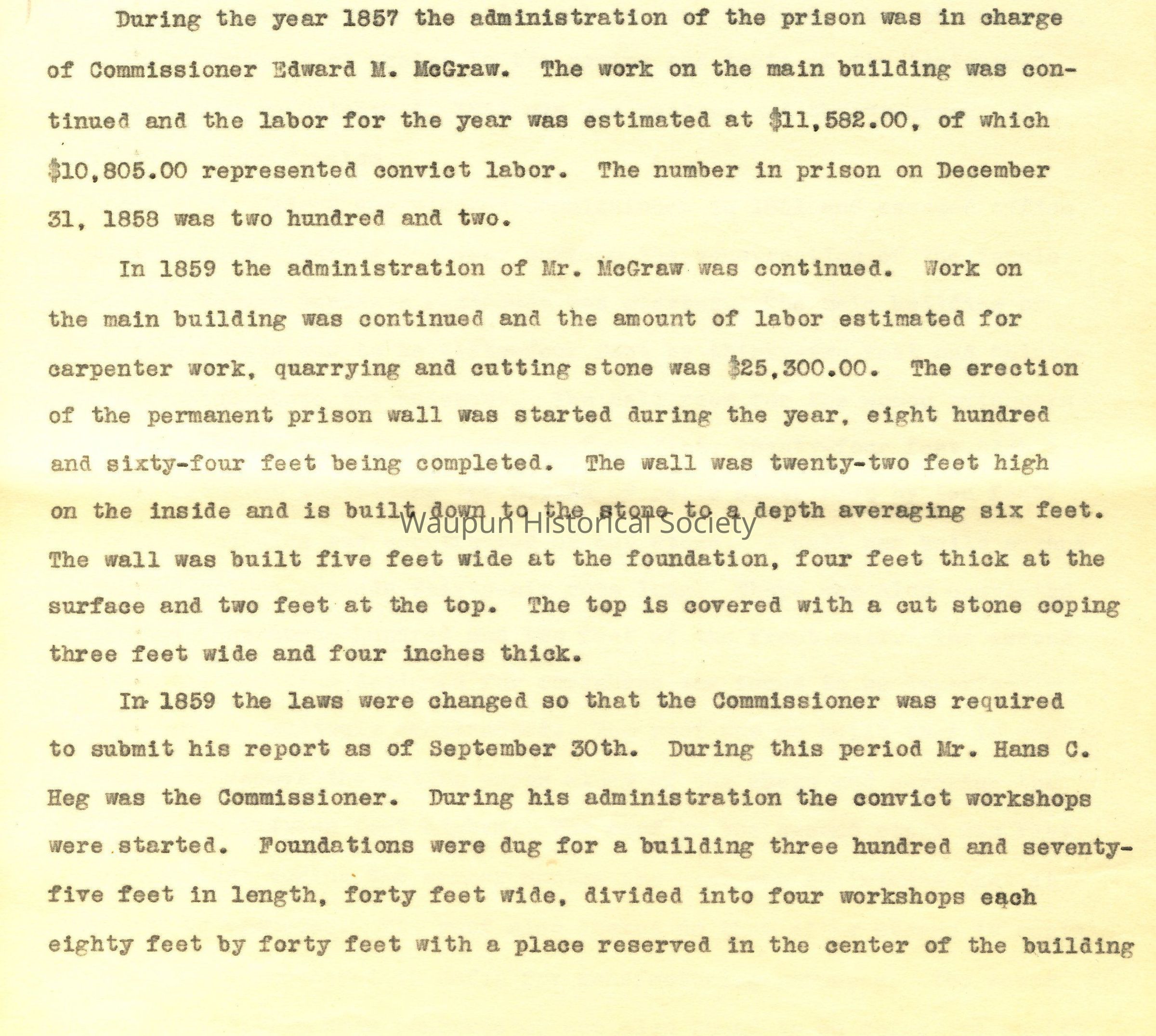 During the year 1857 the administration of the prison was in charge of Commissioner Edward M. McGraw. The work on the main building was continued and the labor for the year was estimated at $11,582.00, of which $10,805.00 represented convict labor. The number in prison on December 31, 1858 was two hundred and two.