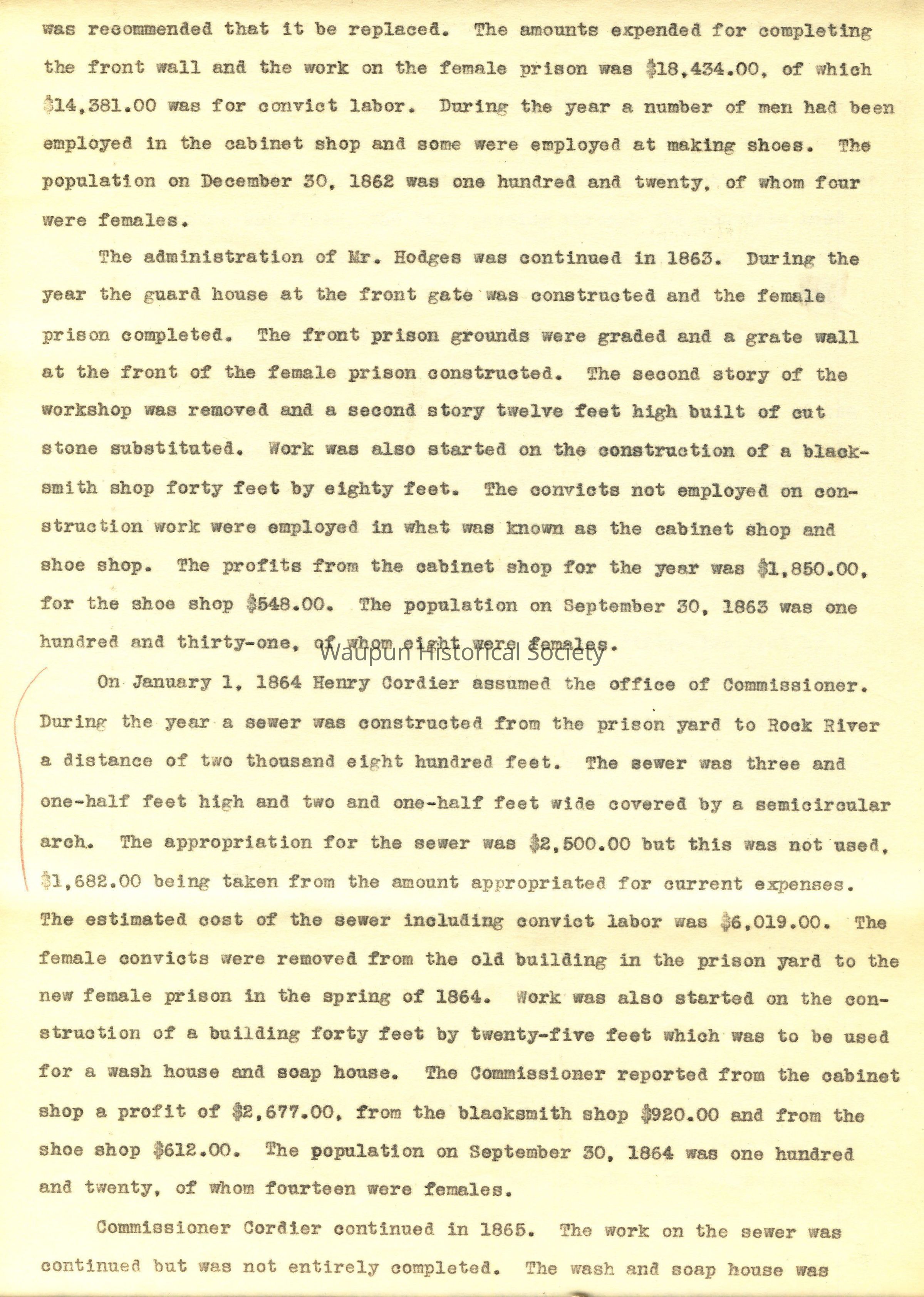 On January 1, 1864 Henry Cordier assumed the office of Commissioner. During the year a sewer was constructed from the prison yard to Rock River a distance of two thousand eight hundred feet. The sewer was three and one-half feet high and two and one-half feet wide covered by a semicircular arch. The appropriation for the sewer was $2,500.00 but this was not used, $1,682.00 being taken from the amount appropriated for current expenses. The estimated cost of the sewer including convict labor was $6,019.00. The female convicts were removed from the old building in the prison yard to the new female prison in the spring of 1864. Work was also started on the construction of a building forty feet by twenty-five feet which was to be used for a wash house and soap house. The Commissioner reported from the cabinet shop a profit of $2,677.00, from the blacksmith shop $920.00 and from the shoe shop $612.00. The population on September 30, 1864 was one hundred and twenty, of whom fourteen were females.